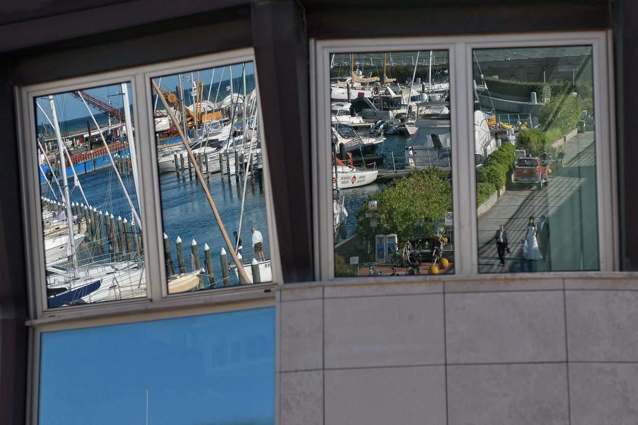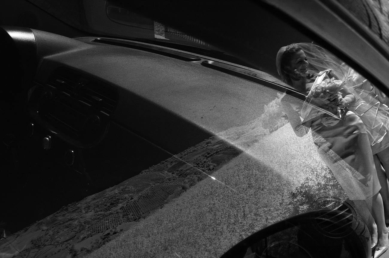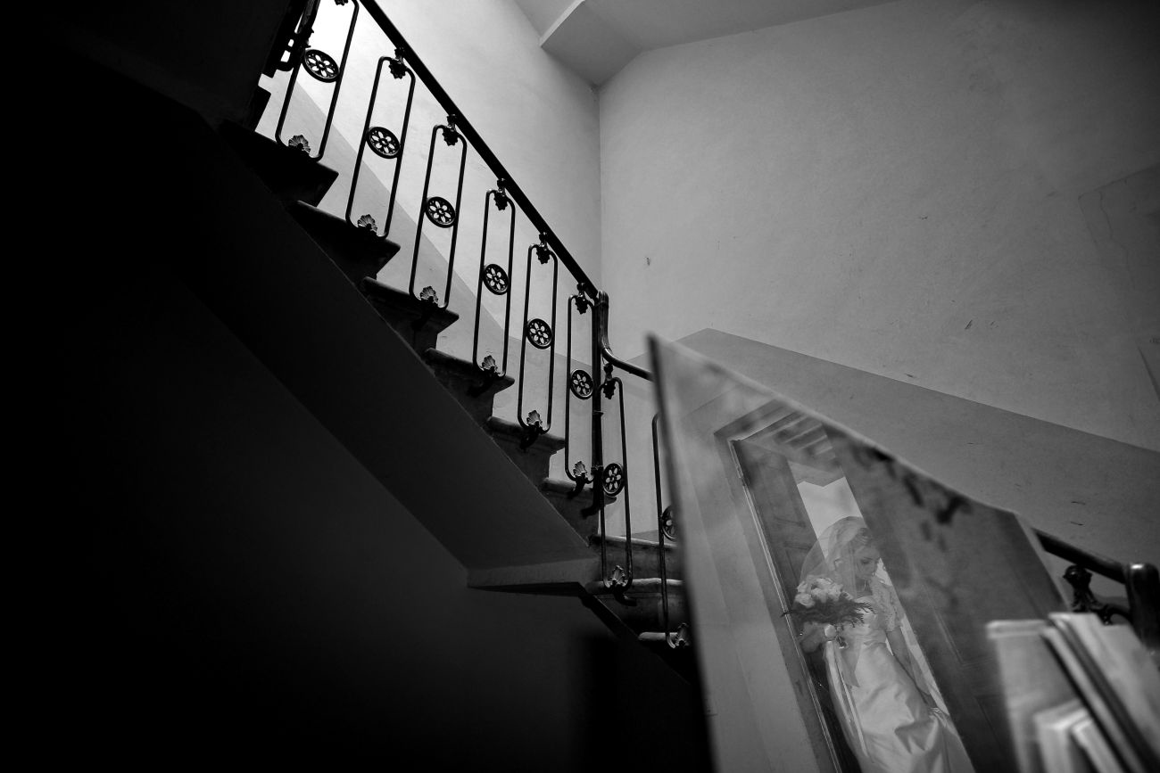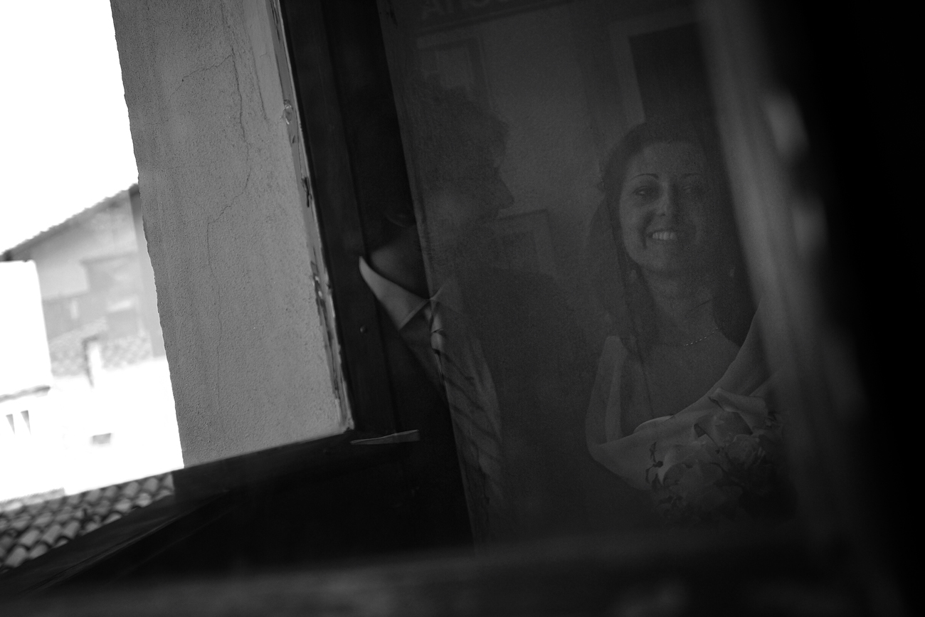 Mettendo da parte una falsa modestia, ci sono una serie di scatti che sento mi appartengono e che in qualche modo identificano la mia Fotografia in particolare applicata all’evento matrimonio. Me lo ha fatto notare uno dei miei collaboratori con cui stavo lavorando ieri sera. Mentre stavamo guardando le foto del matrimonio appena scaricate sul portatile mi fa presente come nei miei scatti ci sia una continua ricerca del riflesso, del filtrare il soggetto attraverso il suo speculare. Ed è assolutamente vero e questa cosa va ormai avanti da anni, prima voluta, cercata, adesso istintiva, naturale al punto che mi meraviglio quando me lo fanno notare. Forse c’è, in questo, solo il riflesso, appunto, di una vena narcisistica derivante dal mito del dio greco oppure può essere una ricerca vana della verità: sia l’immagine ripresa direttamente che la stessa riflessa hanno uguale valore, in entrambi i casi sono delle repliche, dei falsi di un solo vero.