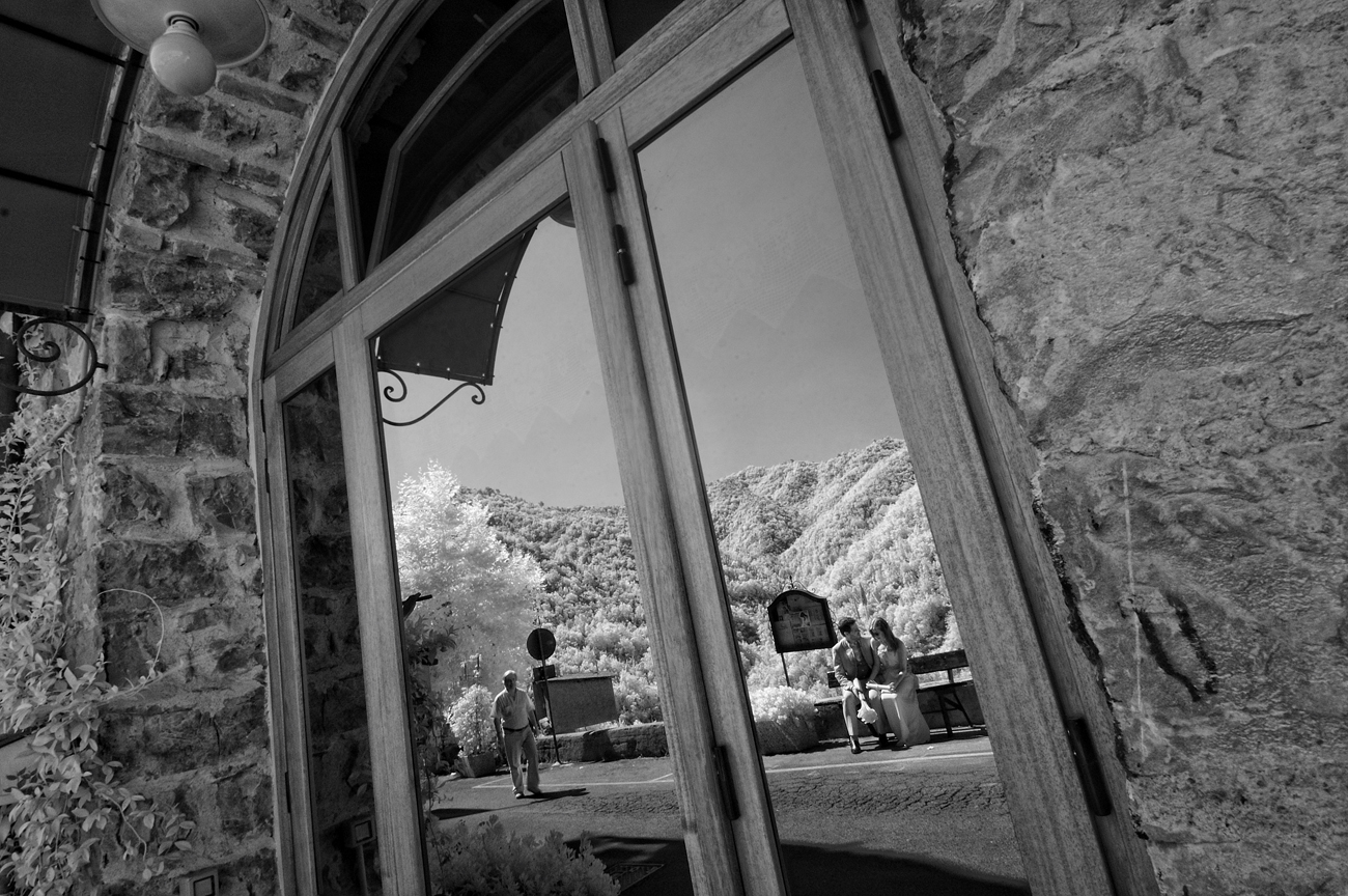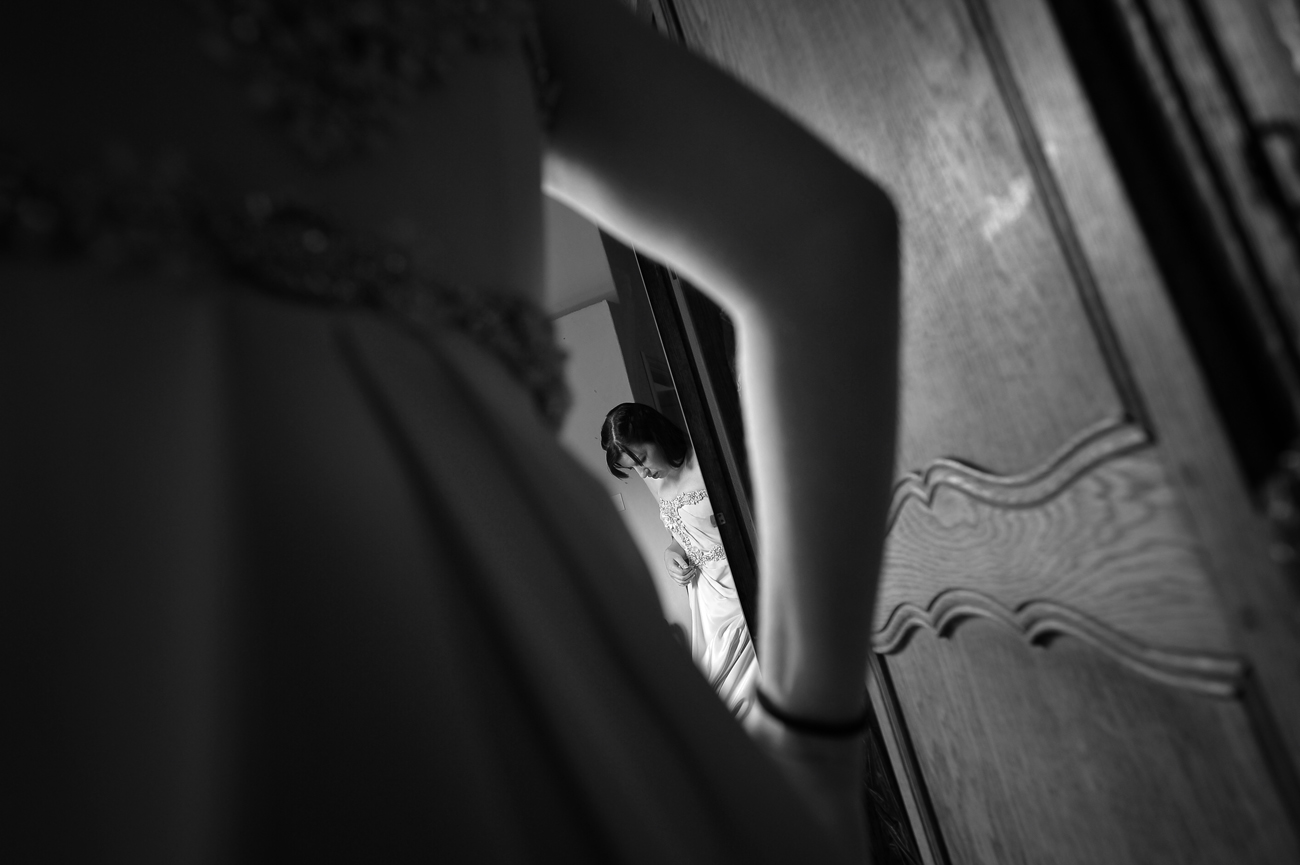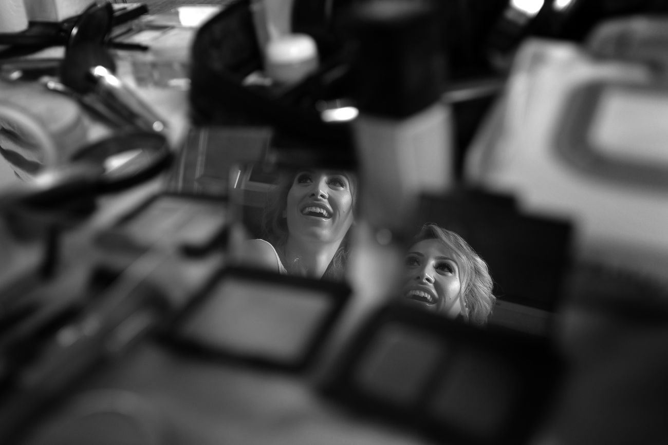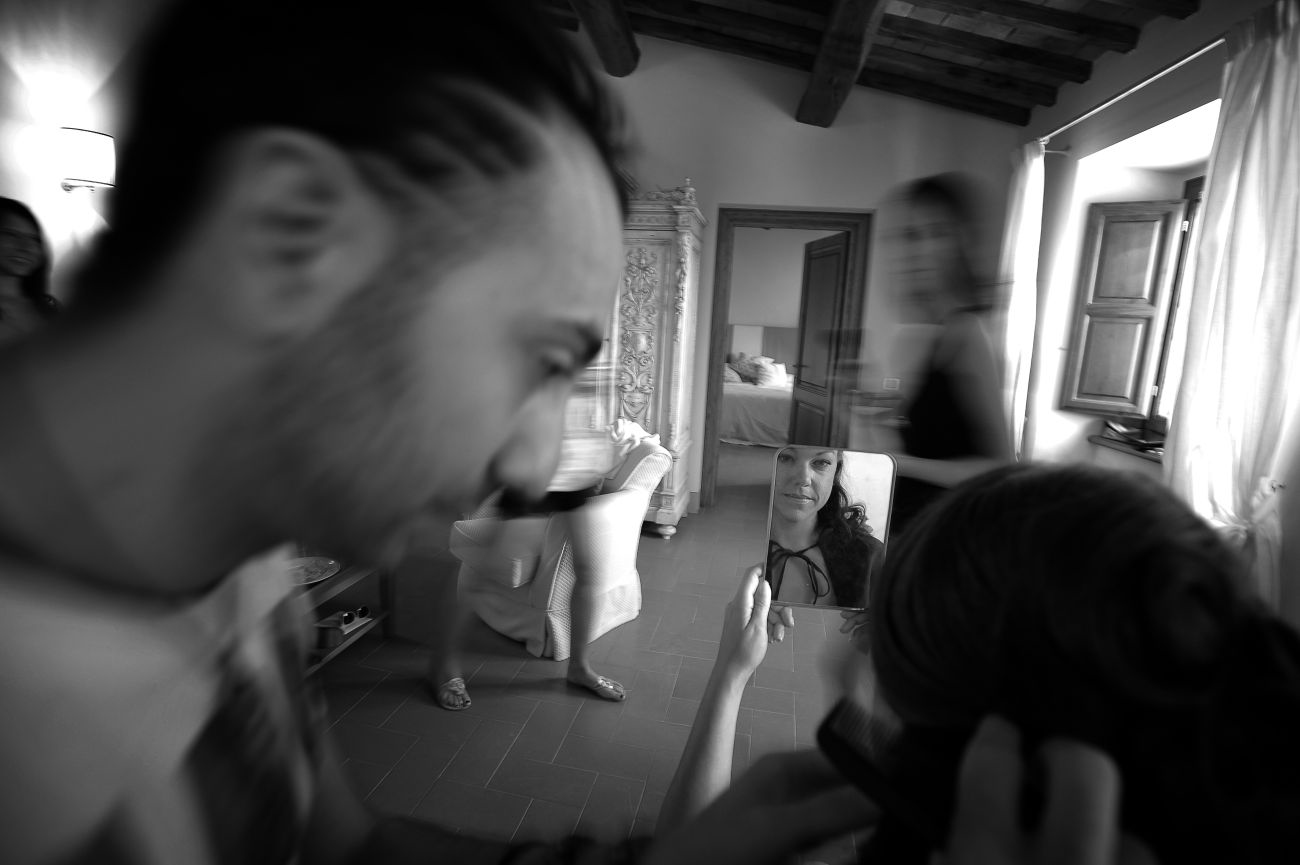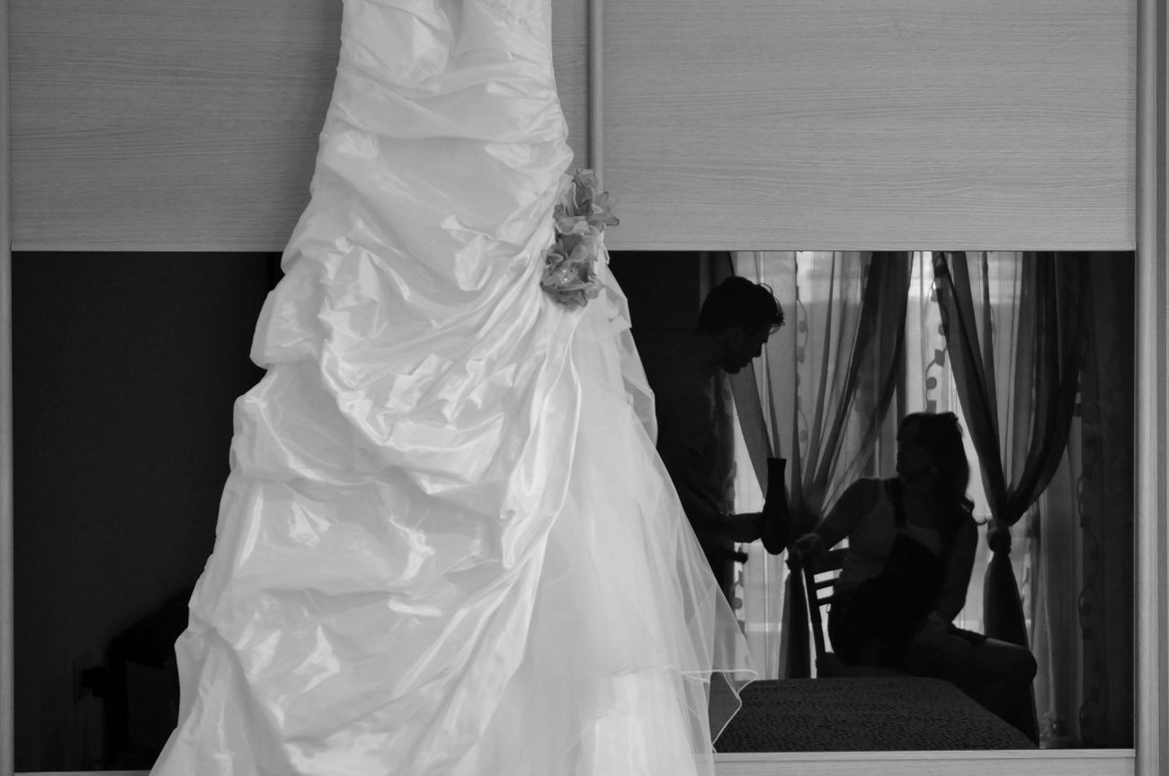 Mettendo da parte una falsa modestia, ci sono una serie di scatti che sento mi appartengono e che in qualche modo identificano la mia Fotografia in particolare applicata all’evento matrimonio. Me lo ha fatto notare uno dei miei collaboratori con cui stavo lavorando ieri sera. Mentre stavamo guardando le foto del matrimonio appena scaricate sul portatile mi fa presente come nei miei scatti ci sia una continua ricerca del riflesso, del filtrare il soggetto attraverso il suo speculare. Ed è assolutamente vero e questa cosa va ormai avanti da anni, prima voluta, cercata, adesso istintiva, naturale al punto che mi meraviglio quando me lo fanno notare. Forse c’è, in questo, solo il riflesso, appunto, di una vena narcisistica derivante dal mito del dio greco oppure può essere una ricerca vana della verità: sia l’immagine ripresa direttamente che la stessa riflessa hanno uguale valore, in entrambi i casi sono delle repliche, dei falsi di un solo vero.