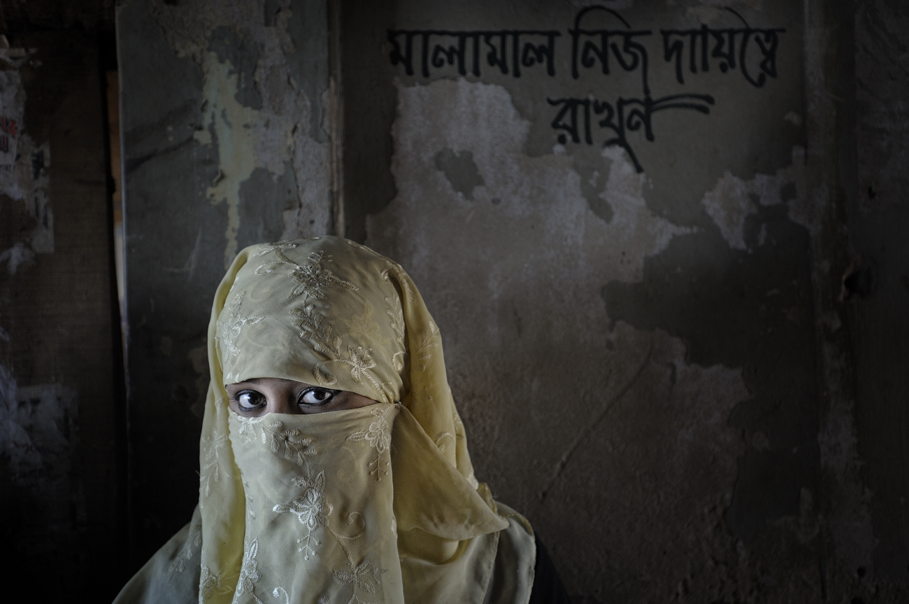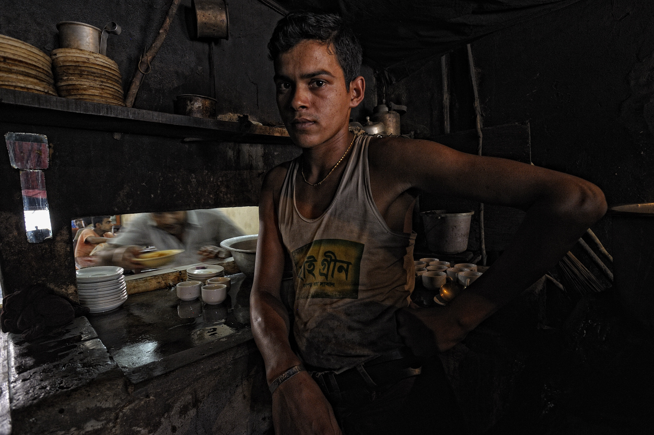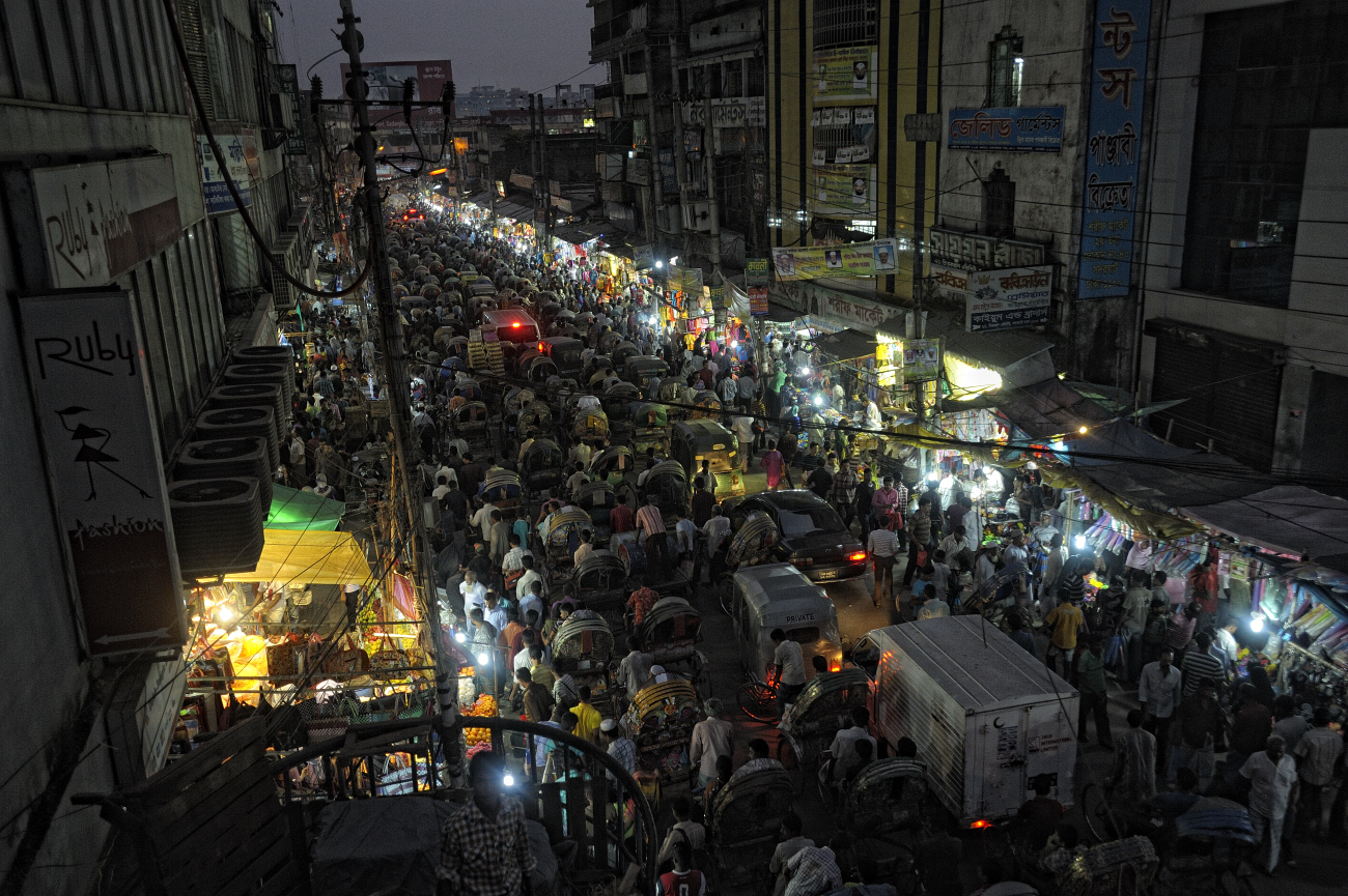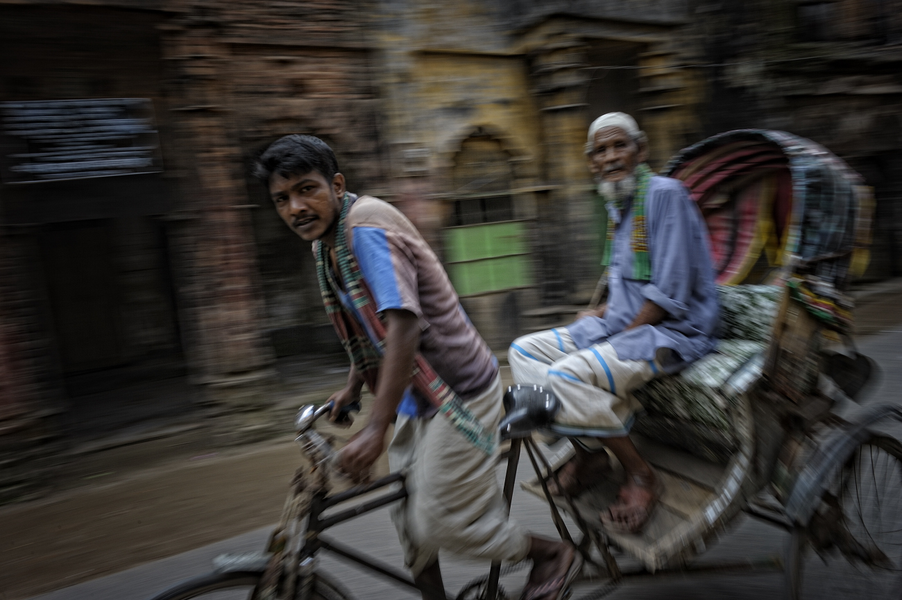 Proprio così. Sarà un caso. I miei pregiudizi iniziano però a incrinarsi. Riaz, la nostra guida che ci accoglie con un sorriso, mi chiede se vogliamo andare in albergo, forse siamo stanchi dopo 12 ore di viaggio. Sono da poco passate le 3 del pomeriggio, ancora un paio d’ore di luce quelle più belle, perché sprecarle. Niente albergo, ma un giro in città. Beh credevo, dopo essere stato a Saigon, che non avrei trovato una città più caotica, Dakha lo è. Mai vista una concentrazione di macchine, risciò, tuc tuc, autobus e gente in una tale densità, folle, inimmaginabile. Gli spazi in cui muoversi sembrano doversi letteralmente conquistare senza alcun rispetto e regole o almeno così a me sembra. In realtà devono avere un modo di guidare dove gli spostamenti, le precedenze, i sorpassi hanno un loro, seppur a me ancora sconosciuto, perché. Dosando in modo poco ortodosso l’uso del clacson e dei fari, coadiuvati da una sorta di copilota che si sporge dagli autobus per segnalare improbabili cambi di corsia ecco che questo immenso fiume di uomini e mezzi si muove, sembra impossibile, ma procede con un incedere regolare, continuo. Troppo lento però, avanziamo a passo d’uomo e il tentativo di raggiungere il porto prima del buio si spegne miseramente. Decidiamo quindi di scendere dal nostro bus e ‘rompere il ghiaccio’ con l’ambiente e soprattutto con la fotografia. Si parte. Non ci sono parole per descrivere la confusione in cui ci immergiamo, ma la gente è friendly, gentile. Gli sguardi non sono per niente ostili, tutt’altro. Ancora un po’ frastornato dal viaggio, sempre timoroso dalle possibili reazioni della gente, con la paura di perdersi inizio a scattare. Ancora caldo della vittoria al National Geographic Contest con quel mosso controllato, colgo l’occasione per lavorare con tempi lenti, la circostanza sembra adatta. Gli altri mi seguono: il workshop ha inizio.