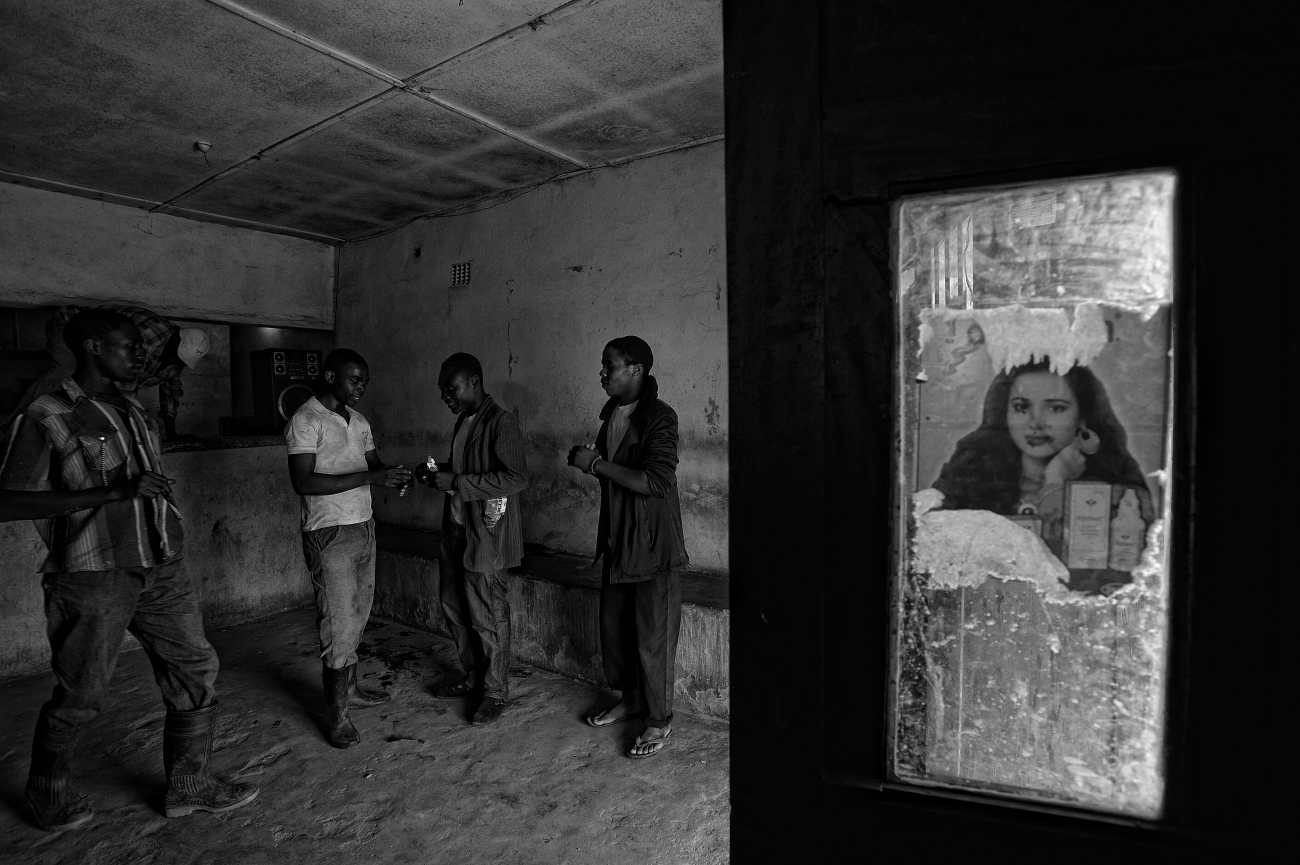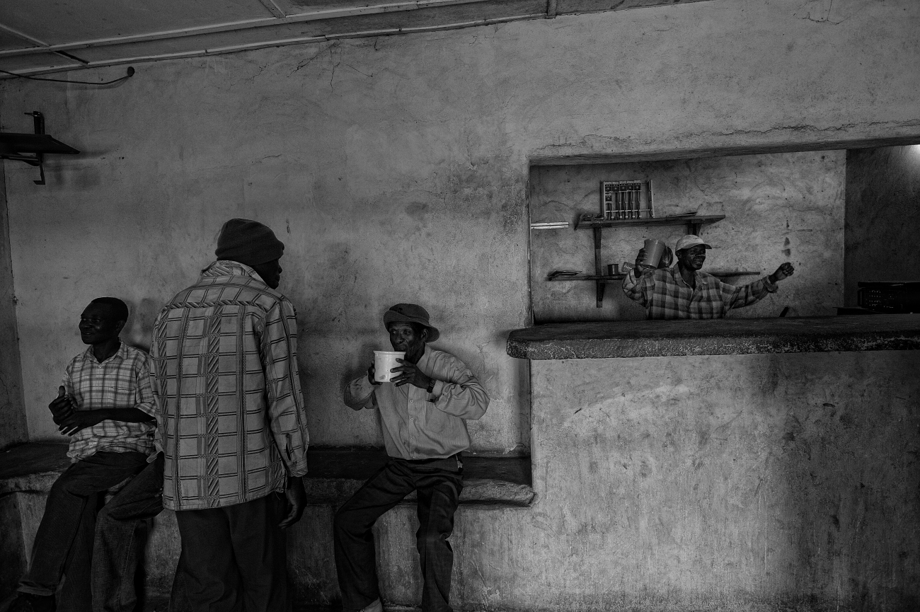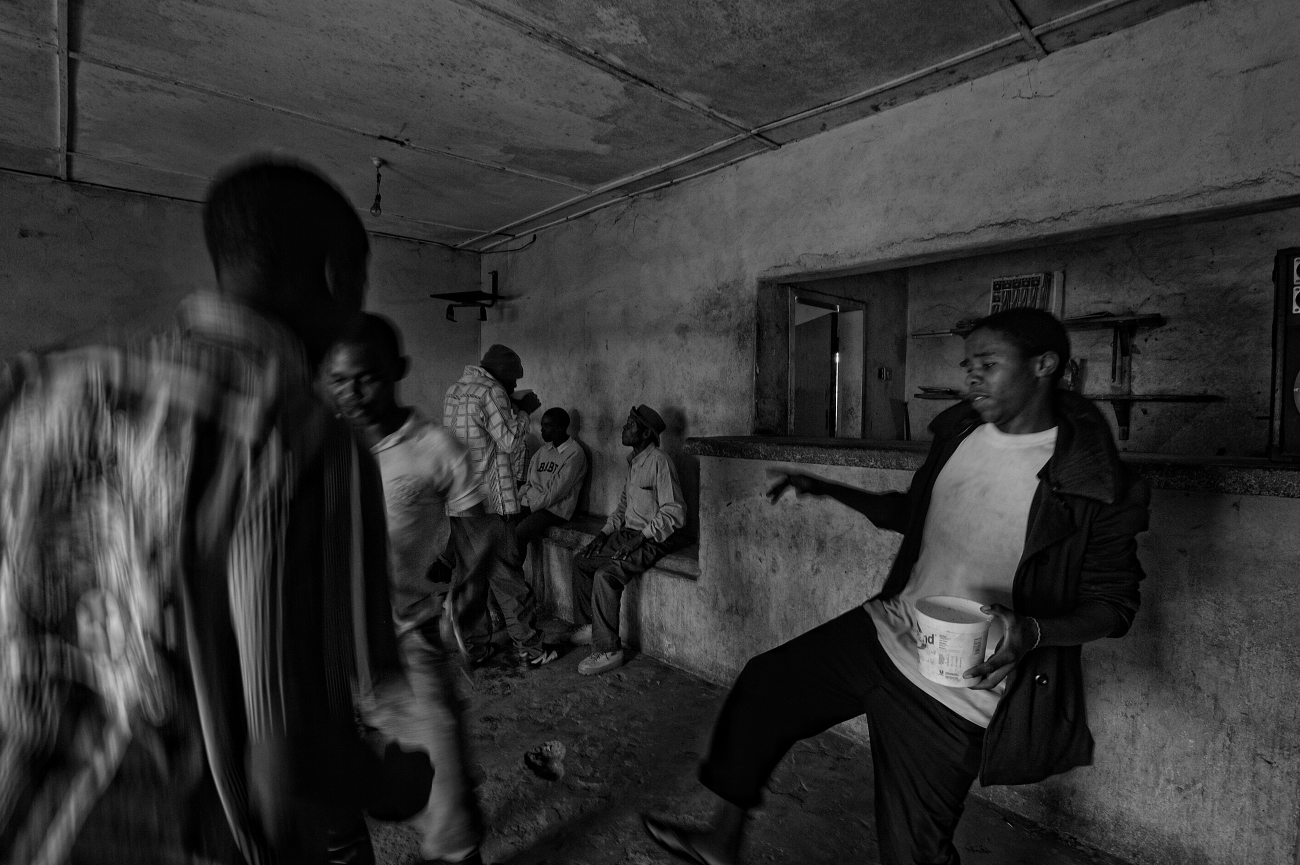 Mentre la farina mista ad acqua s’indora, una decina di uomini si muovono ubriachi al ritmo di una assordante musica congolese in un improbabile restaurant senza tavoli. Stanno bevendo un liquido biancastro ottenuto dalla fermentazione del mais; la voce impastata, il deambulare precario misto a un acre odore di alcol non lascia alcun dubbio sulla quantità di tale bevanda circolante nel loro sangue. Gli scatti si susseguono e fermano attimi, momenti, sensazioni, sudore, ragazzi persi in un drammatico ripetersi quotidiano riservato agli uomini dove la sola presenza femminile sta nella foto strappata di una locandina pubblicitaria all’ingresso del locale. Sono le 10,25 del mattino.