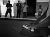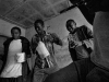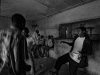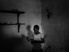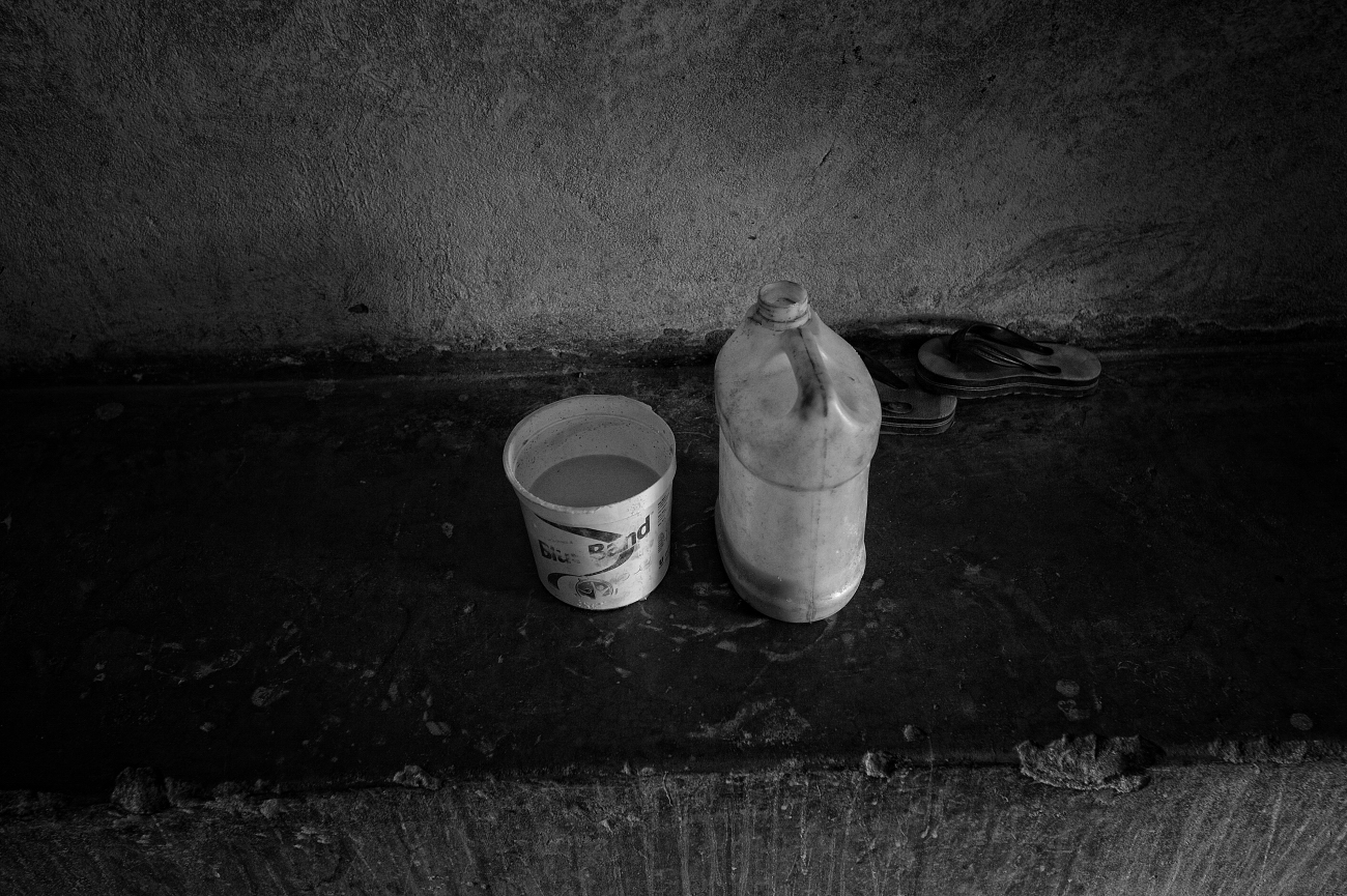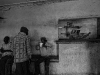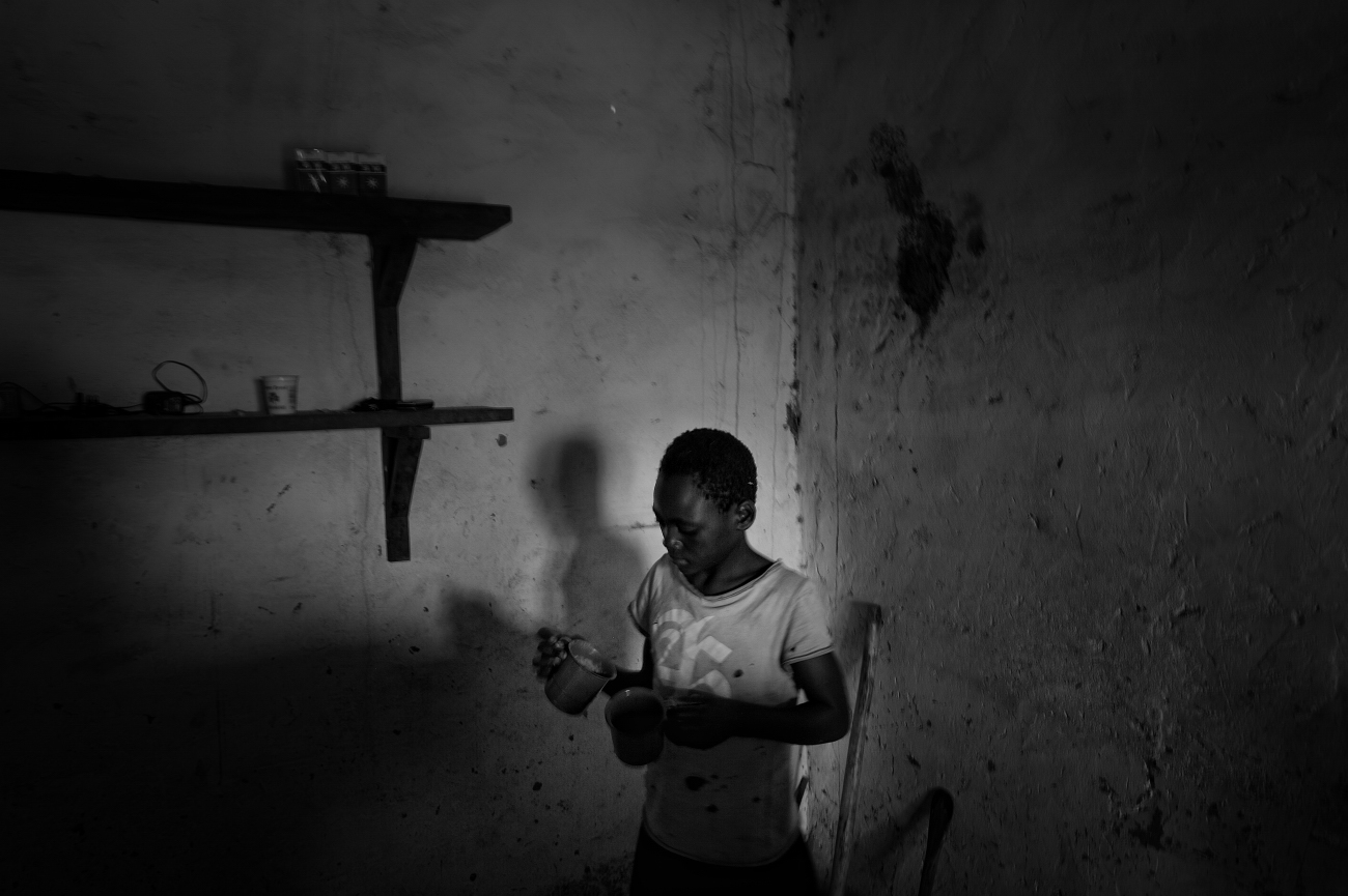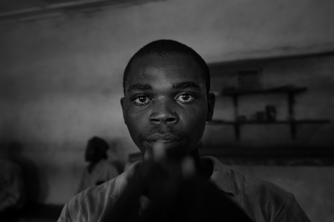 Mentre la farina mista ad acqua s’indora, una decina di uomini si muovono ubriachi al ritmo di una assordante musica congolese in un improbabile restaurant senza tavoli. Stanno bevendo un liquido biancastro ottenuto dalla fermentazione del mais; la voce impastata, il deambulare precario misto a un acre odore di alcol non lascia alcun dubbio sulla quantità di tale bevanda circolante nel loro sangue. Gli scatti si susseguono e fermano attimi, momenti, sensazioni, sudore, ragazzi persi in un drammatico ripetersi quotidiano riservato agli uomini dove la sola presenza femminile sta nella foto strappata di una locandina pubblicitaria all’ingresso del locale. Sono le 10,25 del mattino.