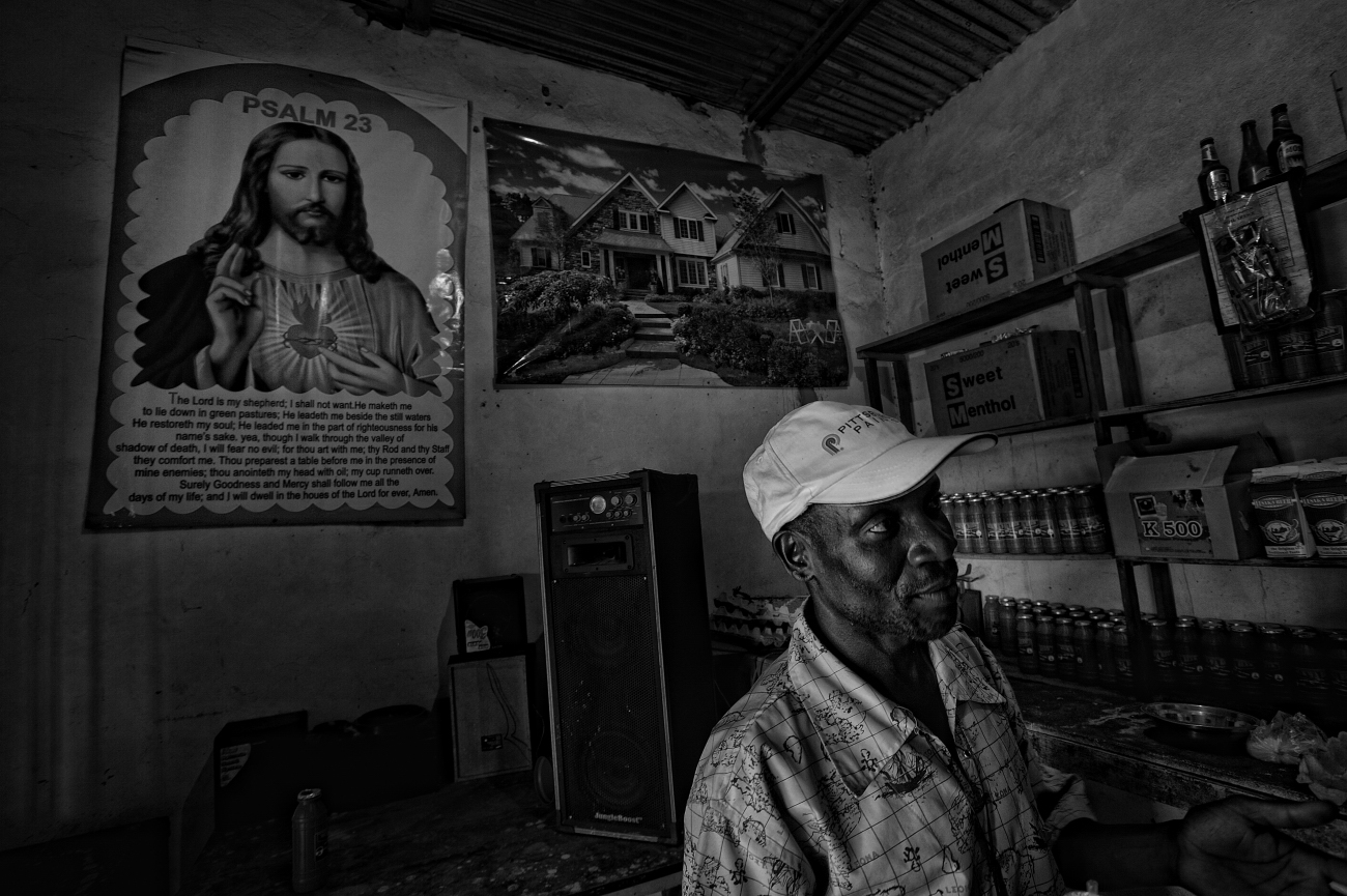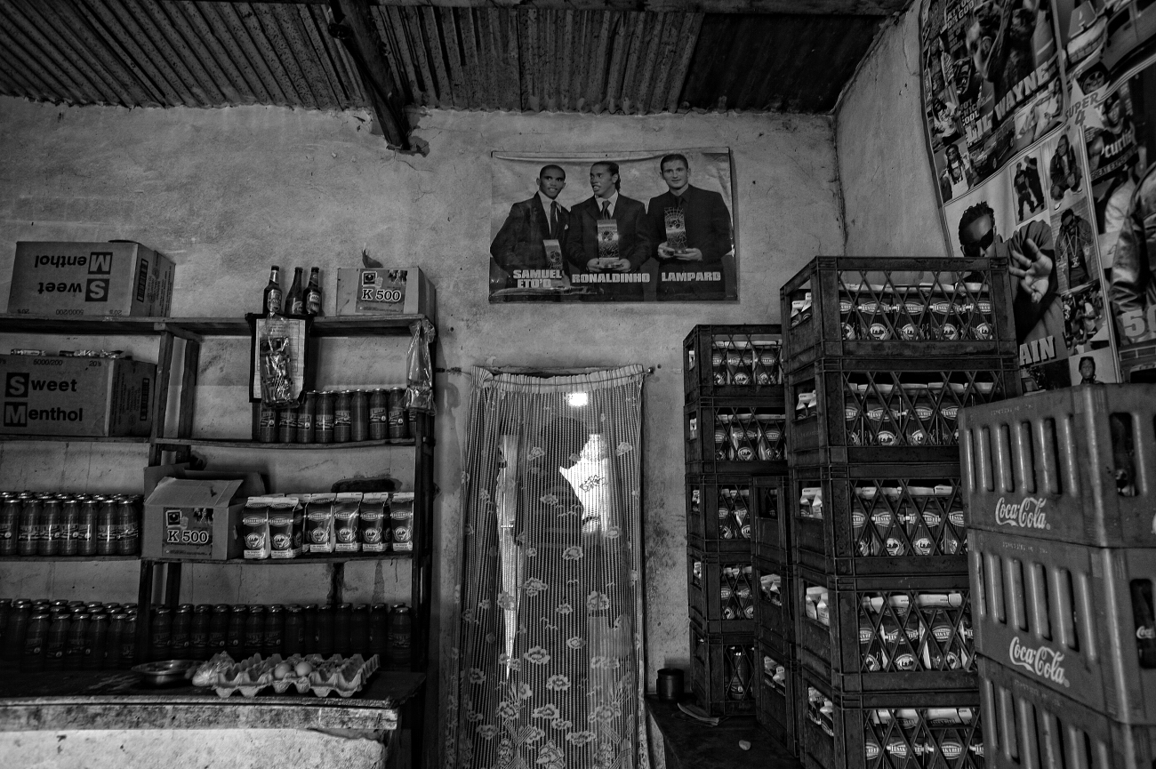 Il negozio del paese ha già aperto i battenti ma una donna, forse la moglie del proprietario, è ancora nel retrobottega che si aggiusta il vestito. Casse di bottiglie tra birra e Coca Cola è la merce esposta al suo interno. Il salmo 23 che didascalizza un poster con un’immagine stereotipata del Cristo e la stampa di alcune villette a schiera si contrappone ai poster di 3 mostri sacri del calcio moderno e di alcuni rappers afroamericani. Tutto è così assurdamente lontano dal mio mondo, ma proprio per questo curiosamente affascinante. Sono le 10,55 del mattino.