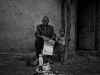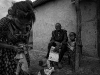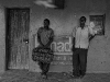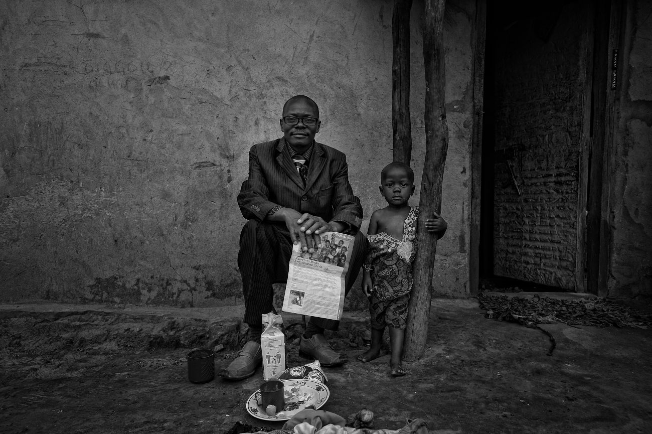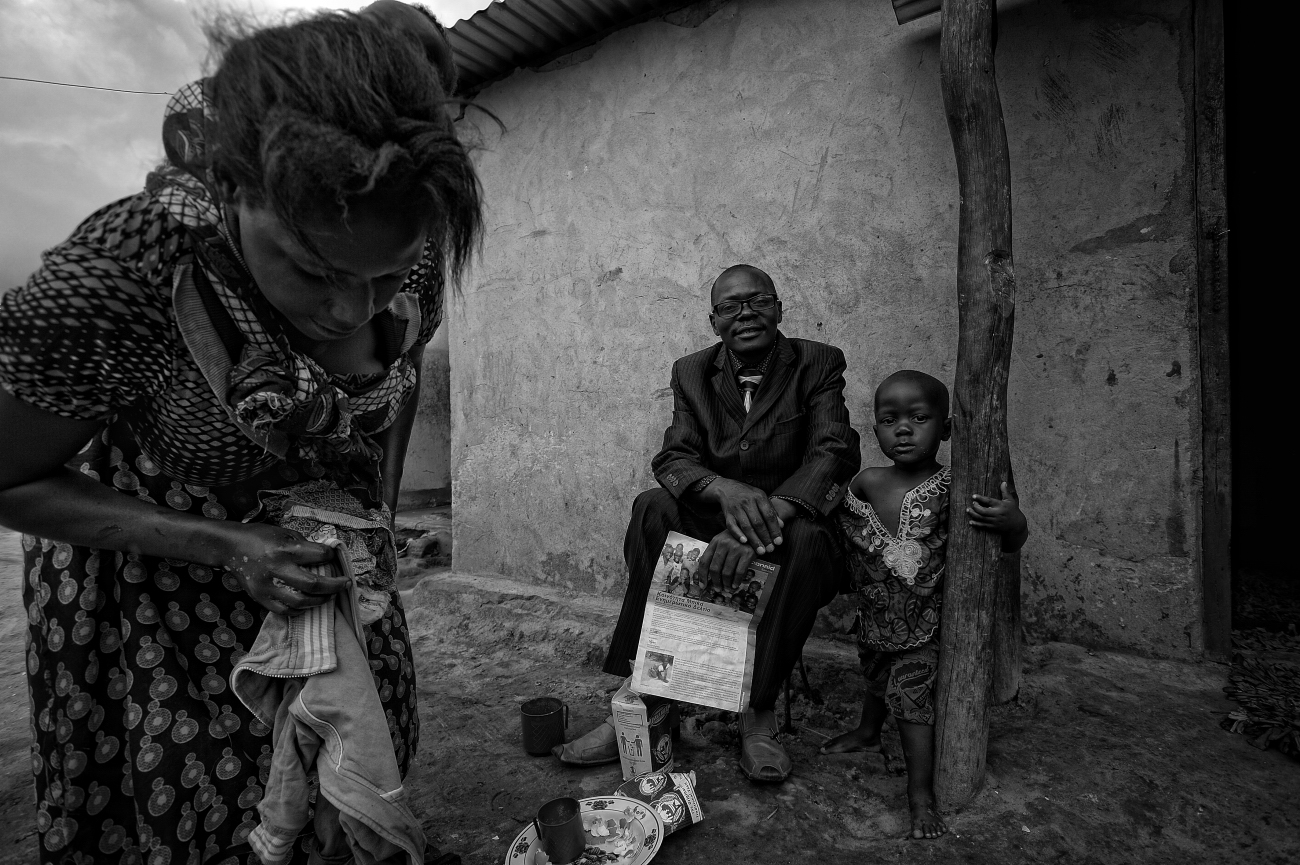 Occhiale, abito scuro, camicia bianca, cravatta multicolore, scarpe a punta seduto davanti all’ingresso di casa intento a leggere alcune pagine strappate da una rivista patinata. Una visione totalmente disconnessa dalla fatiscenza dell’ambiente in totale contrapposizione con il vestitino del figlio e con il lavorare della donna che invece denotano l’essere in un paese africano. Sono le 11,10 del mattino.