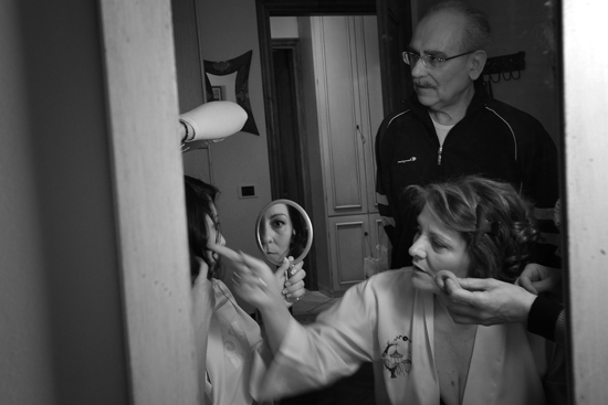 Sabato mattina, sveglia all’alba e partenza verso casa della sposa. Mi aspetta una giornata campale – quando nei miei workshop faccio un parallelo tra il fotografo di guerra e quello di matrimonio talvolta non è solamente una provocazione – pranzo e cena con relativi balli, insomma 15 ore di fotografia senza soluzione di continuità. Dopo poco che ho iniziato a scattare arriva il videografo. In genere preferisco ‘lavorare’ con chi conosco perché è importante per entrambi essere in sintonia onde evitare incomprensioni nelle modalità di esecuzione.