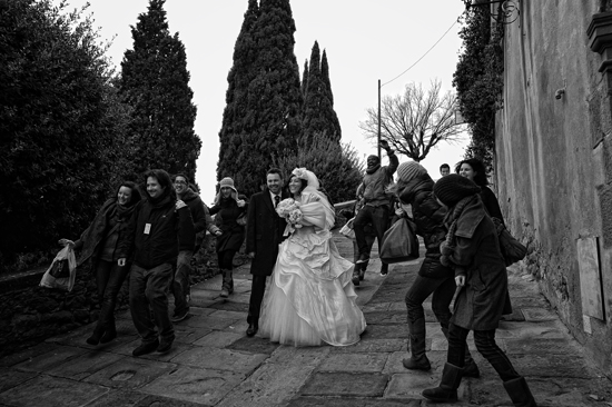 Lungo la strada verso il ‘venue’ ci siamo fermati – nelle mie intenzioni per 10 minuti – per fare degli scatti ‘solo sposi’. Come è mia abitudine do indicazioni alla coppia di camminare liberi di fermarsi quando vogliono, di parlare, ridere, scherzare, raccontarsi la giornata, interagire con l’ambiente. Una scolaresca in vacanza applaude ai novelli sposi. Ecco che all’operatore in puro ‘stile reportage’ brilla nella mente l’idea geniale. ‘Allora sposo e sposa fermi mentre tutta la scolaresca si allontani e al mio via inizi a correre incontro alla coppia. Che forte! Altrimenti si fanno sempre le stesse cose’. Io assisto basito alla scena e quando, successivamente, fa sedere lo sposo sul gradino di una porta e dice alla sposa di raggiungerlo, mettersi sulle sue ginocchia e baciarlo, beh… Queste scenette di puro giornalismo d’azione si sono ripetute per almeno mezz’ora intervallate ogni tanto da domande rivolte a me o al mio assistente del tipo: ma non li prendete da soli per fare dei ritratti?