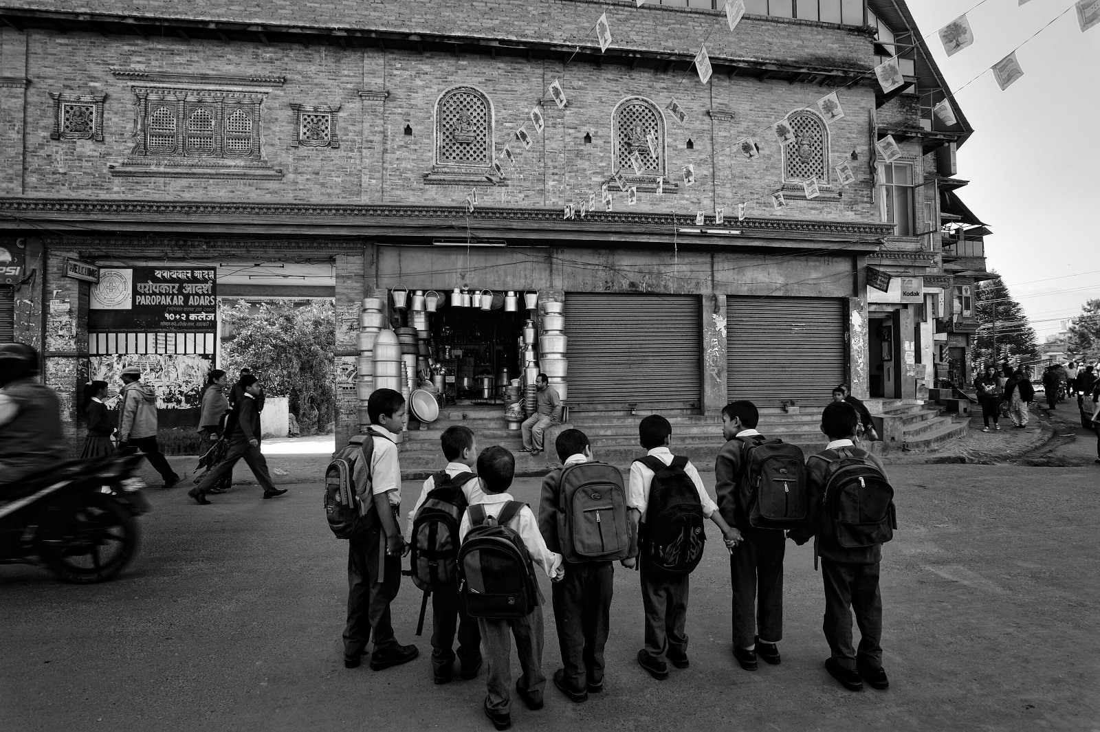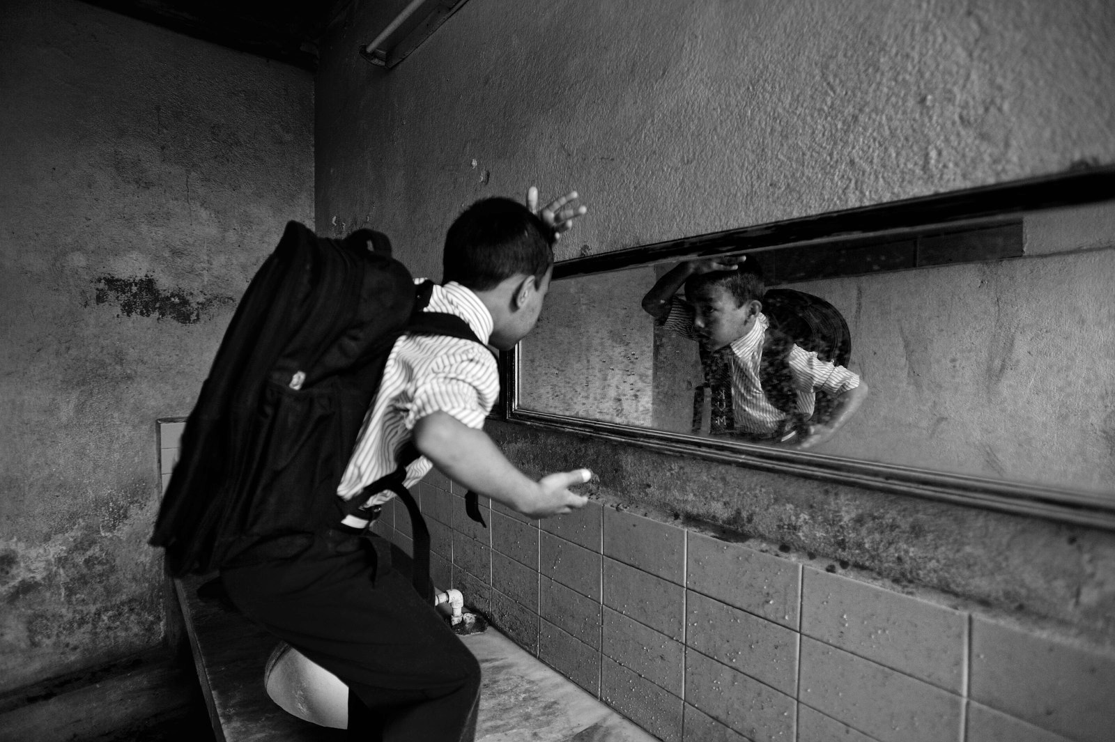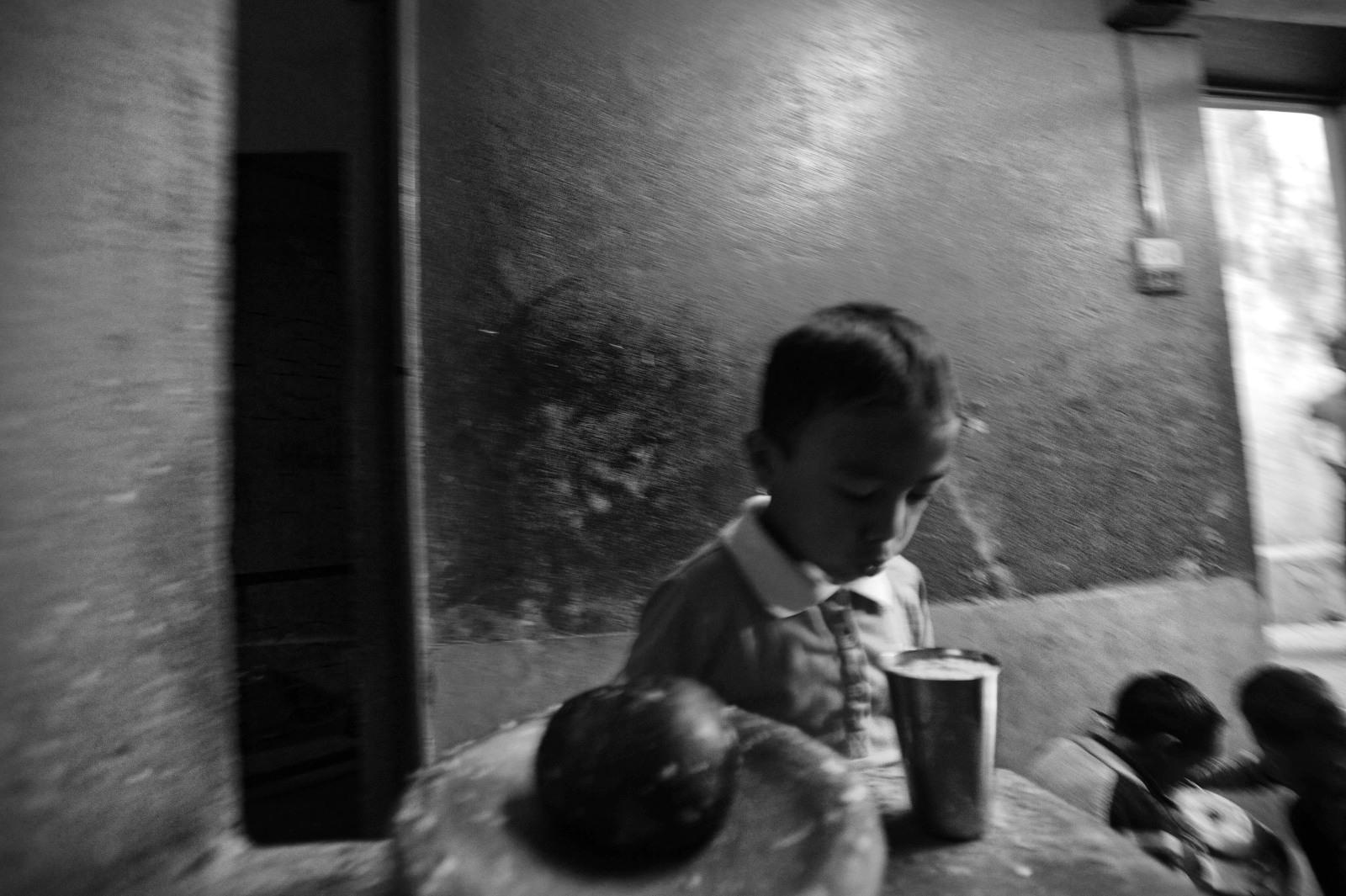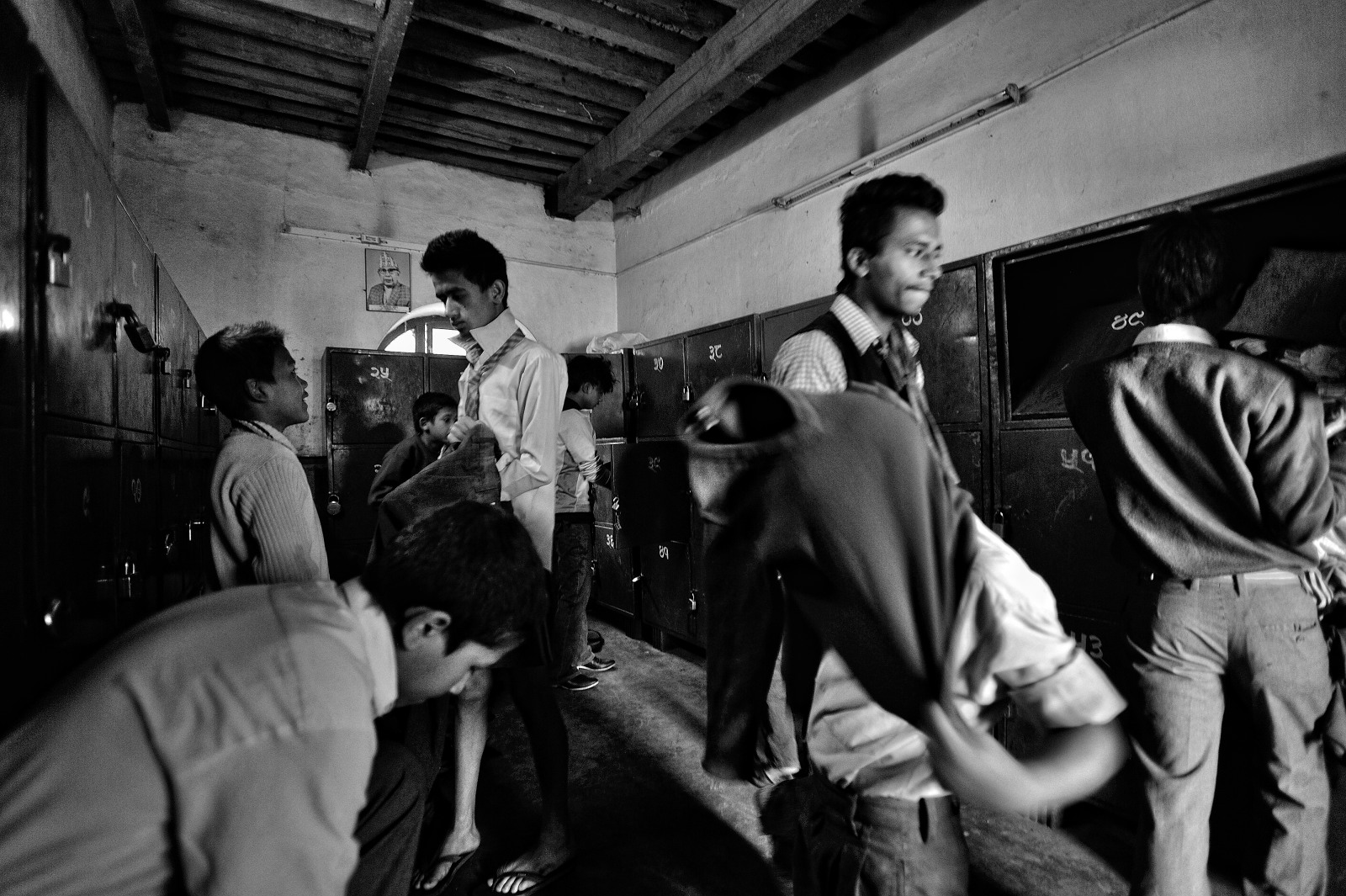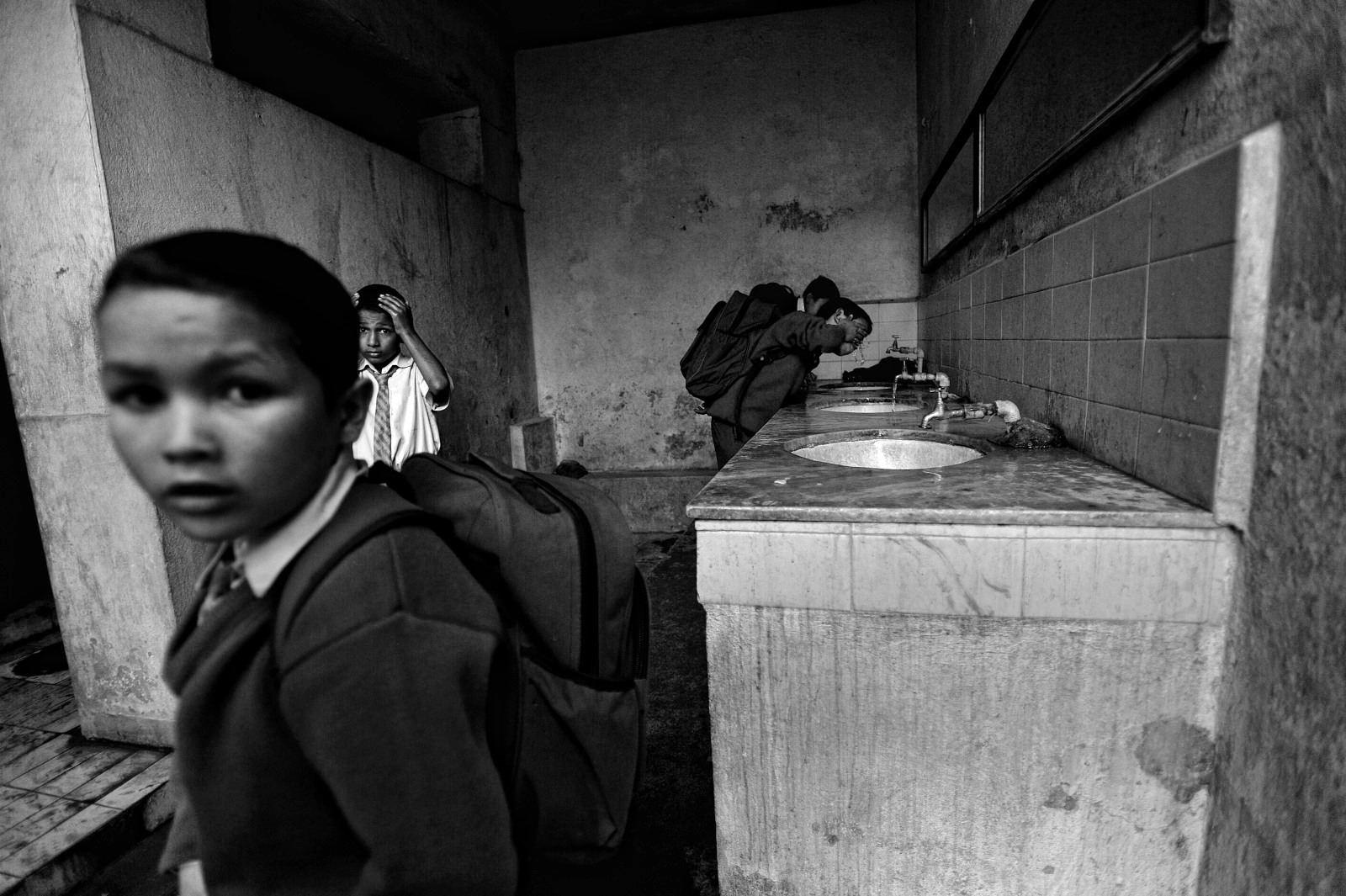 Nel periodo in cui ero a Kathmandù mi sono imbattutto casualmente nel più importante orfanotrofio della città. Ai piedi della parte vecchia si affaccia su una delle strade più caotiche frequentate dai nepalesi e dai turisti che salgono a piedi nella piazza principale. Incuriosito sono entrato. Sono stato accolto da un gruppo prima imbarazzato e poi festante di ragazzini dall’età variabile tra i 4 e i 14 anni. Stavano giocando a calcio nel piazzale interno. Mi sono messo anche io a tirare due calci al pallone e poi ho iniziato a fotografare. Inizialmente l’idea era di fare due scatti, senza pensare a una storia da raccontare, poi un piccolo progetto ha cominciato a prendere forma nella mia mente. Niente di incredibile, ma mi sono messo in qualche modo a raccontare i ritmi della vita nell’orfanotrofio. Ci sono tornato di notte, prima della sveglia mattutina, sono stato con loro a colazione, a pranzo. Li guardavo mentre studiavano e mentre giocavano ai videogiochi caricati su un vecchio pc molto probabilmente donato ormai molti anni or sono. Sono tornato alla sera quando aiutavano a preparare la cena, apparecchiavano la sala mensa e ripulivano i piatti dopo mangiato. Li ho seguiti preparasi per andare a letto. Sono ritornato la mattina dopo le festività legate alla Dusserha e li ho osservati mentre si preparavano per andare a scuola, si lavavano i denti, si pettinavano, si vestivano con la divisa – pantaloni e giacca scuri, camicia bianca e cravatta bordeaux – aiutandosi a vicenda. I più grandi che legavano le scarpe ai piccoli e, paradossalmente, i piccoli che insegnavano a leggere ai più grandi. Li ho accompagnati, impeccabili nelle loro divise, stirate ogni mattina, fin dentro la scuola pubblica e ho assistito alle lezioni.