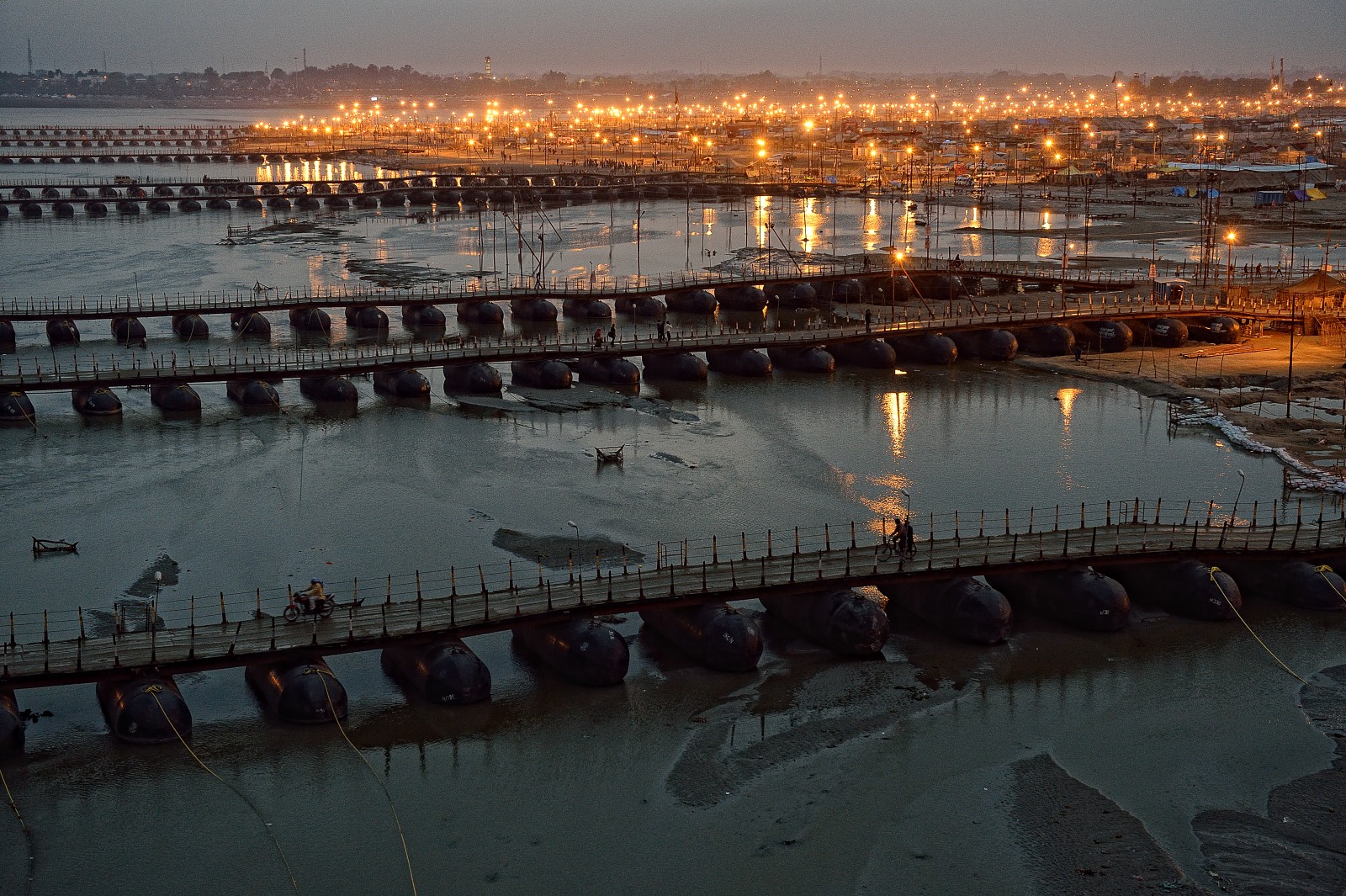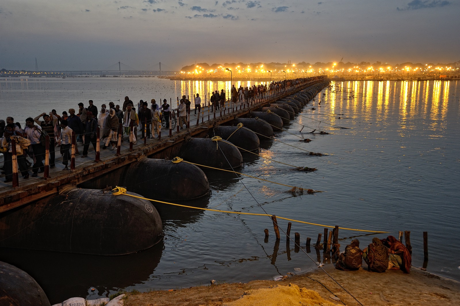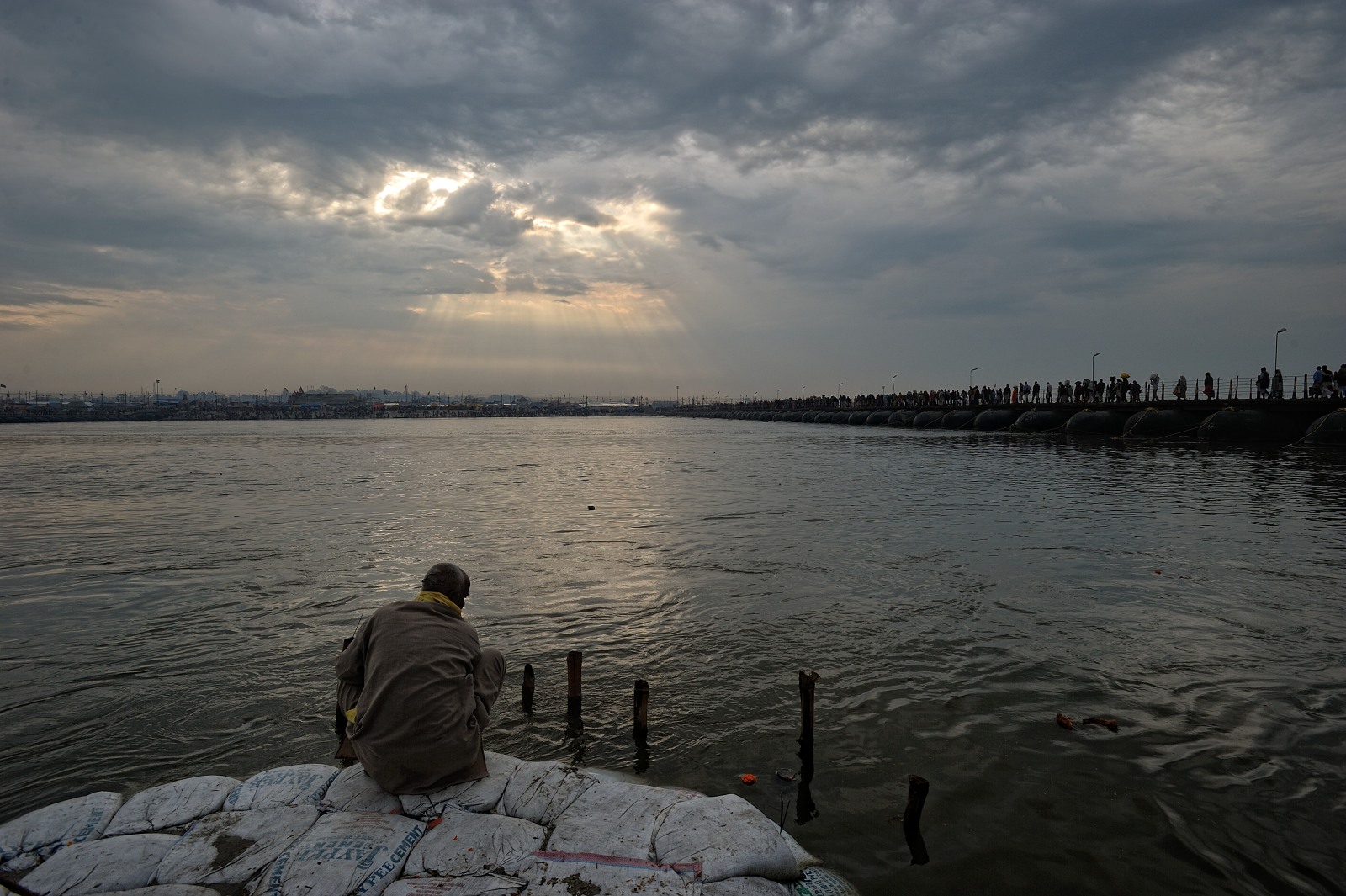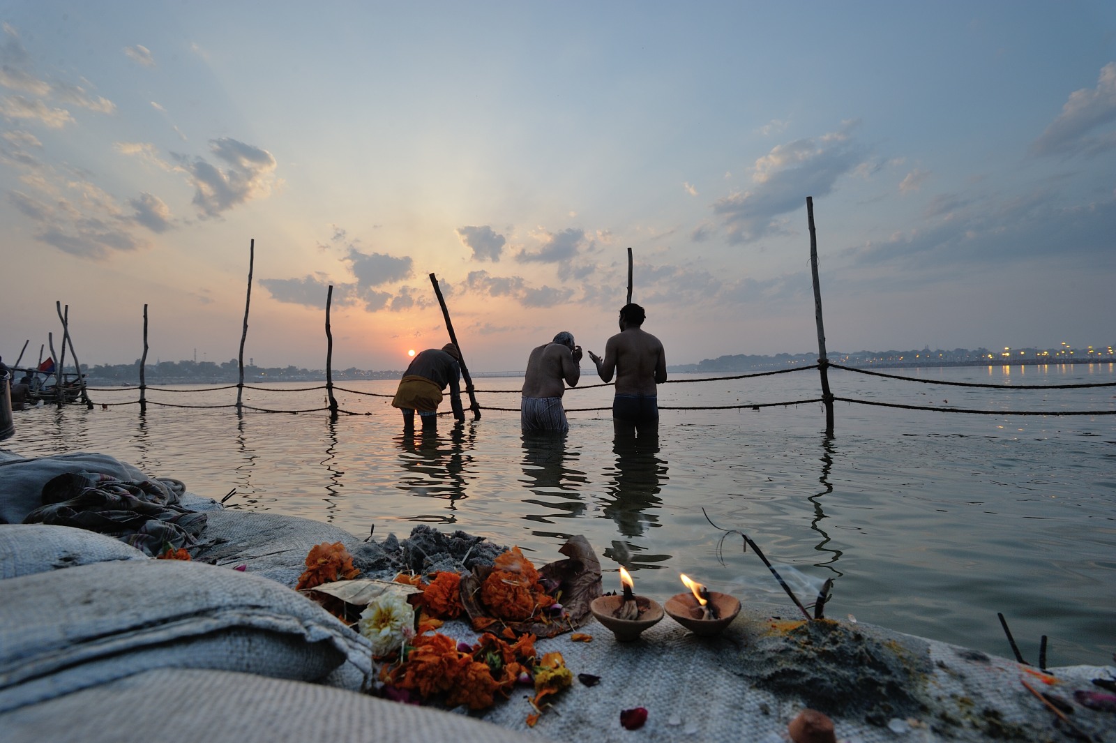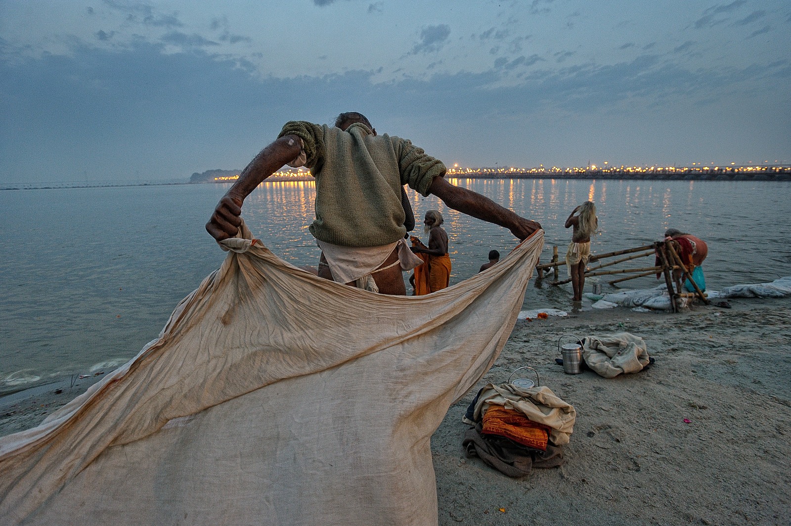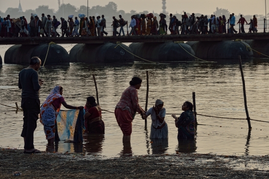 [Secondo moltissimi miti e religioni l’acqua è anche l’elemento purificatore: lo è nel battesimo per i cristiani, come nelle abluzioni prima della preghiera per i musulmani e gli ebrei. Ma lo è soprattutto qui nel sangam, il luogo dove il Gange si unisce allo Yamuna e al mitologico terzo fiume sotterraneo, nei riti quotidiani lungo le rive come nel bagno sacro collettivo che ogni tre anni vede milioni di pellegrini immergersi durante le sei settimane di celebrazione del Kumbh Mela].