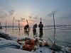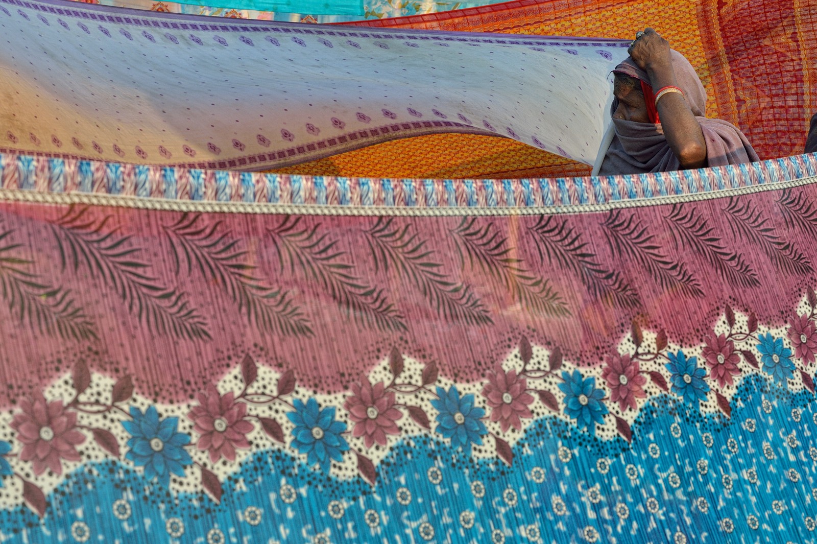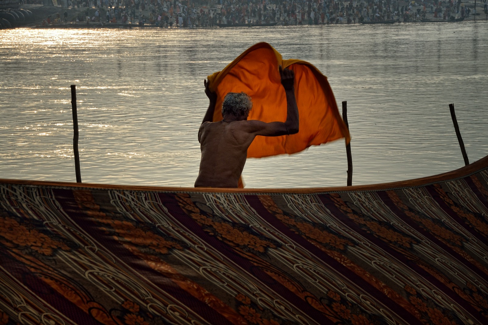 Ma il vero spettacolo sono i milioni di pellegrini arrivati in treno e in autobus, a piedi e sui carri, a dorso di cammello o in sella a un cavallo… Alcuni indossano solo un panno di tela annodato in vita e ghirlande di fiori gialli al collo, altri sono drappeggiati in ricchi paramenti; molti uomini portano turbanti dai colori accesi, le donne hanno i corpi fasciati in preziosi sari… Per una volta tutti sembrano dimentichi di caste e appartenenze: l’acqua scura della Mama Ganga accoglie i suoi figli senza distinzione alcuna.