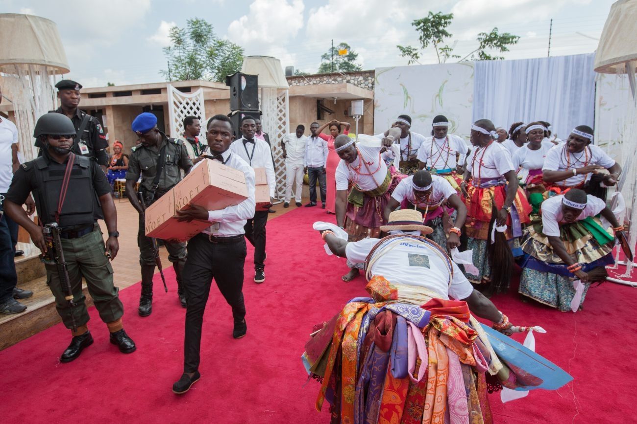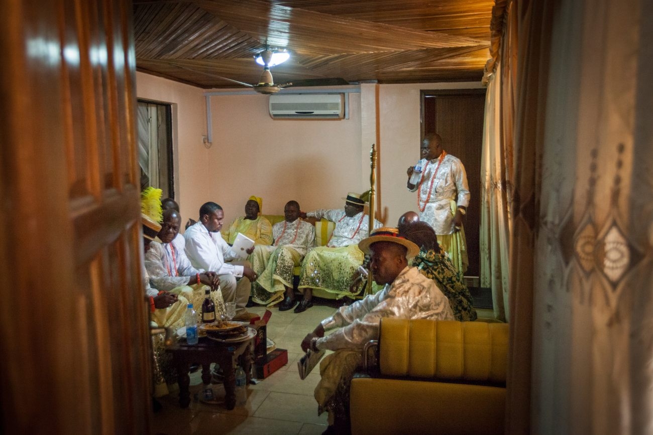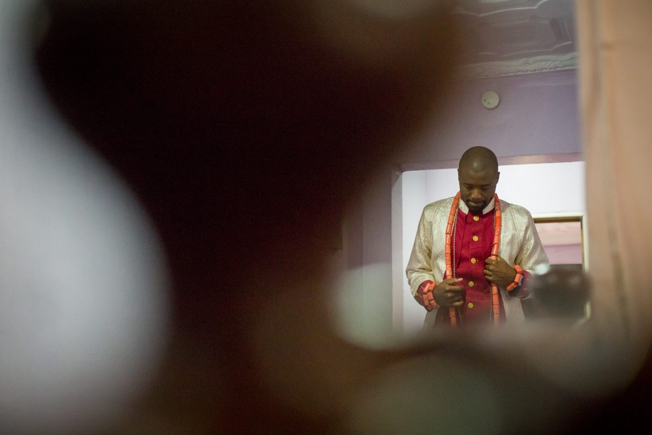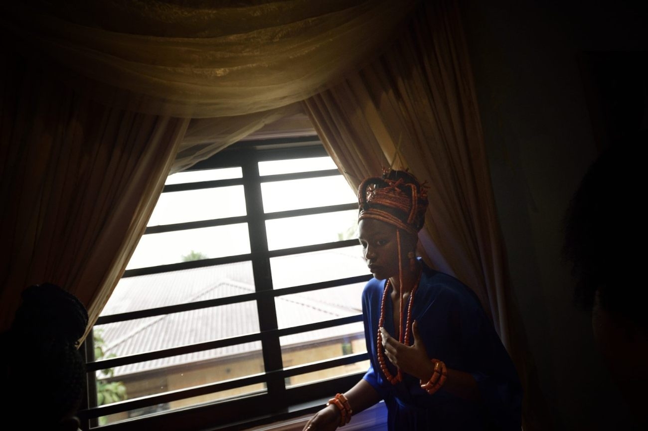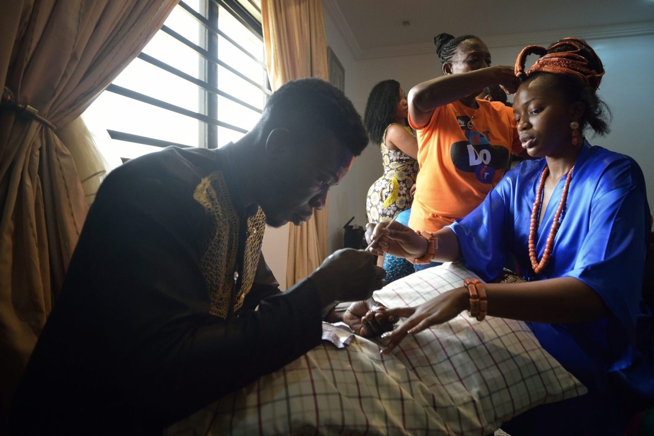 Partimmo io e parte del mio staff. Ancora non avevo capito né chi era la sposa né tanto meno che si trattava di un matrimonio reale. Avevo intuito che fossero dei benestanti, ma la mia immaginazione si fermava lì. Fu dopo il nostro arrivo prima a Lagos e poi a Benin City che iniziammo a renderci conto che non era un semplice matrimonio di una coppia di ricchi nigeriani. Mi ricordo che entrammo in casa della sposa passando tra una ventina di guardie del corpo, camionette della polizia, diversi militari molti dei quali indossavano giubbotti antiproiettile e tenevano un mitra a tracolla. Beh doveva essere qualcosa di più. Conoscemmo la sposa, i suoi fratelli, la sua famiglia. Nel parlare ecco che Ivie, la futura convolante a nozze, con una naturalezza imbarazzante ci disse che il suo futuro marito era un principe. Ci guardammo per essere sicuri di avere capito bene. Si avevamo capito bene: my husband to be is a prince! Iniziammo a scattare con occhi e attenzione nuova. Adesso non era più un servizio ‘normale’ ma stava diventando qualcosa di diverso. Un reportage che andava oltre la fotografia di matrimonio. Mi vennero in mente i servizi di Benedicte Kurzen, di Robin Hammond, di Glenda Gordon che avevano e stanno ancora lavorando in Nigeria. Però, a differenza di loro, io ero stato scelto come fotografo personale della coppia e la cosa mi inorgogliva non poco. Inizia così a raccontare quello che stavo vivendo fin dagli allestimenti, dalla preparazione delle ‘bomboniere’, dai rituali pre wedding insomma volevo documentare una storia che mai avevo vissuto, un’esperienza molto particolare, totalmente diversa da quello che avevo mai fotografato prima. Tradizioni, culture, rapporti umani inconsueti e nuovi ai quali non avrei mai pensato o sperato di poter condividere. Volevo fare un reportage che facesse vedere tutto questo.
