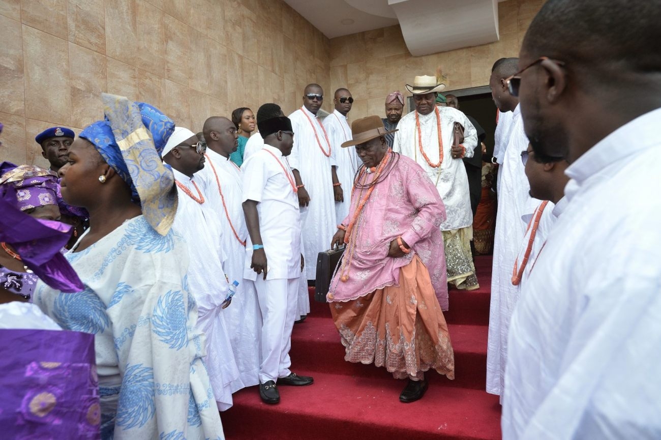 Il re, padre dello sposo, dopo la cerimonia di nozze circondato dagli anziani di corte