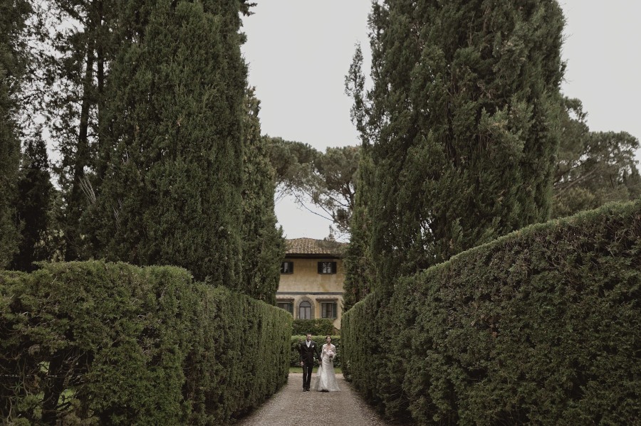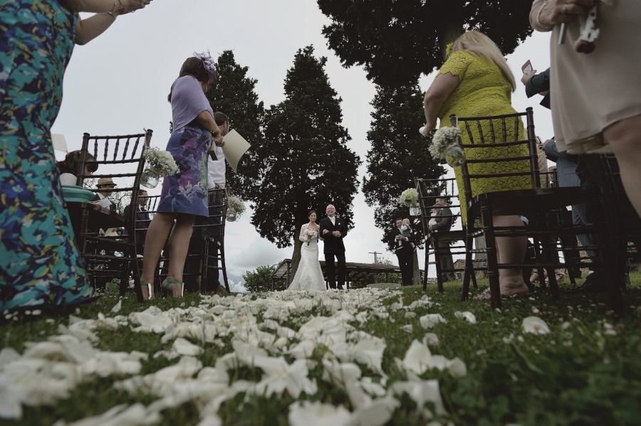 Laura e Alex, sono una bella coppia di inglesi che ha scelto la Toscana per le loro nozze in quanto i nonni della sposa hanno origini massesi. Il tempo non promette niente di buono ma lo spirito sia degli invitati che degli sposi è alto: ‘noi siamo abituati a questa atmosfera‘ dice Laura, ‘ma non abbiamo certo questo paesaggio, quindi va bene‘. Il gazebo sotto il quale si scambieranno le promesse è in fiore. Le rose si sono tutte aperte e creano una corona rosa che emana nell’aria un dolce e delicato profumo. La sposa indossa un elegante vestito bianco, mentre lo sposo un abito grigio.