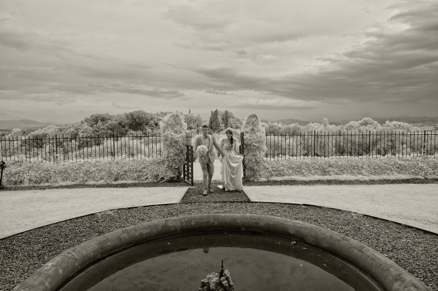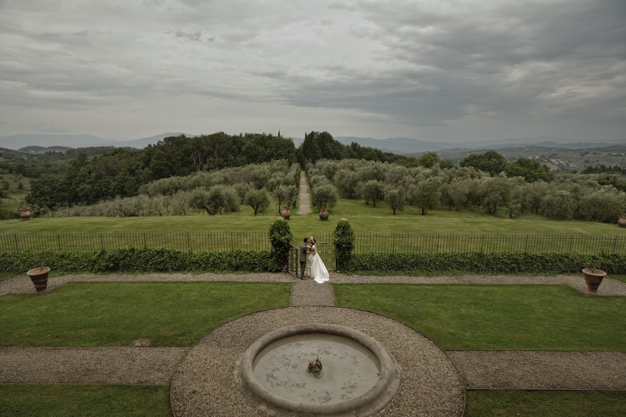 Amir e Shiraz, gli sposi, accompagnati dalle loro famiglie hanno celebrato il loro matrimonio con una cerimonia nella tipica tradizione ebraica. Una Kuppah semplice ma raffinata era stata montata nella terrazza centrale. La sposa ha fatto il suo ingresso con un elegante abito bianco realizzato dalla sorella, una nota stilista israeliana. Una corona di fiori arricchiva e sottolineava un trucco pulito e adatto all’occasione. Dopo la cerimonia qualche invitato si è ritirato per cambiarsi d’abito, altri si divertivano con dei selfie Polaroid e così ne ho approfittato per fare delle fotografie alla coppia. Un paesaggio così unico ha fatto da sfondo agli sposi che camminavano tranquilli nei giardini della Villa. Per gli sposi le condizioni atmosferiche non erano il massimo e il tempo minacciava continuamente acqua. Per la mia fotografia, per il mio modo di raccontare, invece, questi colori morbidi, questa luce non violenta, questa atmosfera ovattata mi hanno aiutato ad ottenere un effetto delicato, molto intimo che era tra l’altro in sintonia con il carattere molto tranquillo, sereno e ‘curiosamente’ solare della coppia. Lo stile reportagistico che mi ha permesso di raccontare tutto lo svolgimento dell’evento è stato integrato con questa fotografia spontanea dove gli sposi, si sentivano liberi di muoversi senza la pressione ossessiva della macchina fotografica.