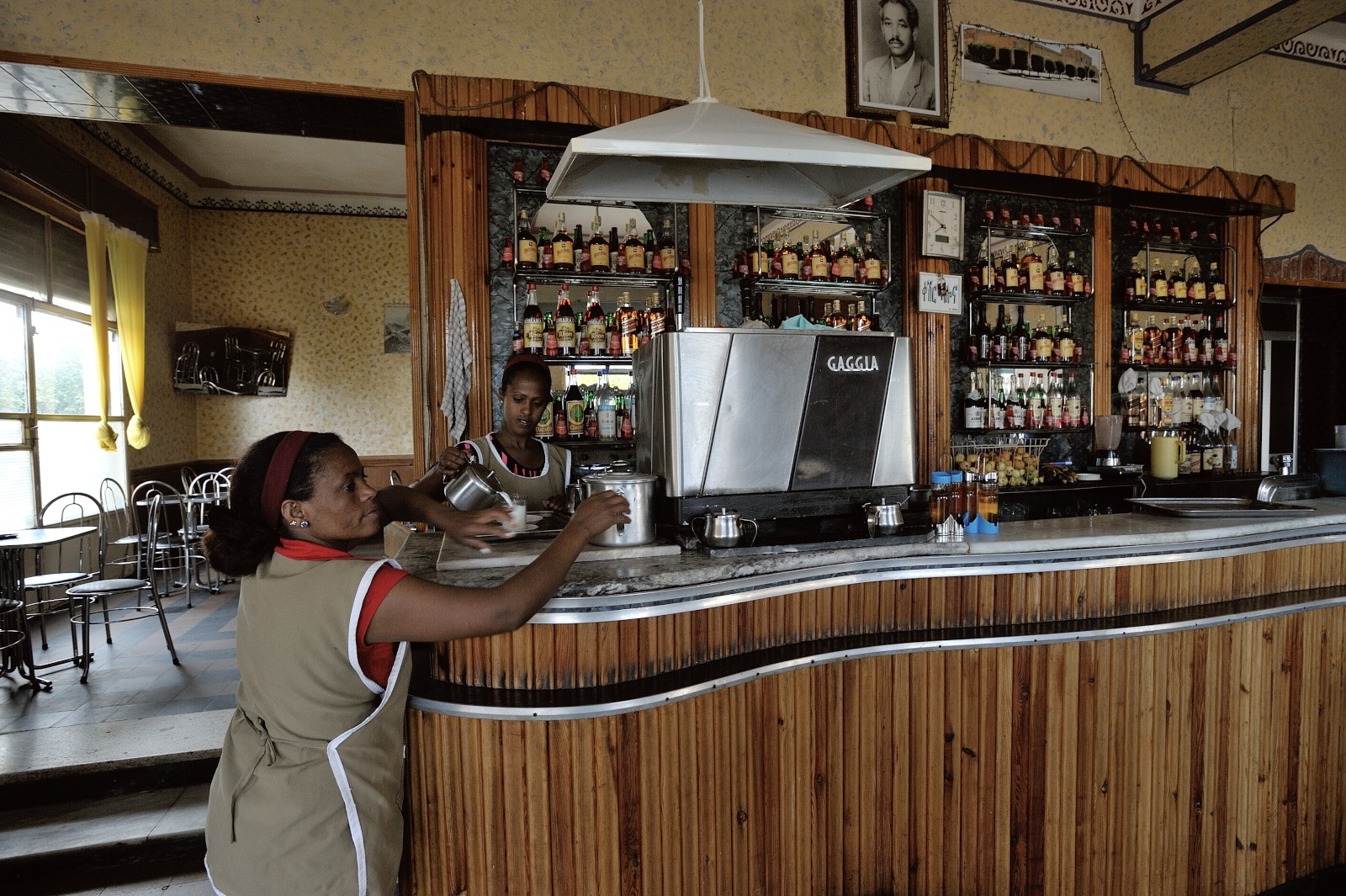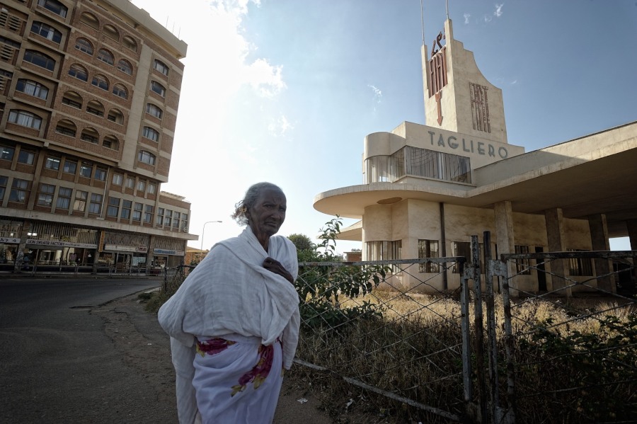 Camminare per le strade di Asmara è come fare un viaggio indietro nel tempo. Ci si cala in un contesto fermo a decenni fa’ quando la capitale eritrea attraversava il suo periodo di massimo splendore. Tutto è rimasto come allora. Si percorrono i viali della città, la via Crispi, il viale Regina Margherita, ci si imbatte nel Cinema Impero o nel Teatro Asmara, si beve un cappuccino nel Bar Zilli vicino alla concessionaria Fiat Tagliero o nel Bar Vittoria una delle migliori pasticcerie della città. Si cammina tra palazzi dalla tipica architettura del Ventennio con le finestre chiuse da avvolgibili verdi o persiane color sabbia. Si entra nella Farmacia Centrale con i suoi barattoli della Officina Farmacopeica Ambrosiana, si pranza al Ristorante Italia dentro all’omonimo albergo poco distante da quella che erano la Banca d’Italia e le Poste Centrali. Si chiede un cappuccino per colazione, un espresso dopo pranzo e un aperitivo Padova prima di cena. Il treno a vapore che un tempo collegava Asmara con Massaua è stato costruito dall’Ansaldo di Genova nel 1938 e molte delle infrastrutture, dei ponti, della rete viaria, dei pannelli elettrici, delle condutture d’acqua, dei motori a scoppio riportano, nella targhetta di fabbricazione, nomi o città italiane. Il cotonificio Barattolo è l’unica realtà industriale rimasta nel paese e non nazionalizzata. Ormai la proprietà non è più dei vecchi fondatori ma è rimasta comunque in mano ad un grosso gruppo industriale italiano che continua, tra mille difficoltà, a produrre ed esportare capi di abbigliamento in tutto il mondo. Basti pensare che le divise blu degli scout sono prodotte da questa azienda in Asmara.