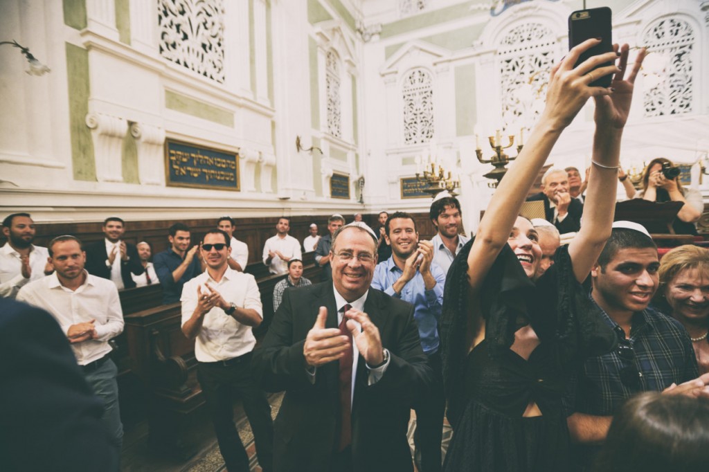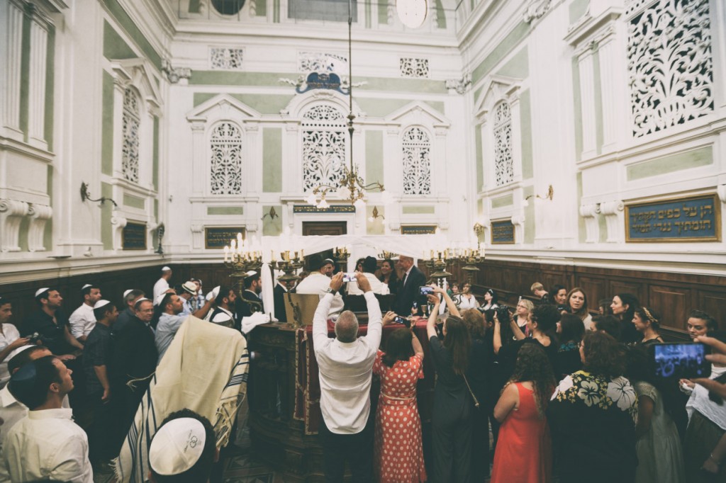 La cerimonia in Sinagoga è nel tipico stile ebraico, gli aspetti comuni di un matrimonio ebraico comprendono la ketubah (contratto matrimoniale) che viene firmata da due testimoni, un baldacchino di stoffa (chuppah o huppah), un anello di proprietà dello sposo che viene dato alla sposa mentre la coppia si trova sotto il baldacchino, e la tradizionale “rottura del bicchiere”. Poi si salutano gli amici con un piccolo rinfresco e la distribuzione del pane.