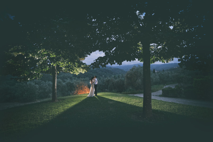 Il ricevimento viene fatto nel giardino di Fontebussi. Il menù tipicamente toscano è accompagnato da un buon vino Chianti. L’allestimento floreale è molto agreste e si intona perfettamente con l’ambiente. Continuo a fotografare in modo informale tra gli ospiti durante la cena. Proseguo fino al taglio della torta e ai balli che, come in ogni matrimonio ebraico, sono molto divertenti, pieni di allegria e gioia. Qualche scatto all’ora blu, un po’ più ‘costruito’, conclude questo servizio fotografico.