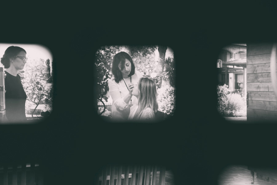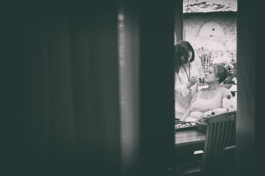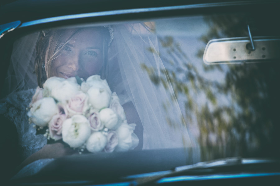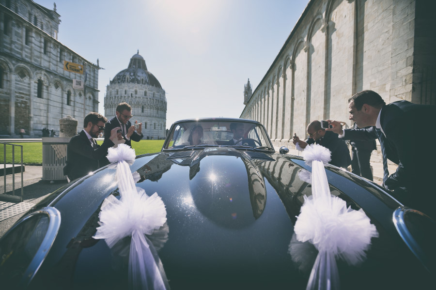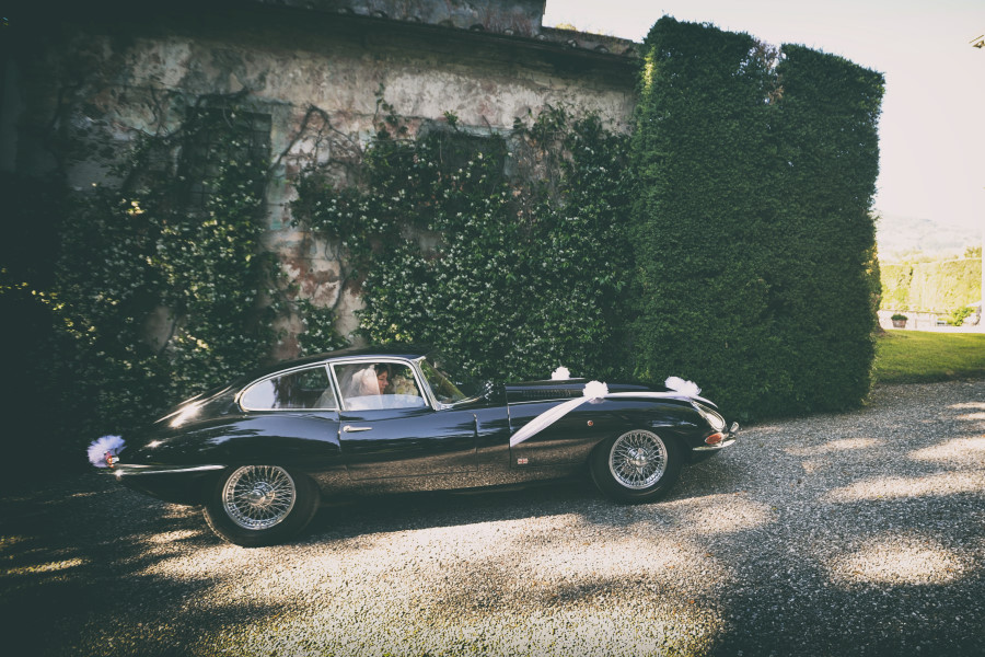 La preparazione della sposa è stata nella sua casa a Pisa. Si respirava una bella energia e, stranamente, c’era una atmosfera rilassata. Al trucco e parrucco si alternano la sorella, la mamma e le testimoni della sposa. Nel frattempo lo sposo, di Milano, faceva la sua preparazione con gli amici e testimoni in un hotel sempre a Pisa. Dopo circa 3 ore ci siamo, Ilenia è pronta, adesso la tensione inizia ad essere palpabile. Fuori della casa l’aspetta lo zio che la farà salire su una della auto d’epoca che più ho amato perché legata alle mie letture adolescenziali e non solo, la Jaguar E Type nera, meglio conosciuta come quella di Diabolik. Un mito.