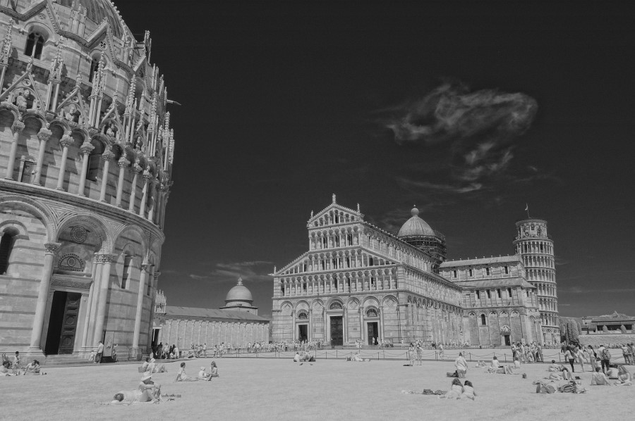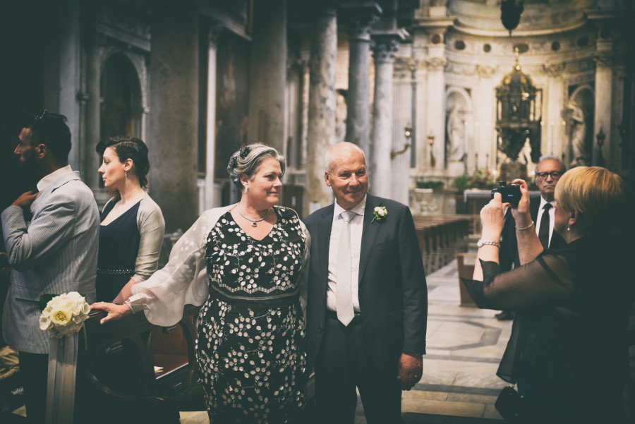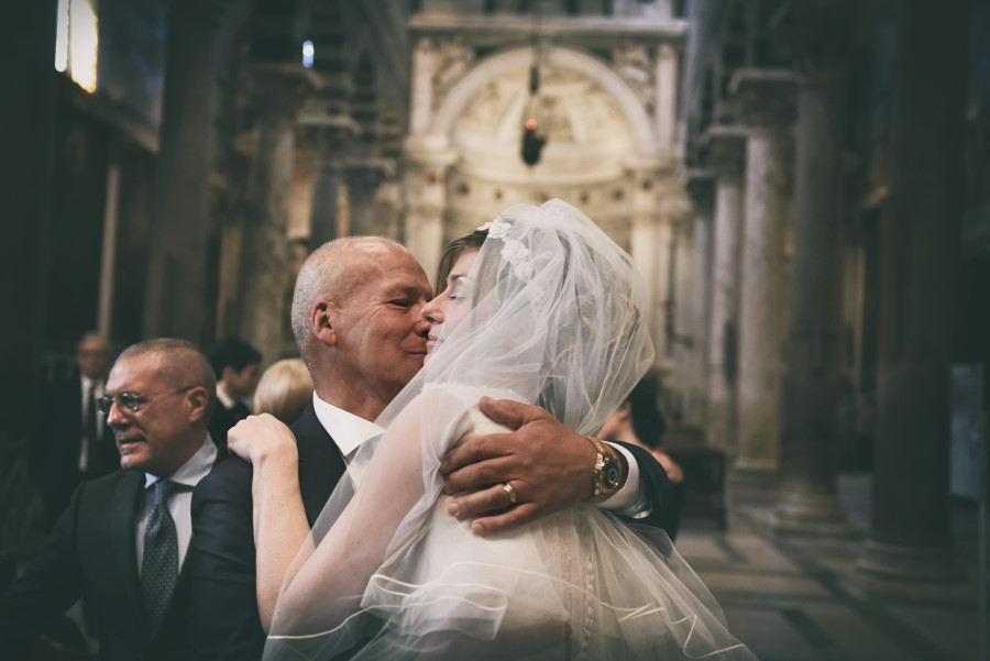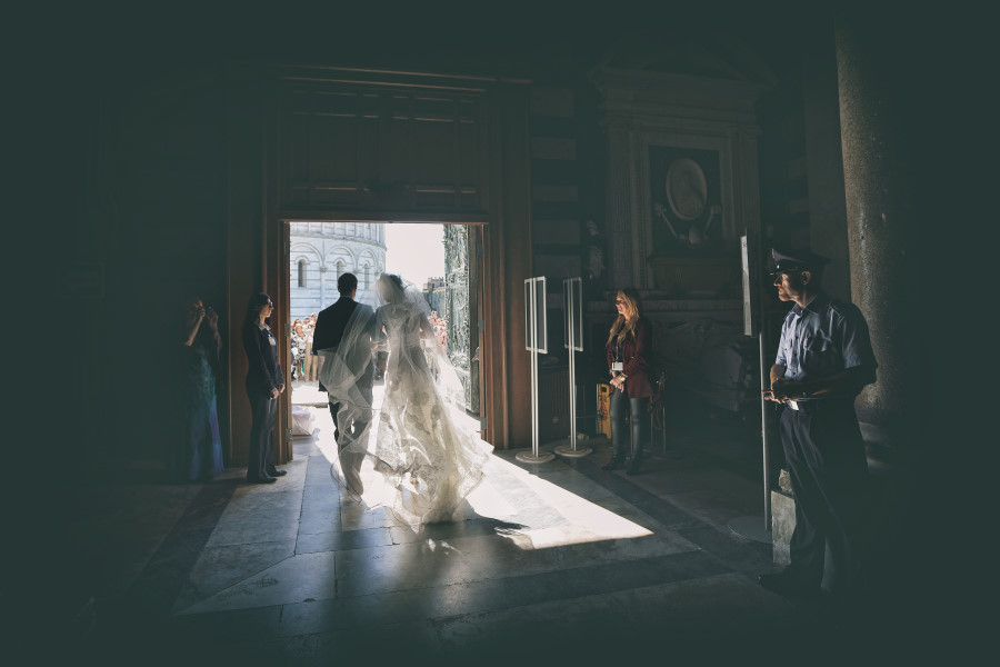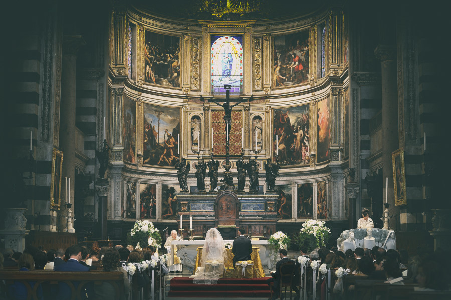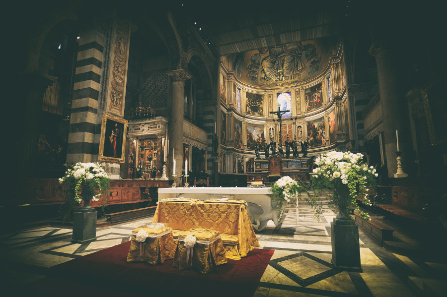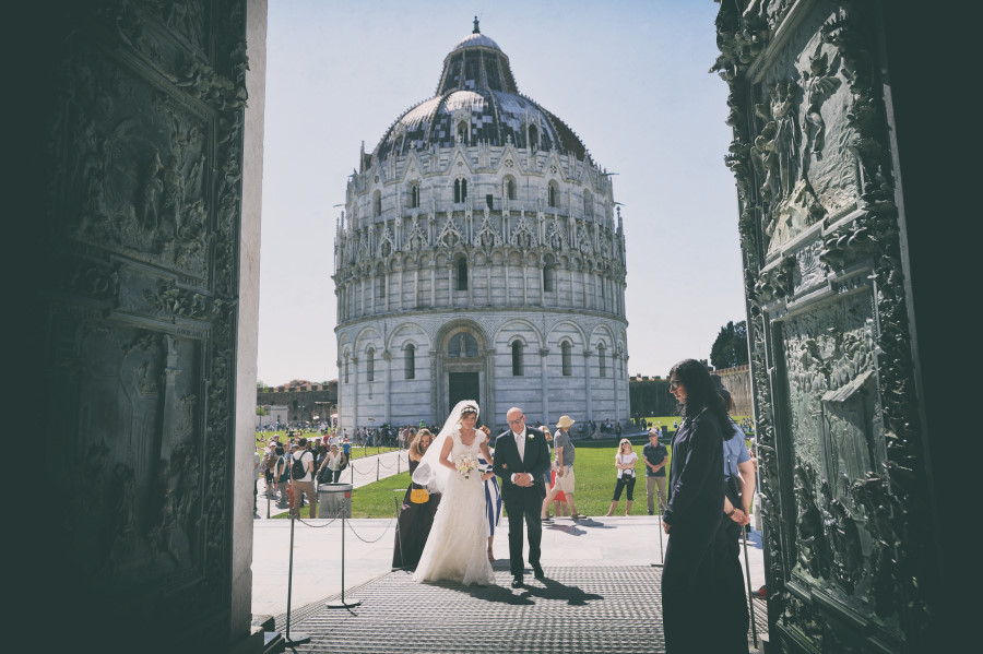Sotto gli sguardi stupidi dei turisti raggiungiamo Piazza dei Miracoli a Pisa. Si, la coppia si sposa nella Cattedrale di Santa Maria Assunta, meglio nota come il Duomo di Pisa. Erano anni che nessuno più era riuscito ad ottenere i permessi per fare la cerimonia in questo luogo che tutto il mondo ci invidia. La cerimonia è stata molto coinvolgente. La Messa degli sposi è stata celebrata da un loro amico prete costretto dall’età a stare su una sedia a rotelle. Per niente al mondo avrebbe rinunciato a celebrare le loro nozze e, anche se durante la cerimonia ha avuto un attimo di ‘sbandamento’, è riuscito a sposarli nella commozione generale.
