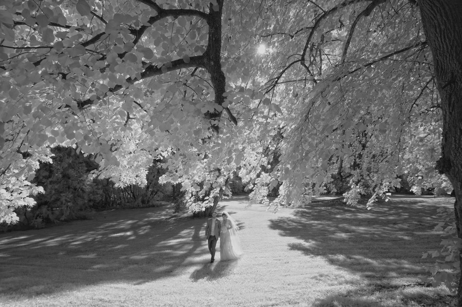 Per la fotografia e in particolare la mia fotografia, il matrimonio di Andrea e Ilenia è stato perfetto. Dopo che la cerimonia si è svolta nel Duomo di Pisa, un capolavoro del romanico, un ‘tempio bianco come la neve’ siamo andati in un luogo altrettanto ricco di fascino: Villa Grabau a San Pancrazio vicino a Lucca. Il parco della villa, nel tardo pomeriggio, viene colpito da una luce di taglio che s’insinua tra gli alberi secolari creando dei giochi di luci e ombre molto interessanti. Il verde delle piante permette di esaltare anche la mia fotografia all’infrarosso. Mentre gli ospiti aprivano l’aperitivo mi sono trattenuto una ventina di minuti con gli sposi per fare qualche fotografia di coppia. Senza posa, senza costruire, senza imporre gesti o comportamenti particolari. Gli sposi liberi di camminare, di parlare tra loro, di ridere e scherzare, di raccontarsi e ricordarsi la cerimonia appena finita e io che mi muovevo intorno a loro per fare fotografia spontanea cercando di cogliere un abbraccio, un sorriso, uno sguardo con la luce e lo sfondo migliore. Una fotografia di matrimonio non invasiva.