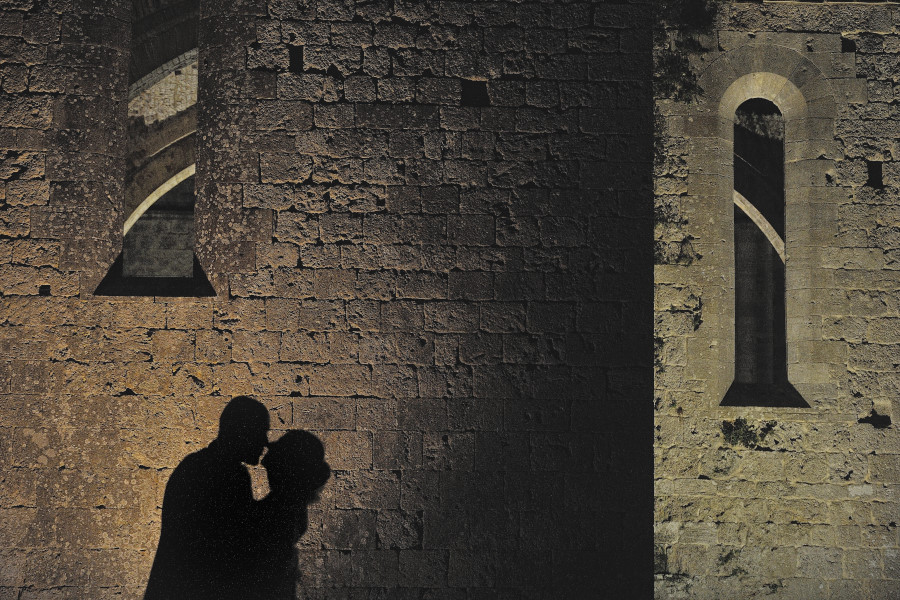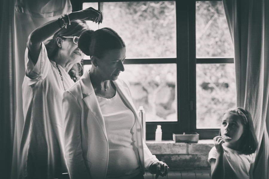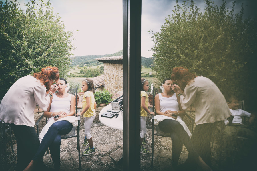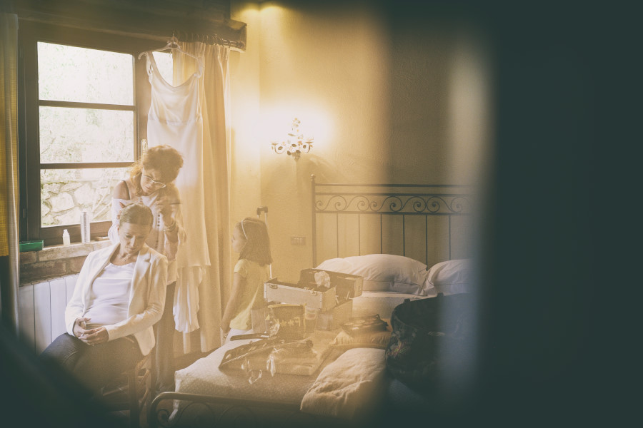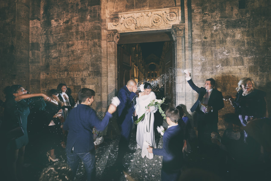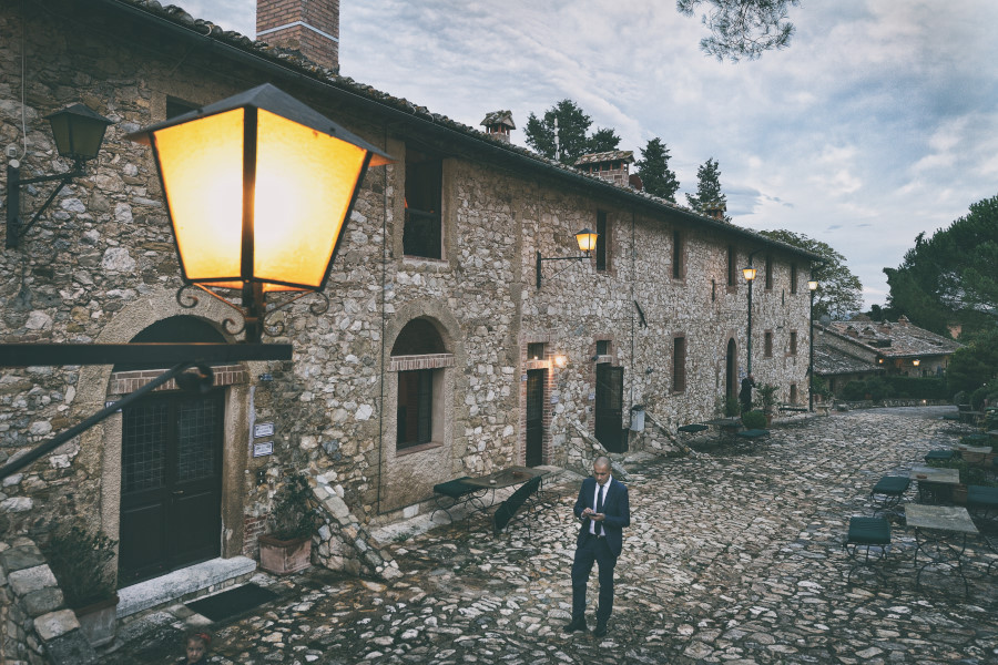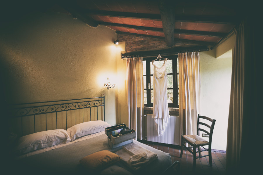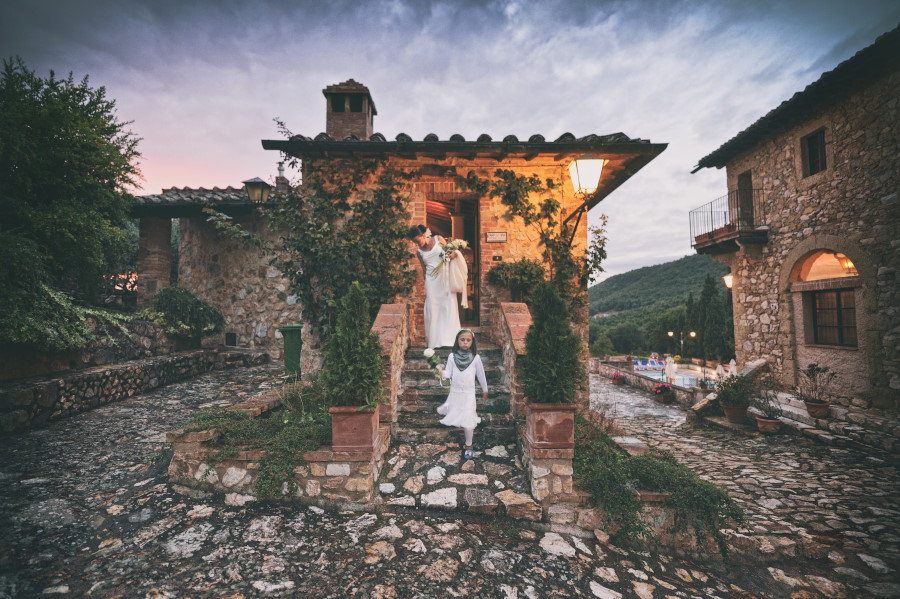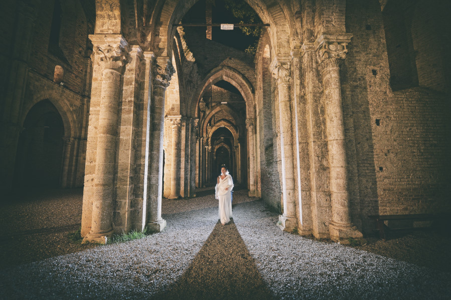 La sposa si è preparata a pochi chilometri da San Galgano, nell’agriturismo Il Poggiaccio dove poi farà anche il ricevimento di nozze. Esce dal suo appartamento poco prima dell’imbrunire quando il sole è da poco tramontato e la luce naturale si sovrappone a quella gialla dei lampioni. Un pallido rosa dipinge, come un morbido pastello, le nuvole in cielo.