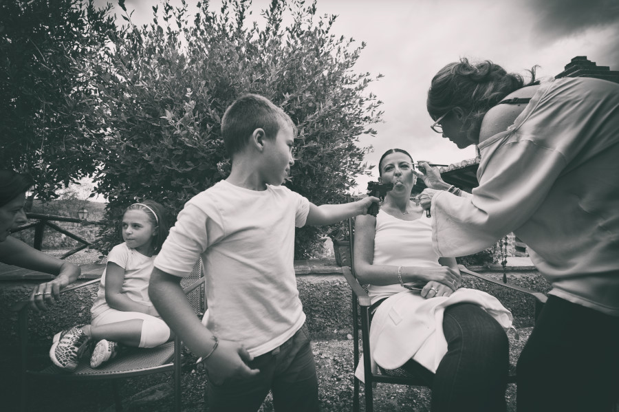 Mi è piaciuto lavorare come Fotografo a questo matrimonio. E’ stata anche una sorta di sfida perché non è stato facile prendere fotografie praticamente tutte di notte. Non ho usato il flash se non per qualche ‘back’ e ho cercato di sfruttare il più possibile la luce dell’ambiente. Una piccola lampada a led mi ha schiarito gli sposi in qualche situazione tipo al lancio del riso o in alcuni momenti della cerimonia. Cercare di cogliere dei momenti in stile con la mia visione reportagistica e foto giornalistica del matrimonio è stata la difficoltà più grande perché non è nella mia fotografia usare il flash frontale e la luce era veramente scarsa. Credo però di esserci comunque riuscito. Da molte fotografie traspare il legame profondo che lega la coppia. Un rapporto che si estende anche ai figli. Insomma sono stato felice e privilegiato a fare questo servizio fotografico per il loro matrimonio: grazie Fabiola e Paolo.