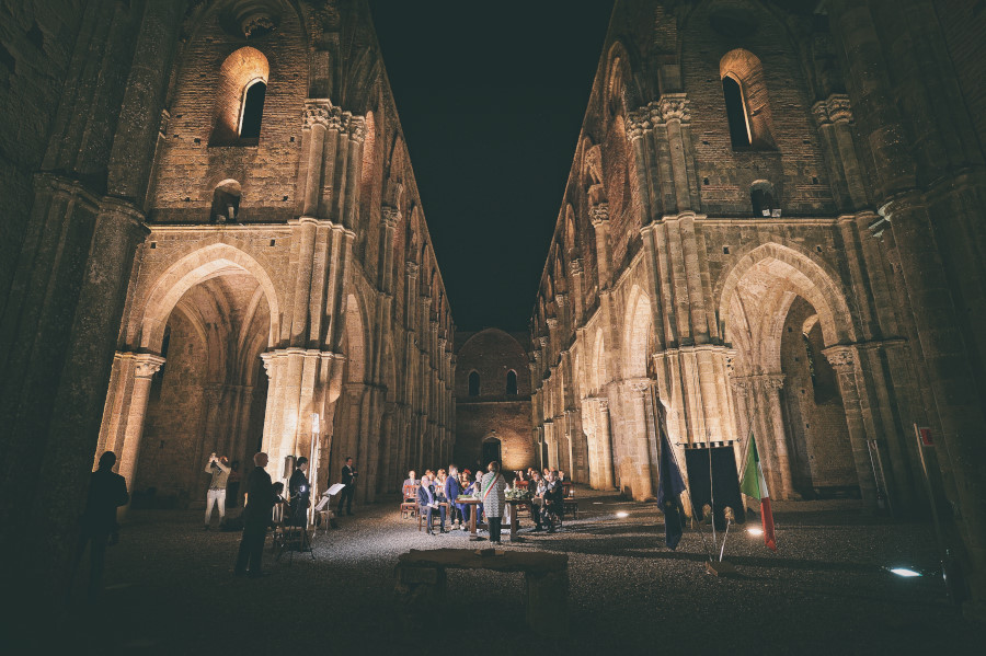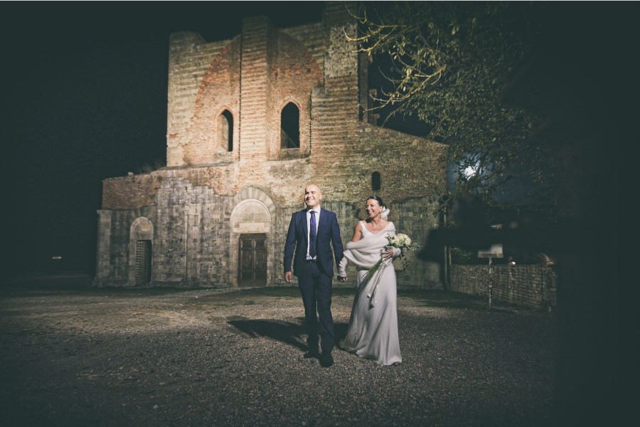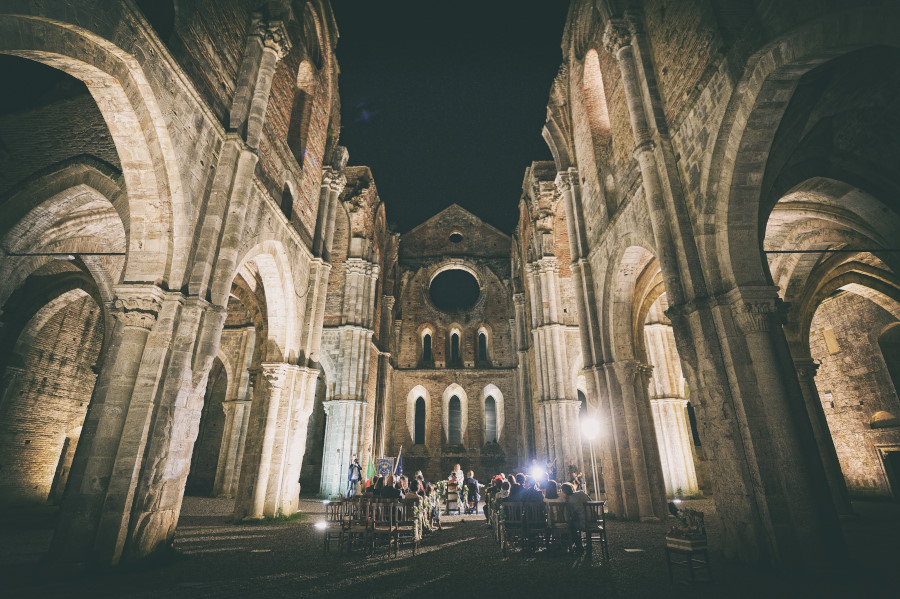 Non ci sono parole per descrivere il momento. Fabiola e Paolo, lo sposo, raggiungono l’abbazia di San Galgano che è già buio. E’ incredibile vedere questa meraviglia di architettura illuminata di un giallo tenue che si stacca nel blu intenso che precede la notte. La luna piena si affaccia da una delle tre finestre giusto in fronte all’altare e sembra salutare gli sposi. Che silenzio. Non ci sono i turisti e i visitatori a romperlo. Una leggera bruma si alza nella campagna circostante. Non fa freddo anche se ha piovuto fino a poche ore prima.