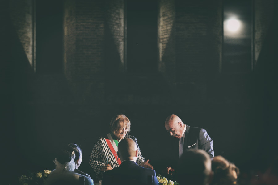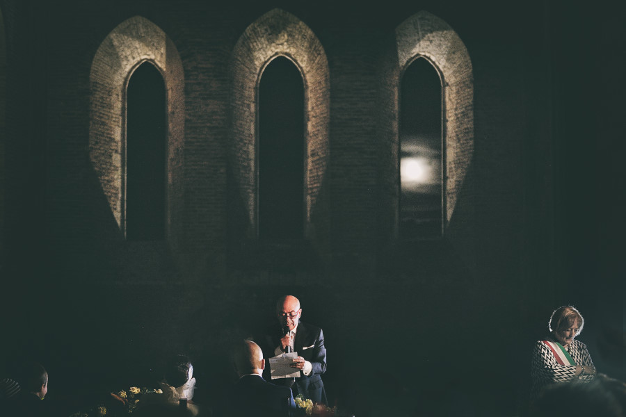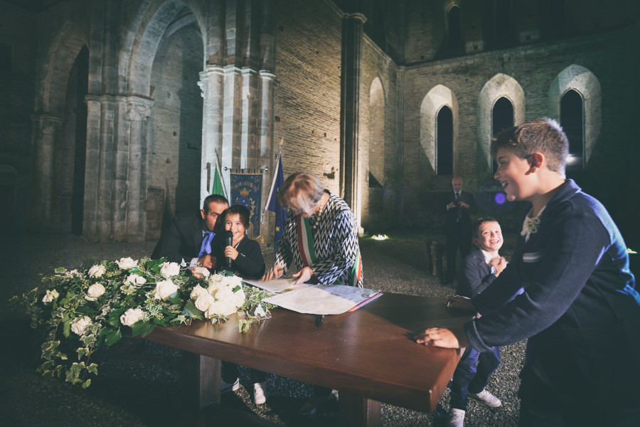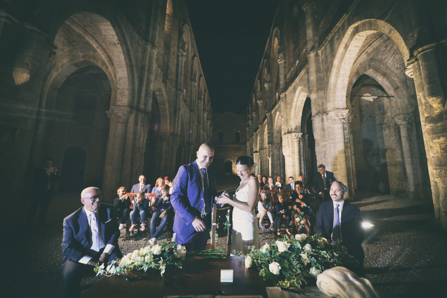 Anche la sindaca è emozionata. Ringrazia gli sposi per averle dato l’opportunità di celebrare il primo matrimonio di notte in questo posto da favola. La cerimonia è semplice ma intensa. Le note che vibrano dalle corde di un violino rendono il tutto quasi mistico. San Galgano dà questo. Credo sia una dei luoghi più romantici della terra per sposarsi e la notte ne aumenta il fascino.