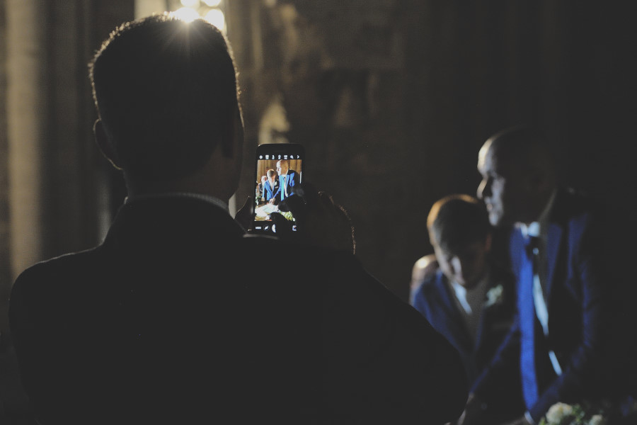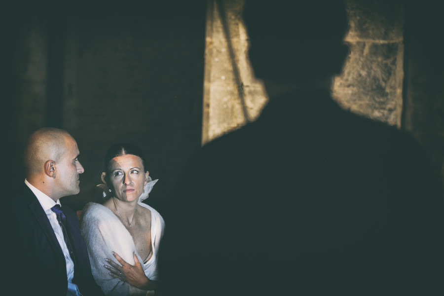 Finita la cerimonia, dopo i baci e abbracci di rito (rotti anche da qualche pianto di emozione dello sposo) mi sono dedicato una decina di minuti a fare delle foto di coppia. Ho voluto sfruttare e combinare la calda illuminazione della abbazia di San Galgano con la luce più fredda del flash. Mi è piaciuto anche giocare con le ombre e le silhouette come a cercare di trasmette il silenzio nella fotografia. Poi siamo tornati al Poggiaccio per la cena di nozze.