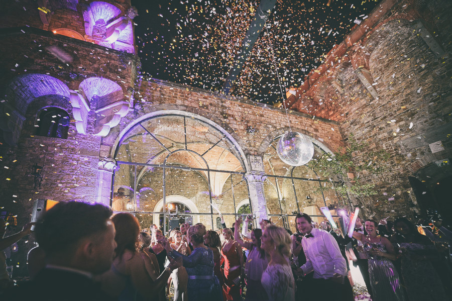 La veranda era elegantemente addobbata sia nei fiori che nella mise en place. Anche l’illuminazione soffusa ha contribuito a rendere più romantico l’ambiente. Arrivo in sala a ritmo di musica e inizio cena. Interruzione per i classici discorsi di amici e poi trasferimento nella corte interna del Castello per l’inizio dei balli. Una band londinese di 7 elementi ha animato in modo incredibile la festa facendo ballare gli sposi e gli ospiti fino a notte fonda. Dopo il primo ballo una cascata di coriandoli d’oro e d’argento ha reso ancora più emozionante e magica la serata.