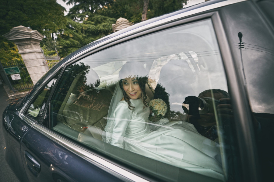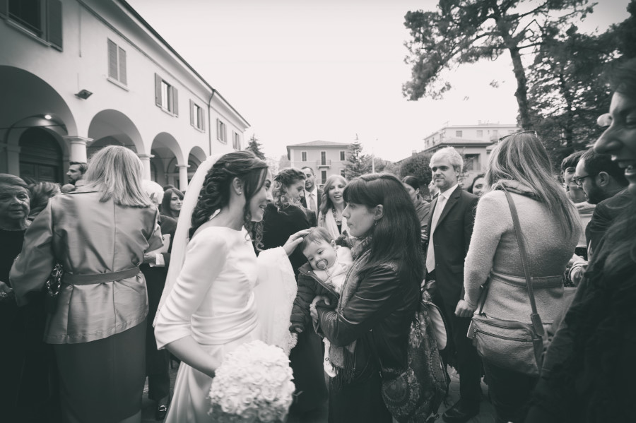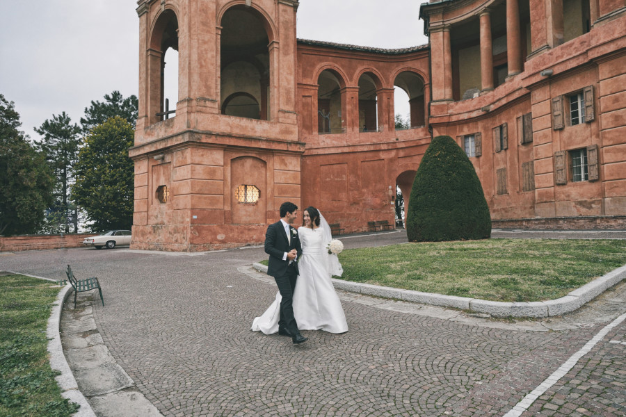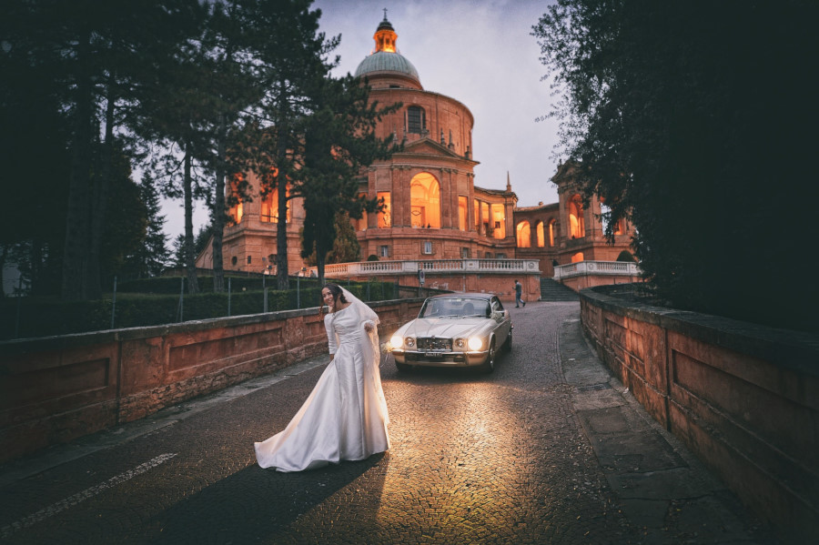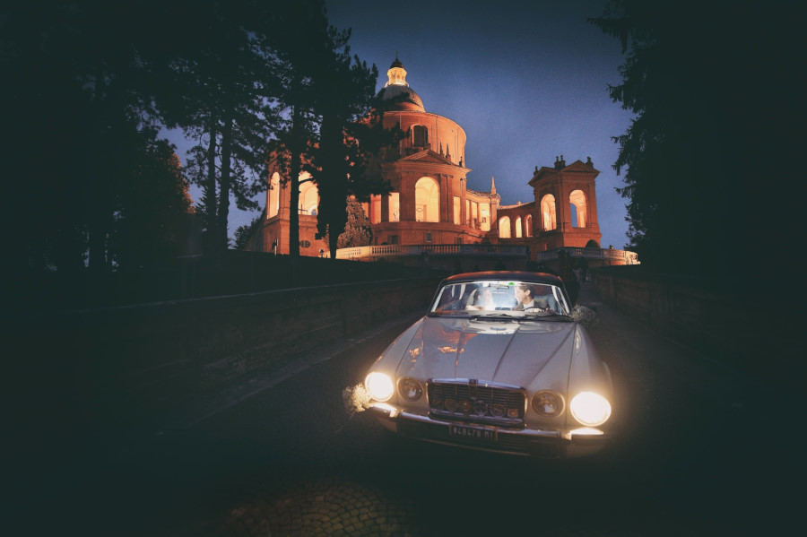 Un fine settimana d’autunno, un pallido sole che ormai non riscalda più, qualche nuvola che fa calare più velocemente la notte. Fermo restando il carattere reportagisto del mio lavoro, gli sposi desideravano anche delle foto di coppia e volevano che in qualche modo fossero legate alla loro città, Bologna. Avevamo pensato, quando ci siamo incontrati, di fare delle foto in esterni al Santuario di San Luca ma sapevamo di avere solo pochi minuti di luce. Dopo aver fatto delle fotografie cercando di sfruttare i muri ocra del Santuario in modo da creare del colore su cui si staccasse il bianco e nero degli sposi, essere già saliti in macchina per andare al ricevimento, ecco il momento magico: le luci artificiali si accendono e illuminano il Santuario di San Luca. Tutta l’atmosfera cambia e anche le foto di coppia assumono dei colori diversi, più caldi, più avvolgenti.