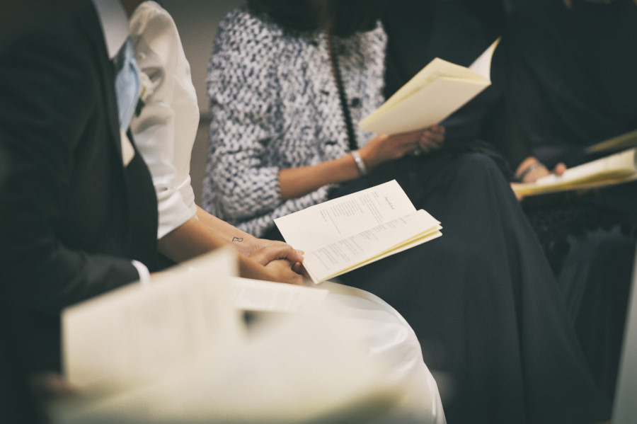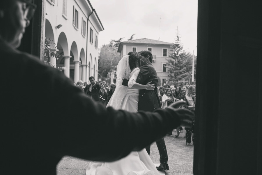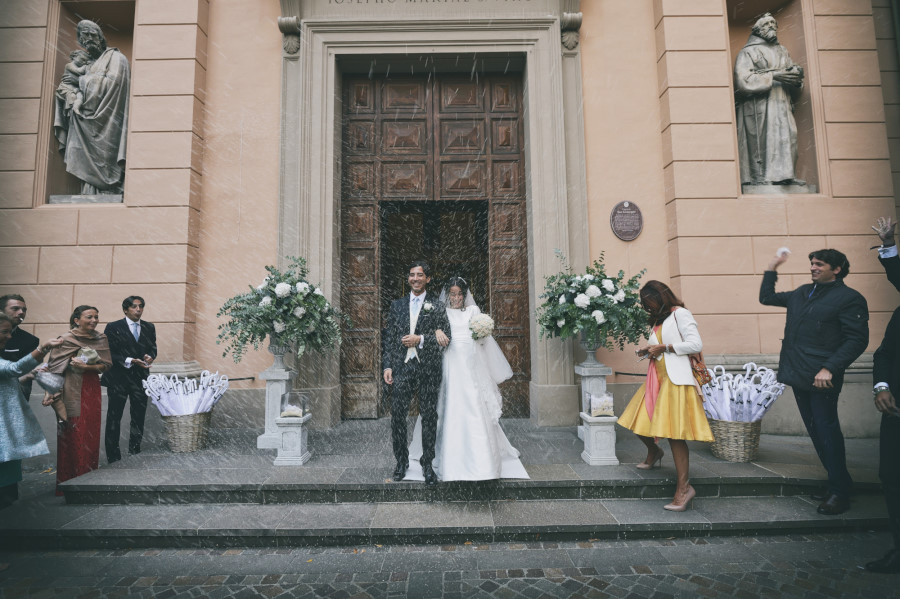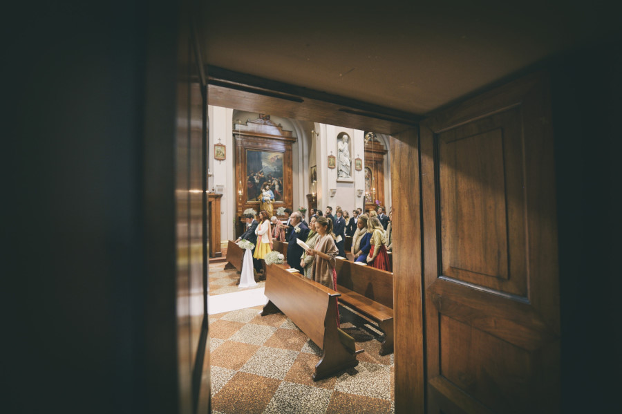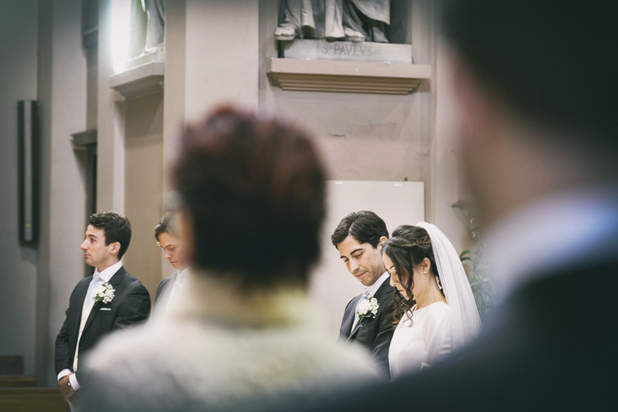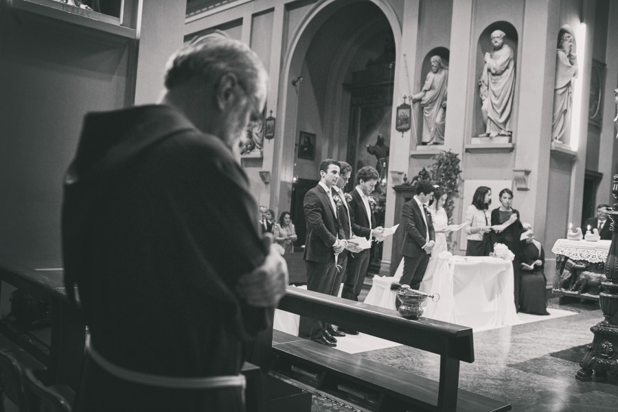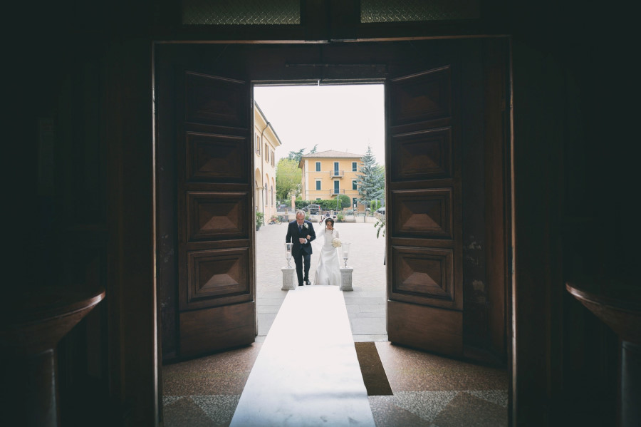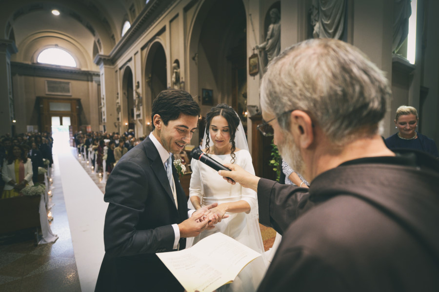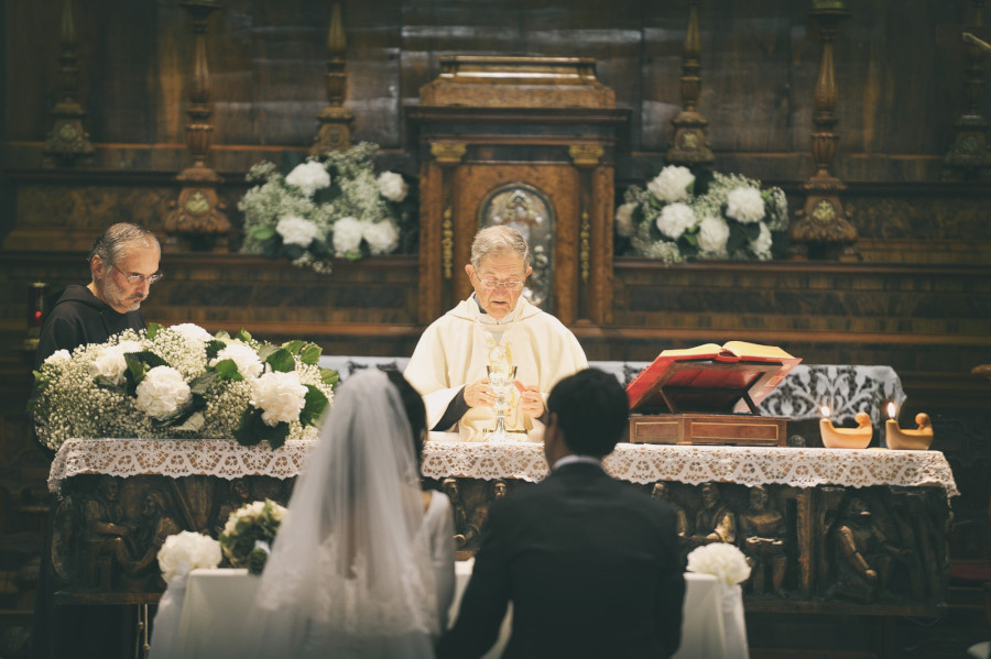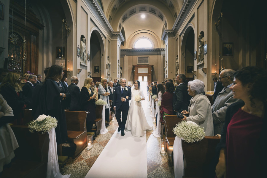 L’arrivo nella chiesa della sposa rispecchia la tradizione dei 15 minuti di ritardo, mentre lo sposo era già entrato e la stava aspettando davanti all’altare. L’ambiente era molto elegante, gli invitati venivano non solo da molte parti d’Italia ma anche dall’estero. La chiesa era stata allestita con magistrale perfezione, niente di troppo invasivo ma con molta classe. Delle eleganti composizioni sulle panche, qualcosa sull’altare e due alzate all’uscita della chiesa. La wedding planner Marilena ha coadiuvato un team di professionisti di alto livello per venire incontro al meglio alle giuste esigenze degli sposi. Talvolta credendo di risparmiare si cercano delle soluzioni più economiche senza pensare che tutto quello che accade il giorno del matrimonio è un qualcosa di unico e irripetibile. Penso un po’ a tutto ma in particolare al servizio fotografico. Ovvio che ne sono coinvolto in prima persona ma oggettivamente tutto ciò che è legato al ricordo del matrimonio passa dalla fotografia. Saranno gli scatti del fotografo a far sì che a distanza di anni gli sposi, i genitori, gli amici, i parenti possano rivivere quei momenti spessi passati troppo in fretta. Ecco perché un buon fotografo con esperienza è fondamentale così come una brava wedding planner può essere determinante per la buona riuscita dell’evento coordinando prima e durante tutte le fasi del matrimonio.