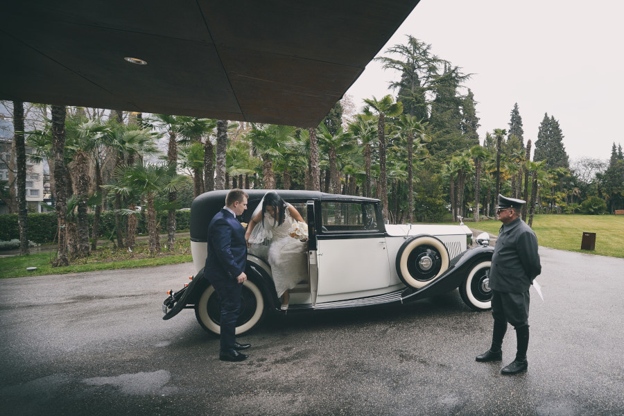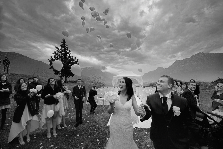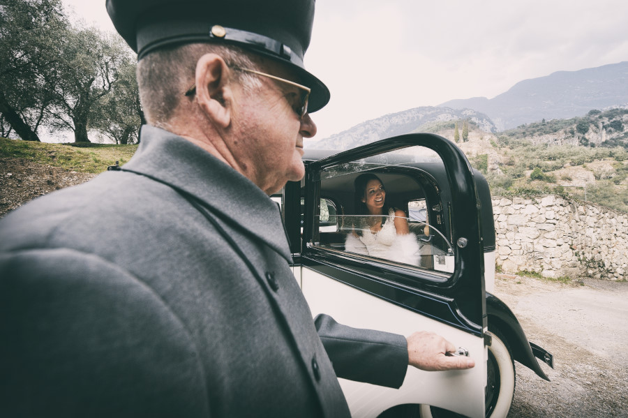 Ho cercato di cogliere degli attimi, delle emozioni, delle situazioni spontanee, senza pose che raccontassero, in sintonia con lo stile reportage che mi piace utilizzare anche nella fotografia di matrimonio, quello che è accaduto sia durante la cerimonia che al ricevimento. Per le foto di coppia, che gli sposi volevano, ho sfruttato la splendida location del Castello di Arco. Sempre ritratti spontanei, non costruiti, in modo da avere delle situazioni vere, dei sorrisi sinceri ed evitare delle espressioni forzate e artificiali. Il tempo atmosferico ci ha concesso non più di 15 minuti che, per la mia fotografia di matrimonio, sono più che sufficienti, prima di iniziare a piovere. A questo punto gli sposi sono rimontati nella Rolls Royce d’epoca e si sono diretti al Lido Palace di Riva del Garda dove hanno fatto il ricevimento del loro matrimonio.