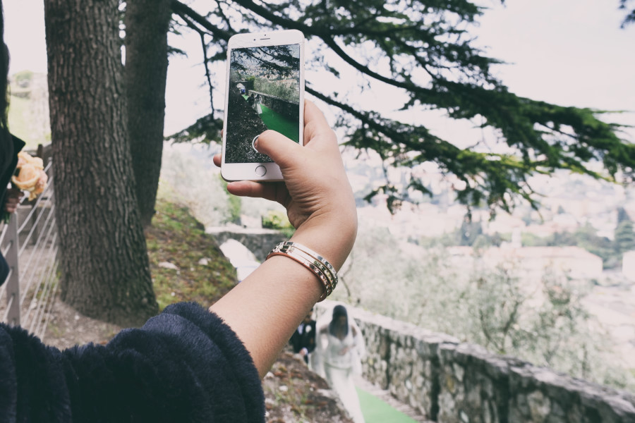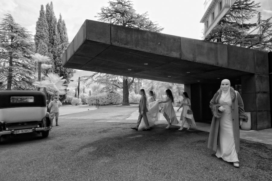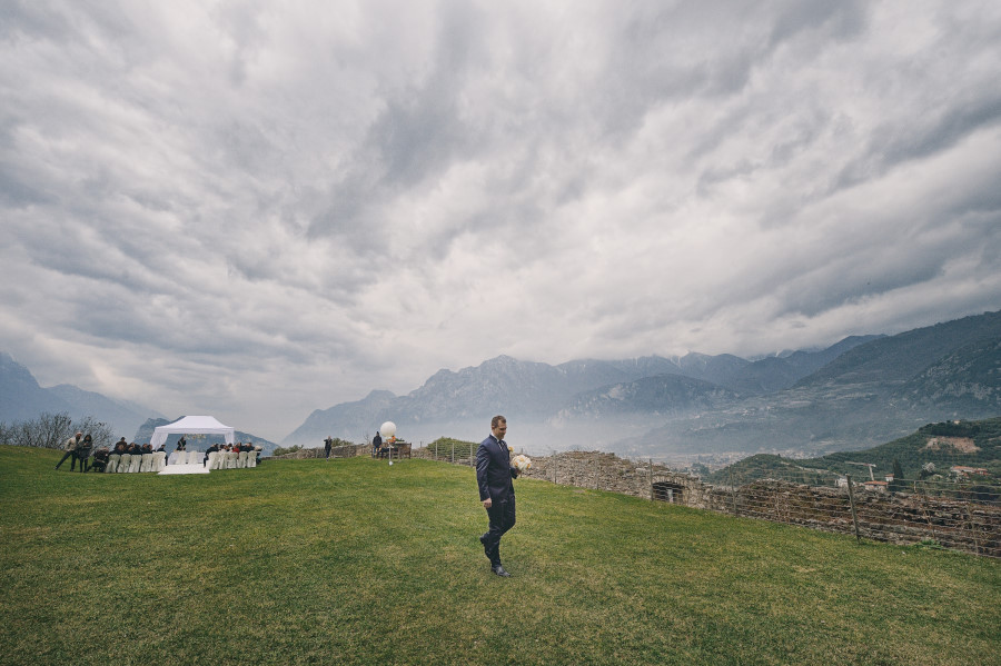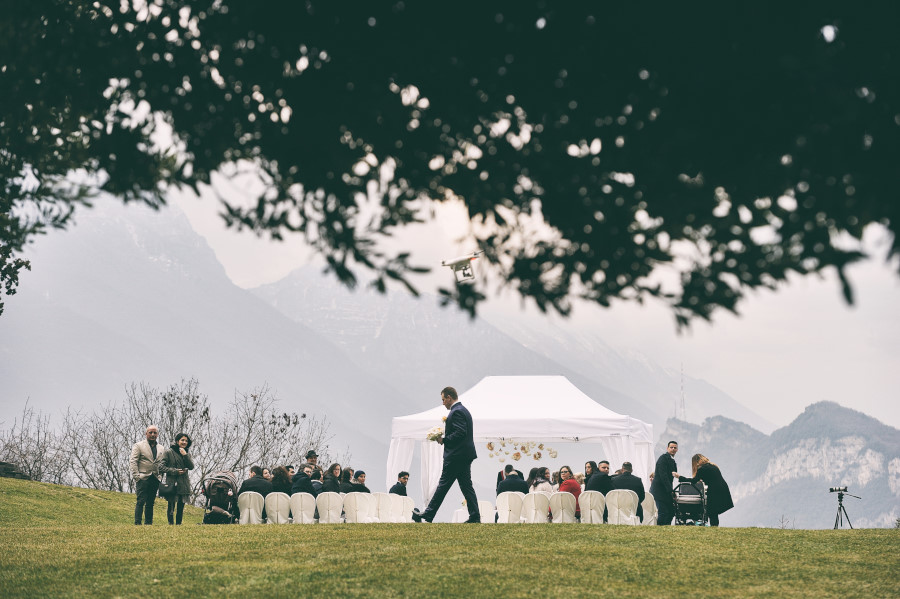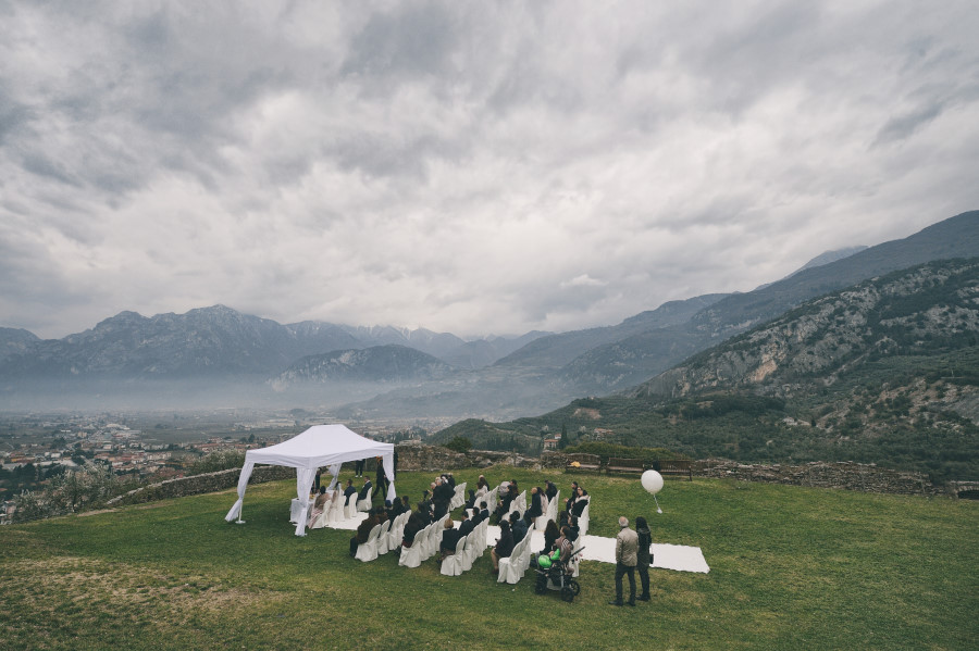 Il tempo è stato benevolo e ha permesso agli sposi di celebrare il loro matrimonio all’aperto, nella radura sottostante al Castello di Arco. Una Rolls Royce degli anni ’50 con un autista in ‘stile’ è passata a prendere la sposa al Lido Palace e l’ha accompagnata fino alla salita che porta al Castello di Arco, dove un’apecar ha portato sposi ed invitati fino alla rocca. Un vento freddo e un cielo nuvoloso hanno fatto da sfondo alla cerimonia. Forse gli invitati si sono un po’ infreddoliti, ma io come fotografo del matrimonio, ho approfittato per esaltare ancora di più l’atmosfera magica della location. Ho cercato di lavorare le foto attenuando i contrasti ed esaltando quei toni pastello dell’ambiente. Non ho potuto sfruttare tanto la ‘mia’ fotografia all’infrarosso in quanto questa particolare fotografia ha bisogno di sole per rendere al meglio.
