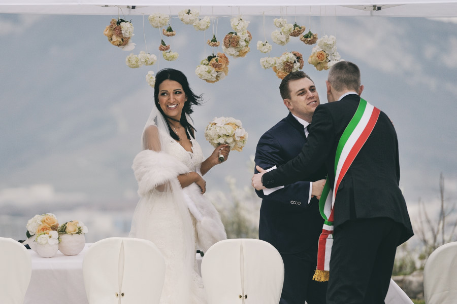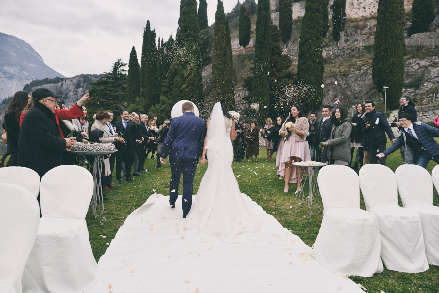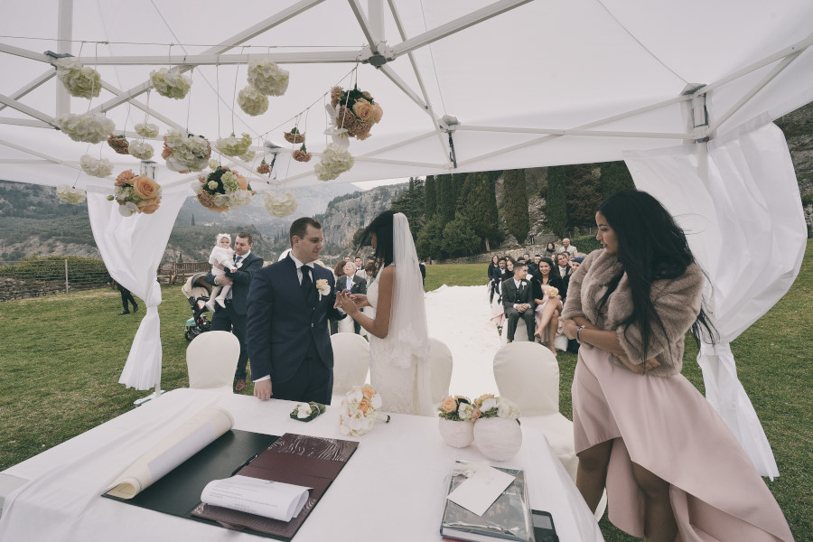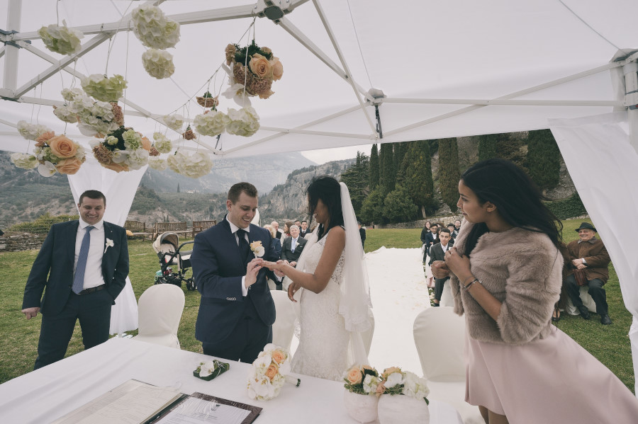 Per la preparazione la sposa, Fatima, ha scelto una delle suite del Lido Palace a Riva del Garda. Il tutto si è svolto in estrema serenità che ha rischiato di perdersi per le continue telefonate di Andrea, lo sposo, che sollecitava l’arrivo della sposa per paura della pioggia data per imminente. Il Castello di Arco è ubicato su una roccia che domina il Lago di Garda, ma non ha possibilità di alcun piano B, se piove ci si bagna. Questo è stato in assoluto il primo matrimonio che si svolgeva al Castello di Arco, magari in futuro verrano previste delle penso strutture a protezione, chissà. Quindi lo sposo non aveva tutti i torti.