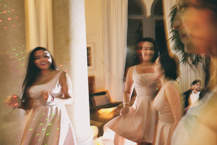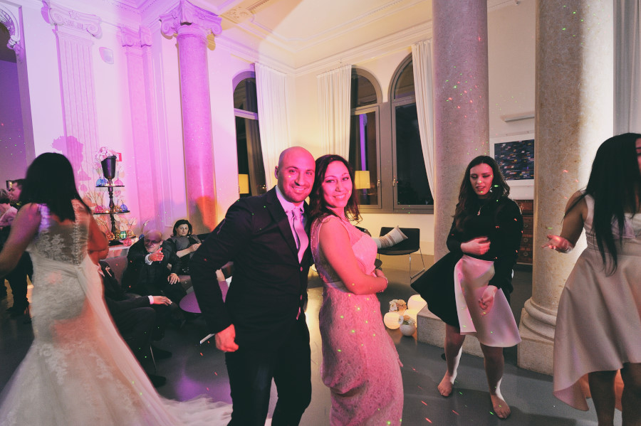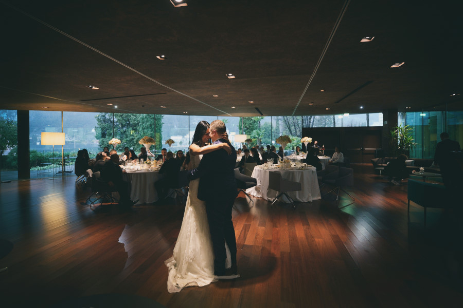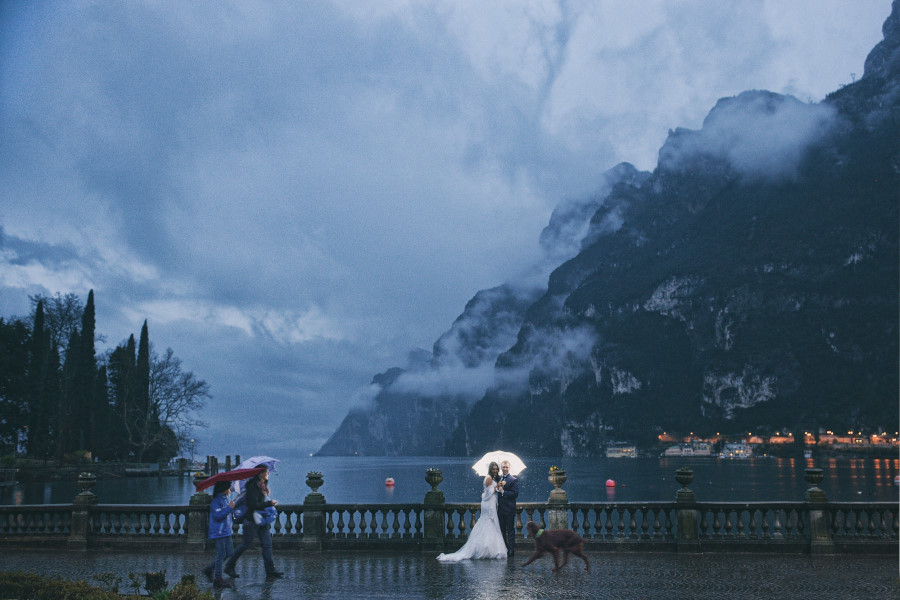 Dall’aperitivo al dolce il menù preparato dall’Executive Chef Giuseppe Sestito del Lido Palace è stato impeccabile a conferma della fama e del prestigio che tale hotel a Riva del Garda detiene da molti anni. La sala del Lido Palace dove si è svolta la cena del matrimonio era addobbata con eleganza e le ampie vetrate aprivano la vista sul lungo lago di Riva del Garda. Il primo ballo della coppia si è svolto sempre nella sala del ricevimento, sotto gli occhi degli invitati, poi i balli sono continuati in una sala adiacente la hall del Lido Palace. Con l’avvicinarsi dell’ora blu, quel particolare momento della giornata quando il sole è già tramontato, ma la notte non è ancora notte, ho chiesto agli sposi 10 minuti per fare altre fotografie lungo il Lago di Garda. Adoro come fotografo per la mia fotografia, l’ora blu. In questo caso sul Lago di Garda si era alzata una leggera nebbia, la pioggia non era così intesa, il cielo era diventato di un indaco scuro e si erano accese le gialle luci artificiali. Un leggero colpo di flash dietro agli sposi a rischiarare e congelare le gocce di pioggia. Una fotografia meno dinamica, ma un ritratto affascinante per le particolari cromie che queste condizioni atmosferiche riescono a creare. Un ritratto di coppia che però si sposa bene con il resto del lavoro, una fotografia un po’ più costruita, ma trattandosi di ritratto, non entra in contraddizione con lo stile reportage e foto giornalistico che caratterizza il mio essere fotografo e la mia fotografia di matrimonio.