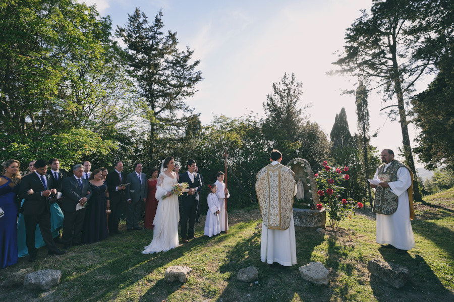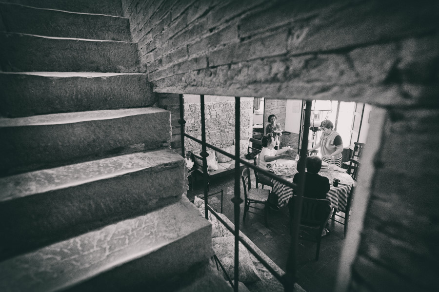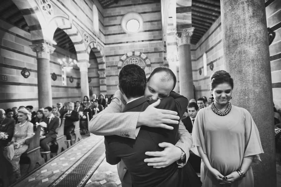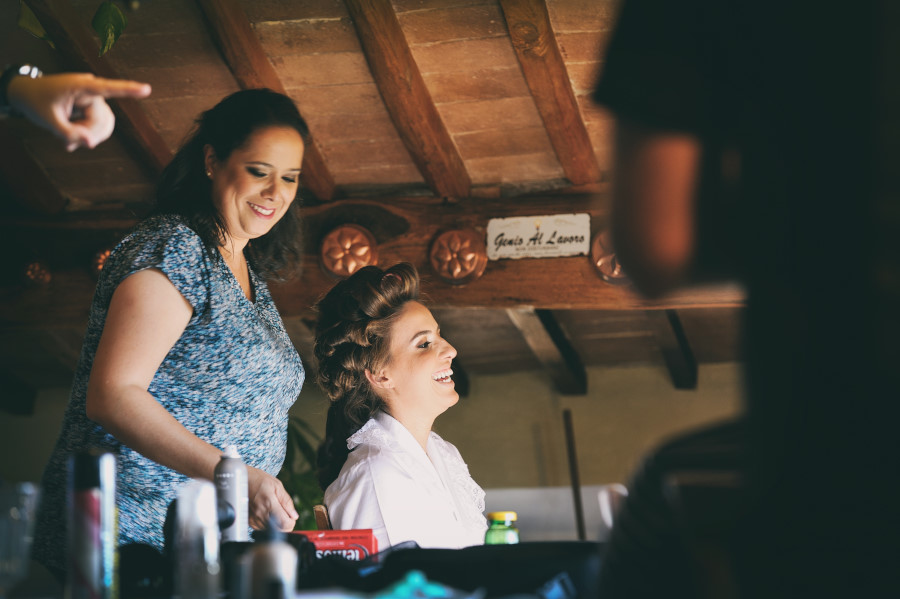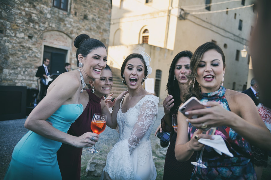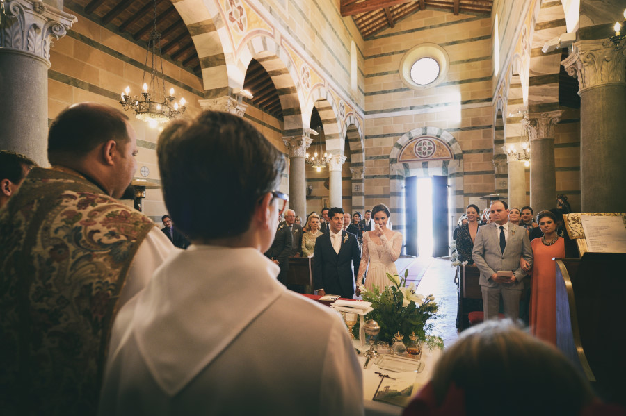 Patricia e Flavio, coppia brasiliana, hanno scelto la Tenuta di Casaglia, un bellissimo borgo medievale che domina su una verde vallata circondata dalle colline toscane non molto distante dal mare. La giornata è stata bellissima. Un caldo giusto di inizio estate e una leggera brezza a mitigare la temperatura. Molto bello per la coppia è stato anche vivere i preparativi, gli allestimenti dal fiorista al catering. Hanno visto nascere il loro matrimonio. Tutto è iniziato con la preparazione della sposa; un pranzo veloce e poi – anche se gli amici in queste occasioni dovrebbe astenersi e godersi il matrimonio – una carissima amica ha iniziato il trucco mentre un altro carissimo amico si occupava delle acconciature. Molta emozione tra gli amici e familiari. Risa e pianti si alternavano. Come fotografo sono stato continuamente sollecitato. Non c’erano pause. Non solo la sposa, ma le amiche, le mamme, il prete (anch’esso brasiliano) entravano a far parte del racconto in fotografia del loro matrimonio.