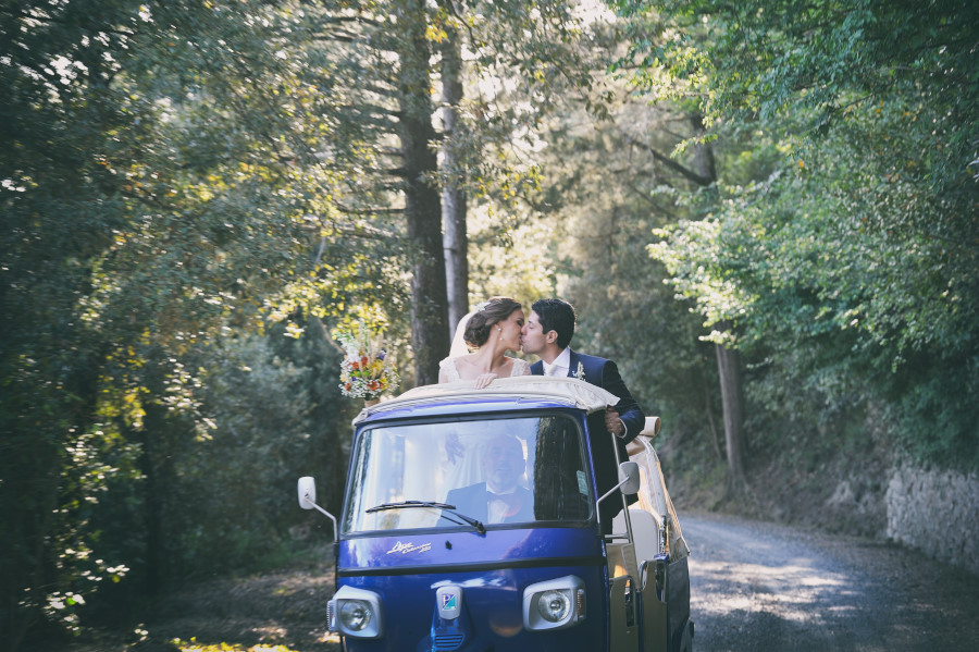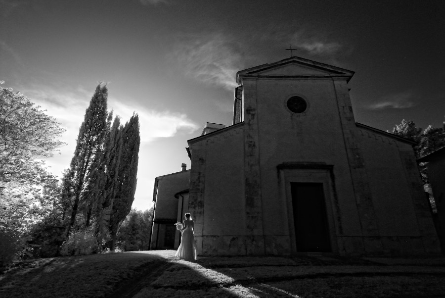 La cerimonia in chiesa è stata molto sentita, intima che ha coinvolto un po’ tutti con emozioni forti. Dopo il rito del matrimonio tutti gli invitati insieme agli sposi sono andati a rendere omaggio a una statua della Madonna a pochi passi dalla chiesa. Poi gli sposi hanno preso una simpatica apecar e sono andati a fare un piccolo giro per le strade della Tenuta di Casaglia. Io di corsa dietro loro per cogliere in fotografia dei momenti, degli attimi in assoluta spontaneità, in quello stile reportage che contraddistingue la mia visione di fotografo di matrimonio. La Tenuta di Casaglia è immersa nel verde e quindi ho potuto utilizzare anche la ‘mia’ fotografia infrarosso che ha creato delle atmosfere magiche ed oniriche.