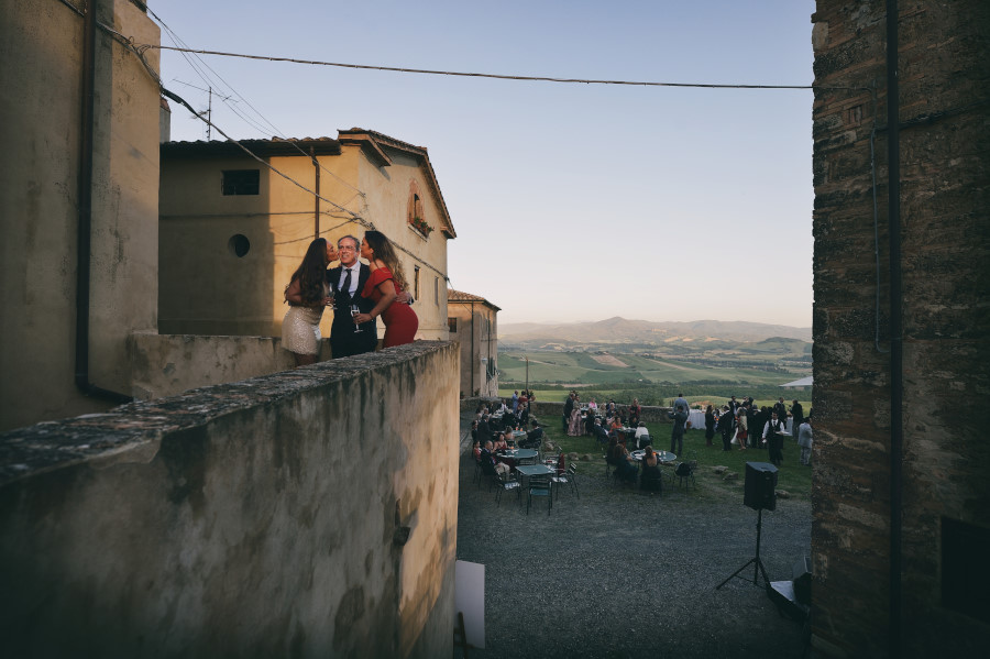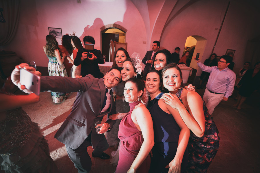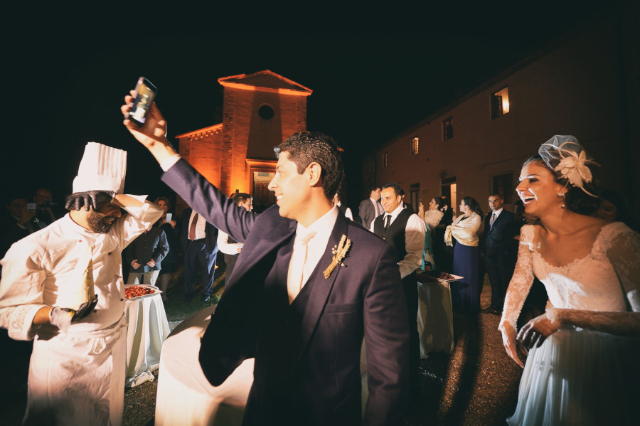 Dopo qualche fotografia formale con i genitori e gli amici gli sposi hanno aperto l’aperitivo con un primo ballo coinvolgendo poi i genitori e gli amici. L’atmosfera era molto informale. Gli ospiti si sono goduti l’ambiente della Tenuta di Casaglia bevendo spritz, mangiando degli ottimi salumi e formaggi della Toscana. Non potevano mancare i selfies con gli amici da condividere sui social in tempo reale.