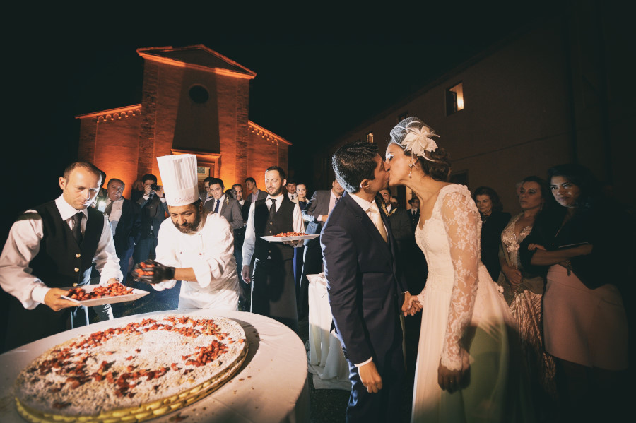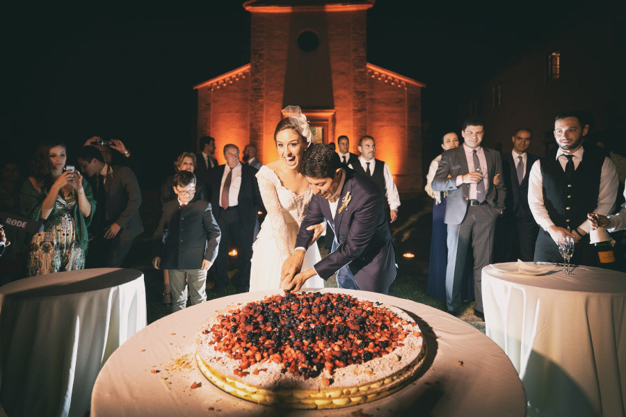 La torta nuziale è stata fatta davanti agli sposi e agli ospiti. Un taglio veloce e poi tutti nelle sale interne della Tenuta di Casaglia con il dj già pronto per far ballare tutti gli invitati.