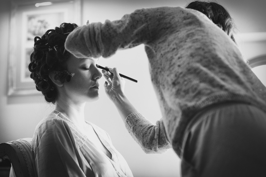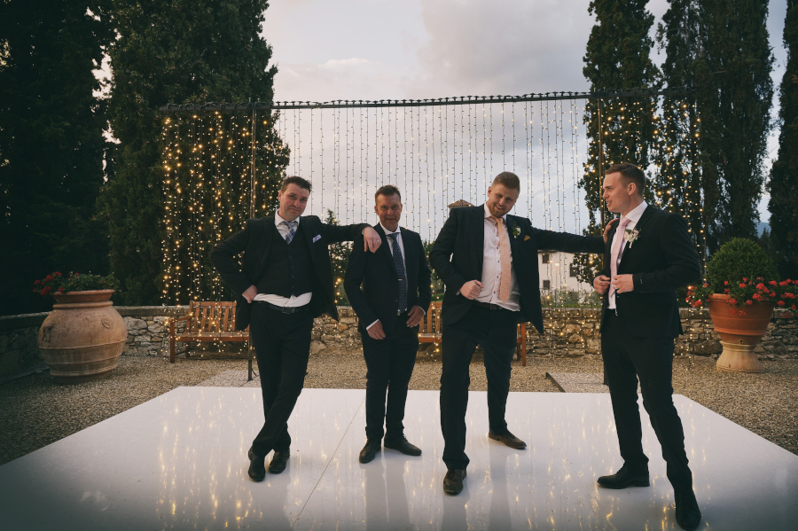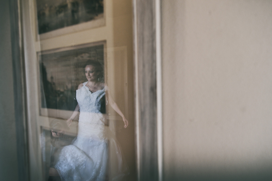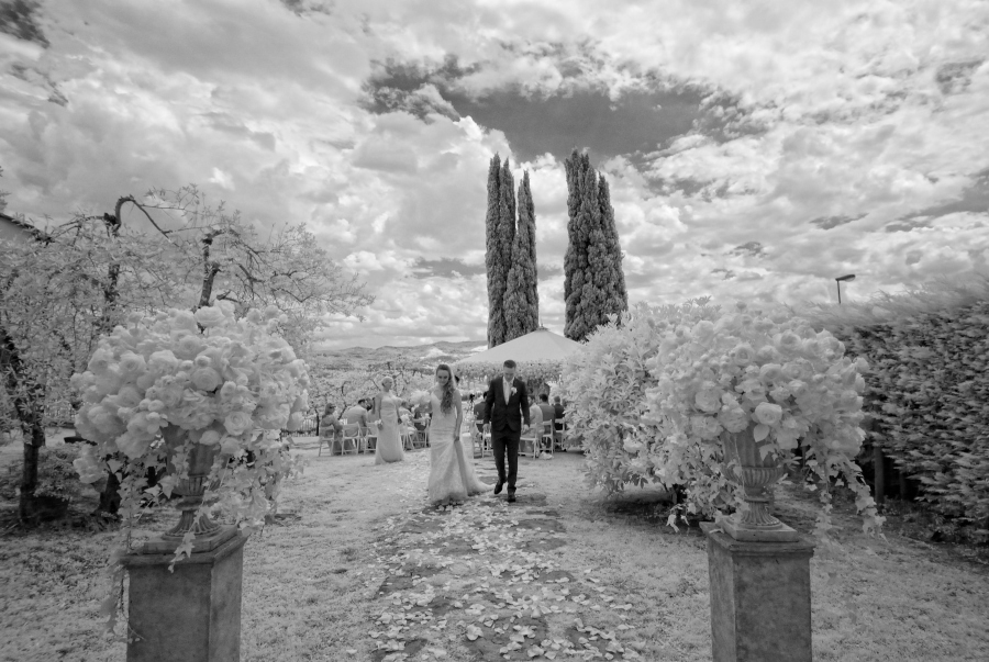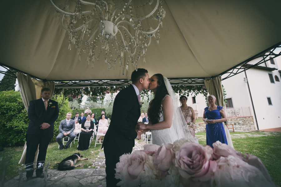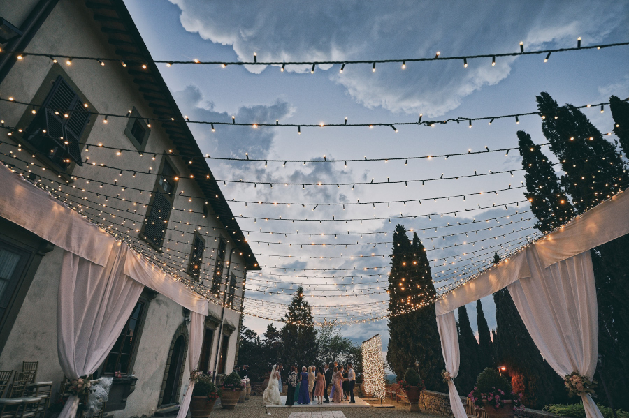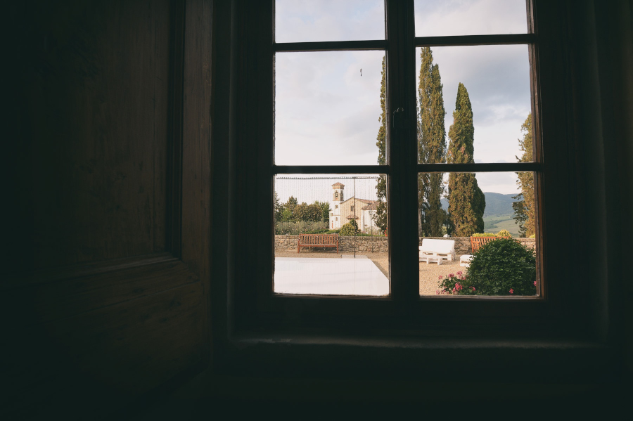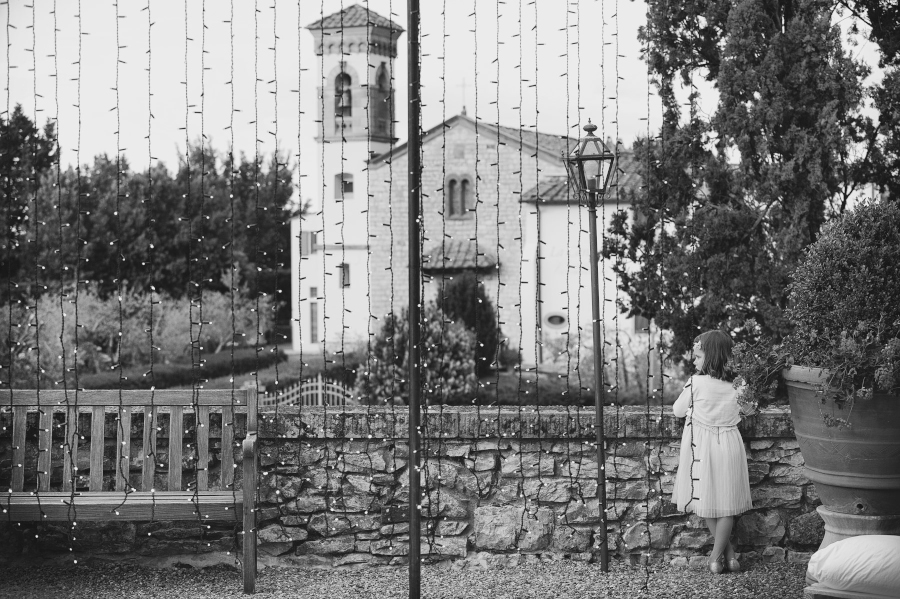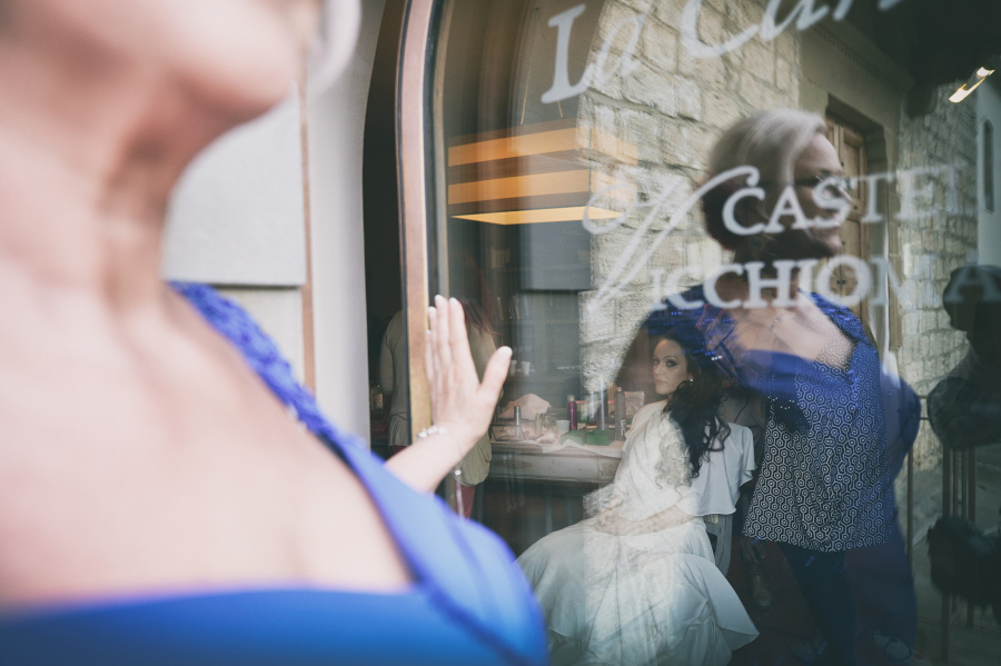 Il matrimonio si è svolto nel Castello di Vicchiomaggio, una location immersa tra i vigneti di Sangiovese, la base del vino Chianti, a pochi chilometri da Firenze. Tutto si è svolto nel Castello di Vicchiomaggio, dalla preparazione della sposa alla cerimonia e al ricevimento. Adoro quando tutto si svolge nello stesso luogo. Sia gli sposi che gli invitati sono molto più tranquilli e anche la Fotografia (e il Fotografo 😉 ) ne trae giovamento. Non si deve rincorrere il tempo e possiamo sfruttare al meglio i diversi cambiamenti di luce. Da una fotografia di interno della preparazione con una luce più violenta delle prime ore del pomeriggio ma adatta allo scopo a quella più morbida del tramonto fino all’ora blu e al dopocena con luce artificiale. Tutte situazioni che come fotografo ho potuto gestire insieme agli sposi.