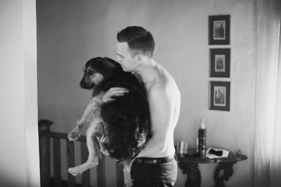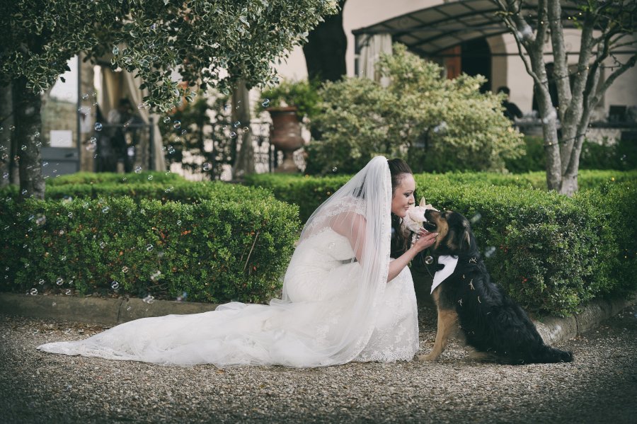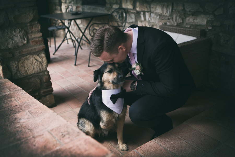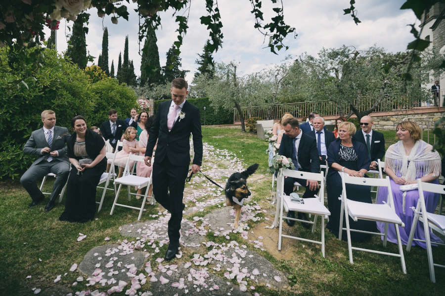 La prima cosa che mi ha detto la sposa prima ancora del buongiorno è stata: ‘Mi raccomando il nostro cane è uno degli invitati più importanti. Fagli molte fotografie.‘ Il loro ‘bastardino’ aveva perduto una gamba e camminava quindi con un po’ di difficoltà. Fin da subito mi ha fatto una tenerezza infinita. Lo sposo è entrato con lui al suo fianco.