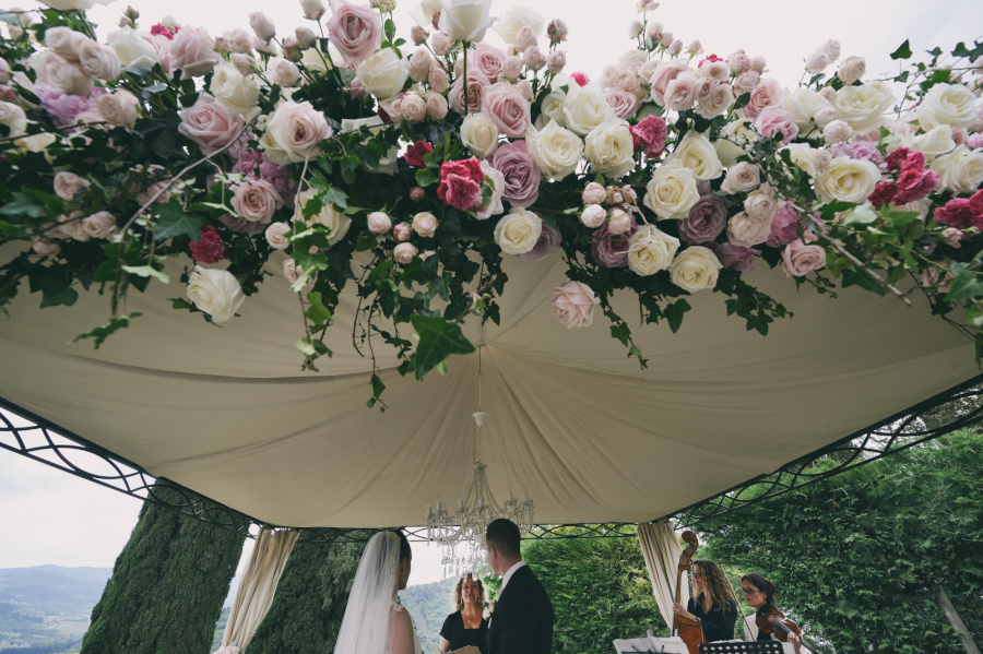 La cerimonia del matrimonio si è svolta in esterni, sotto un gazebo, magistralmente decorato dalla professionalità e fantasia di Simona di Floralia. Jo Bertolino, il cerimoniere, ha saputo con le sue parole e i suoi gesti, far emozionare gli sposi.