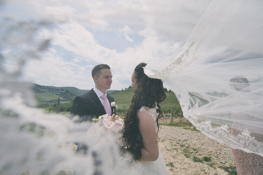 Venendo dalla lontana Svezia, dopo la cerimonia di nozze, gli sposi hanno voluto qualche foto di coppia tra le vigne e con dietro il bellissimo panorama della Toscana che circonda il Castello di Vicchiomaggio. Una fotografia comunque spontanea senza pose per cercare di cogliere momenti naturali, sorrisi ed abbracci veri.
