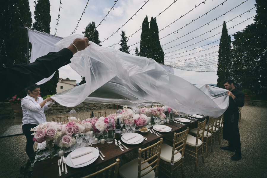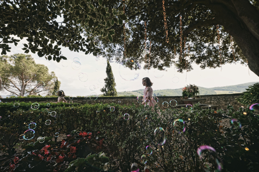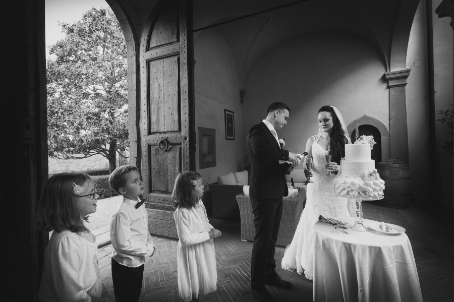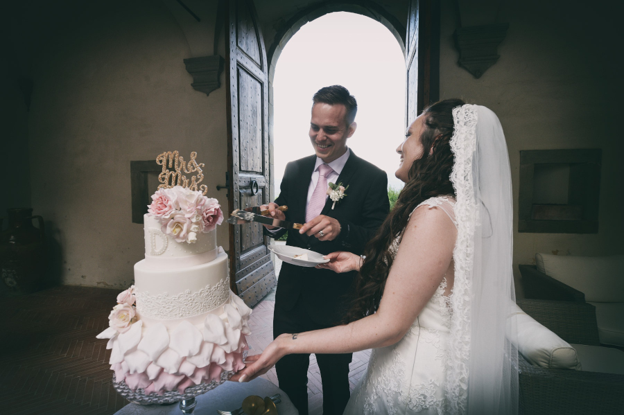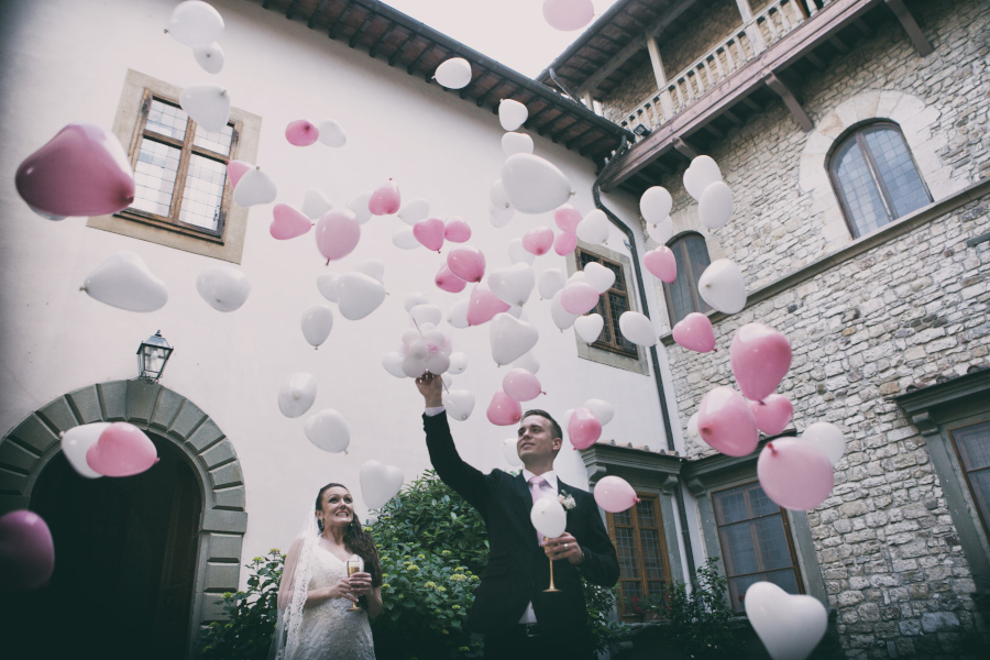 Il tempo atmosferico non prometteva niente di buono e gli sposi si sono assunti la responsabilità di apparecchiare comunque in giardino all’aperto. Devo dire che sono stati fortunati e, dopo un breve accenno di pioggia che ha fatto pensare al peggio, si sono potuti godere il loro matrimonio nella terrazza addobbata in maniera divina. Taglio della torta – realizzata all’americana, bellissima e anche buona – nel chiostro del Castello di Vicchiomaggio con lancio di palloncini colorati.
