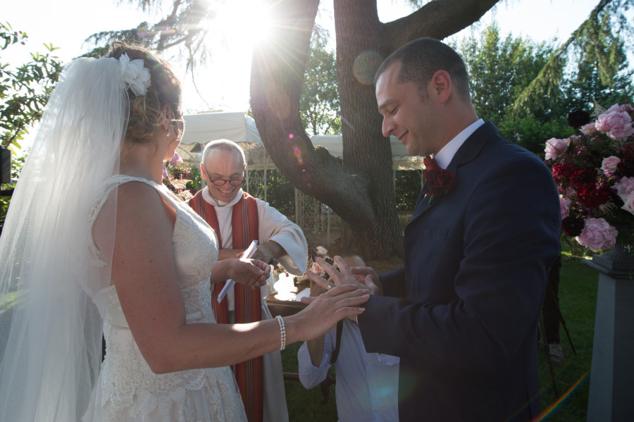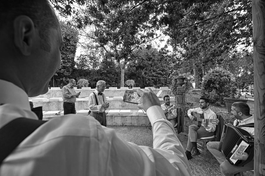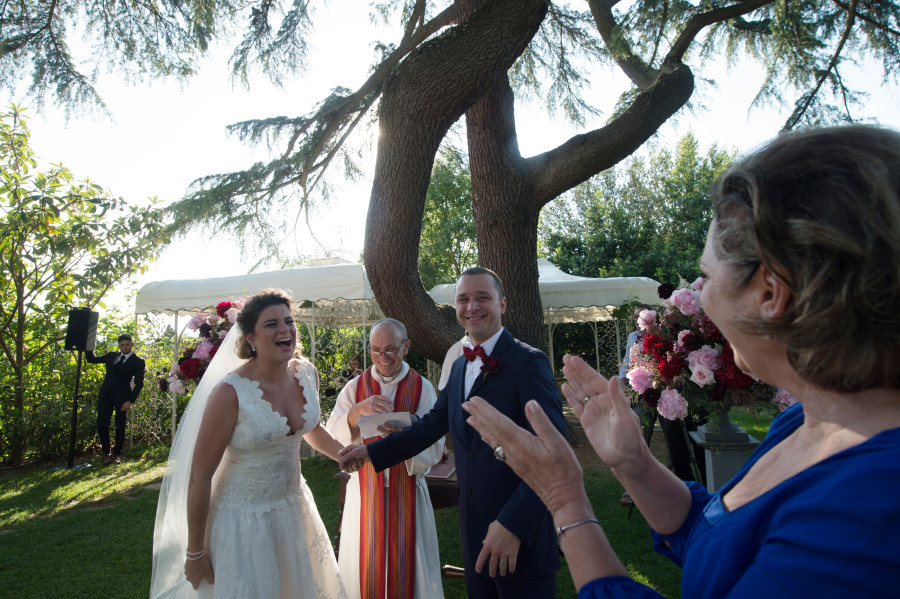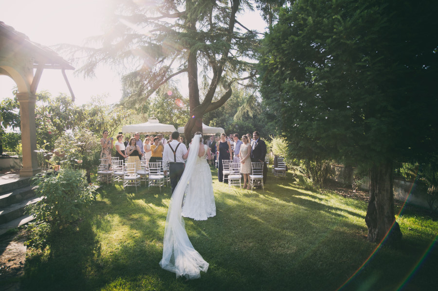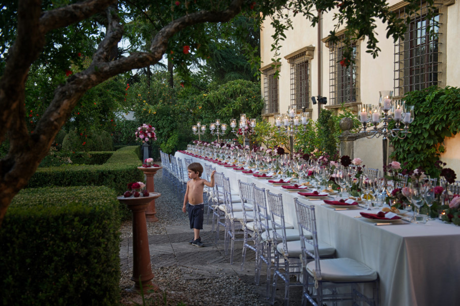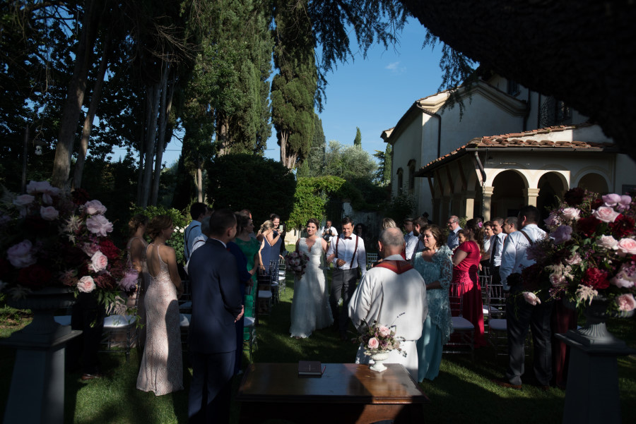 Altro momento di forte emozione si è percepito durante la cerimonia di nozze nel giardino di Villa Le Piazzole poco prima dello scambio degli anelli. Poi la serata è stata una tranquilla festa accompagnata da vecchie canzoni della tradizione italiana suonate da un gruppo folk e da un tenore toscano.