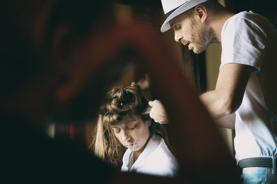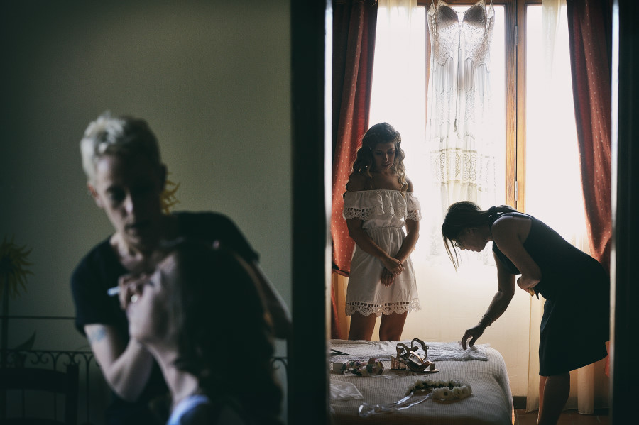 Un matrimonio ebraico che è iniziato la mattina presto con la preparazione della sposa, delle amiche e dello sposo. Come base del trucco e parrucco si è sfruttato una delle case coloniche ristrutturate che fanno parte del Podere Poggitazzi, dove poi hanno anche soggiornato sia gli sposi che tutti gli invitati.