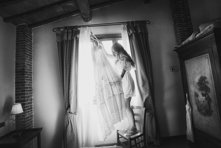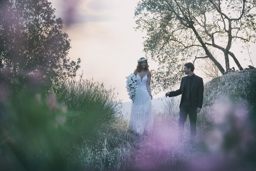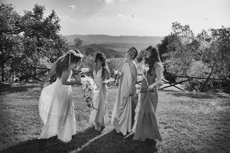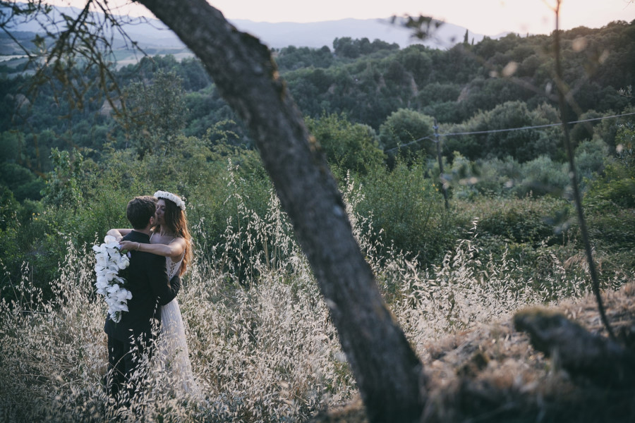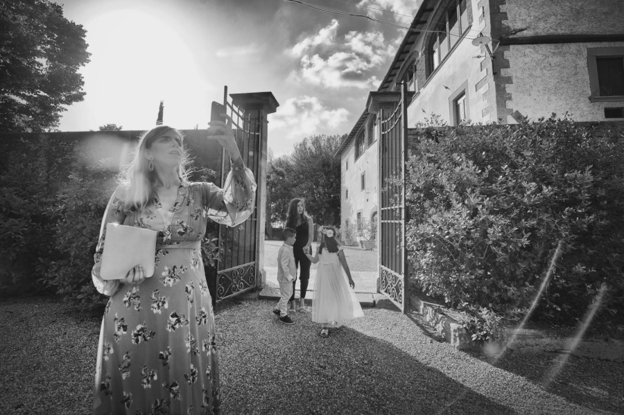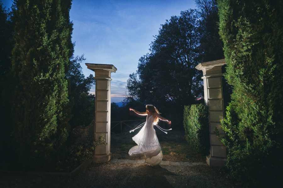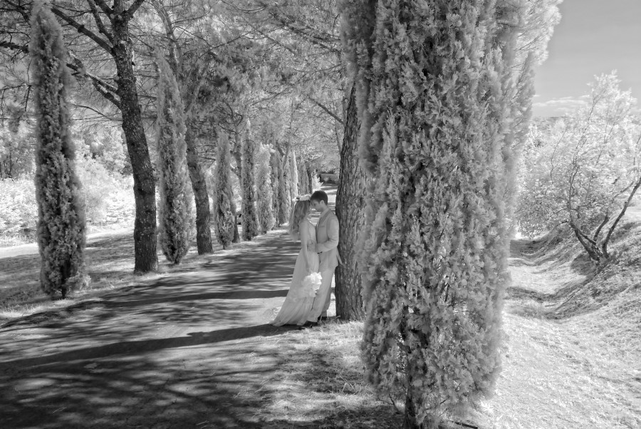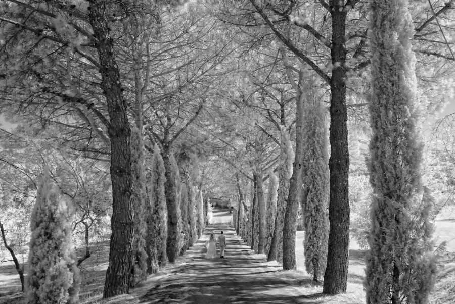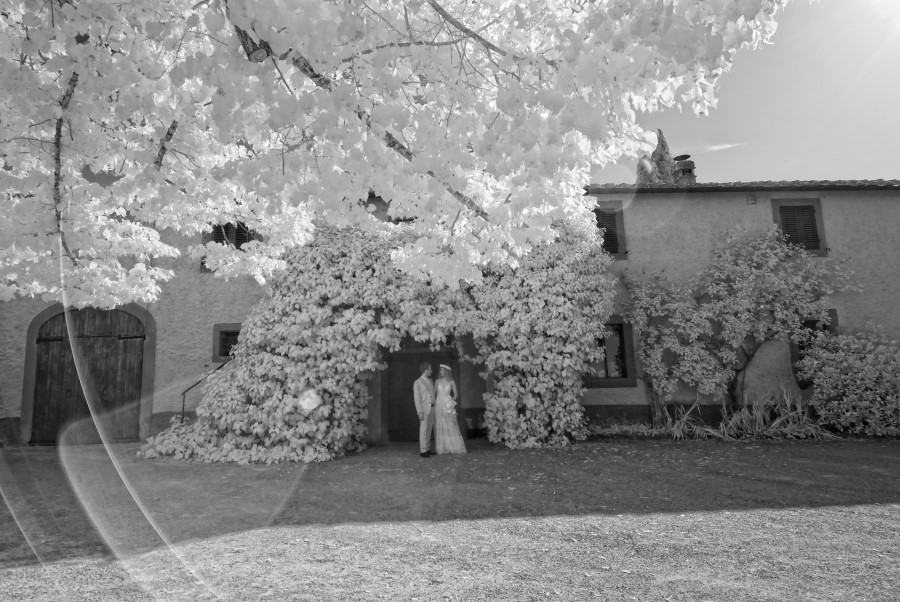 Per la fotografia di coppia ho deciso di aspettare la luce calda del tramonto, mentre ho sfruttato la fotografia all’infrarosso quando invece il sole era più alto e favoriva meglio la sintesi clorofilliana. Abbiamo speso circa 15 minuti di fotografia spontanea in cui gli sposi si sono spostati all’interno del podere Poggitazzi. Come fotografo del matrimonio ho cercato di sfruttare il controluce visto che il sole tramontava proprio sulla valle in fronte alla villa. Per il resto della giornata ho sempre lavorato nel mio stile reportagistico cercando di cogliere degli attimi e dei momenti.  Mi sono mosso sempre in modo molto discreto senza intervenire sulla scena in modo da cogliere delle emozioni vere e spontanee sia degli sposi che degli invitati.