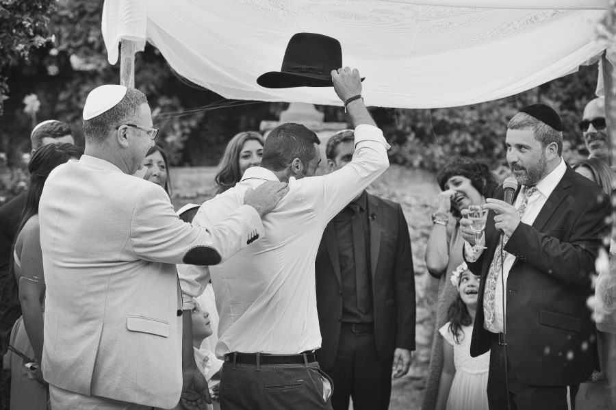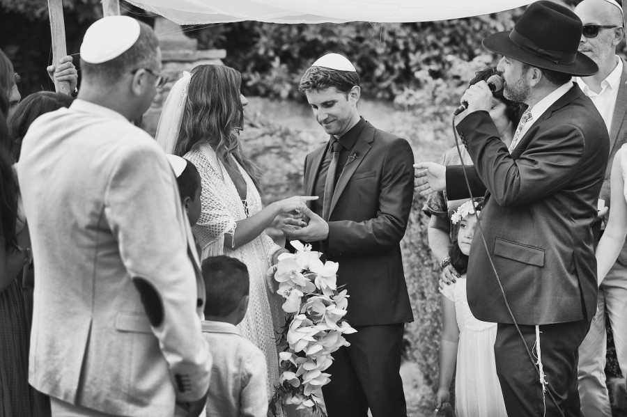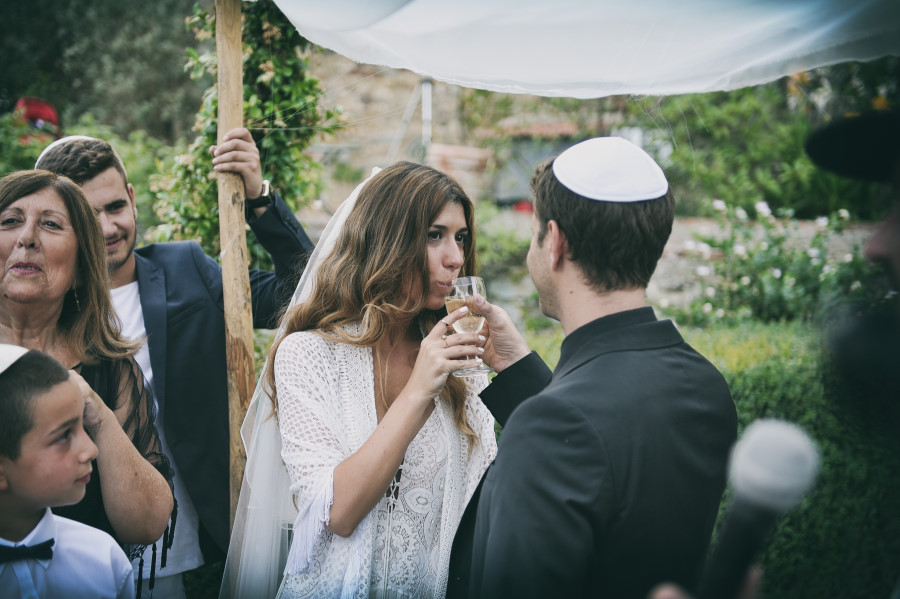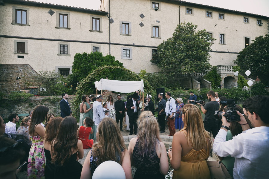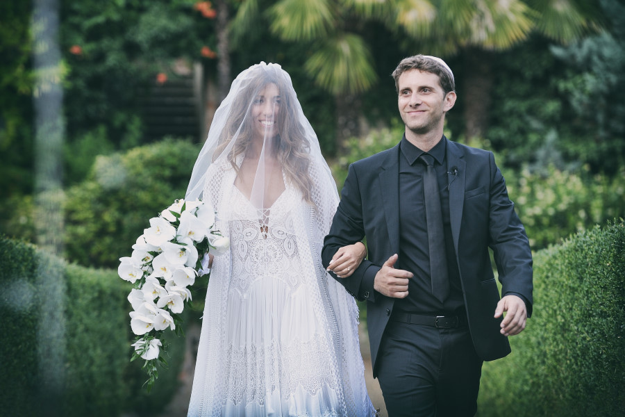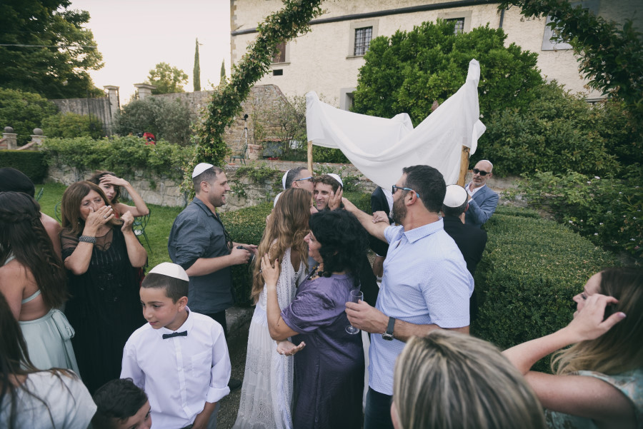 La cerimonia del matrimonio ebraico si è svolta nel giardino all’italiana nel retro del copro centrale della Villa Poggitazzi. Il rabbino veniva direttamente da Tel Aviv. La kuppah, a differenza di altri matrimoni ebraici, non è stata decorata con fiori ma è stata lasciata pulita sorretta ai quattro lato dai testimoni dello sposo. Tutti si sono molto emozionati, anche i bambini hanno sentito forte questo momento. Il bicchiere, come da tradizione, a fine cerimonia è stato rotto al primo colpo, benaugurante per il futuro della coppia.