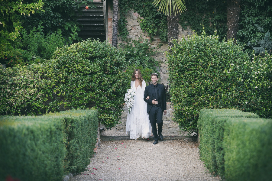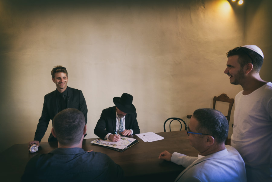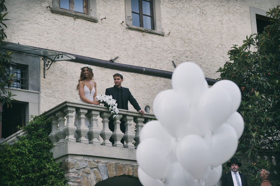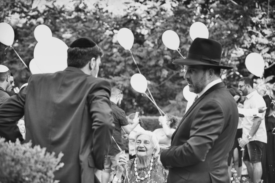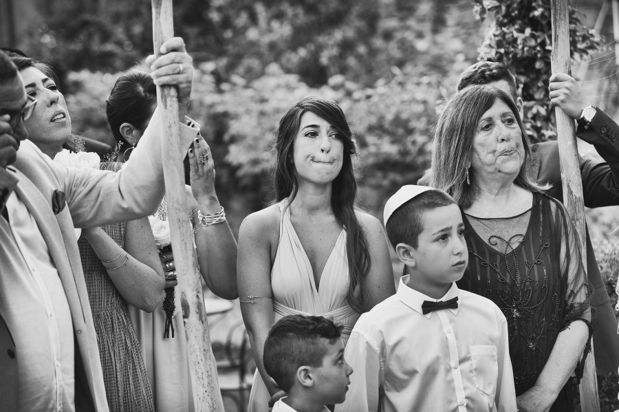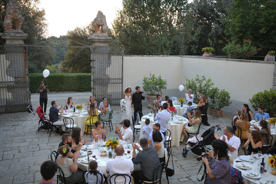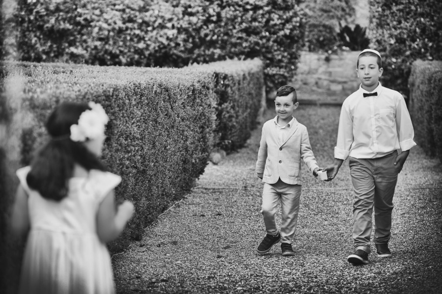 La cerimonia del matrimonio ebraico si è svolta nel giardino all’italiana nel retro del copro centrale della Villa Poggitazzi. Il rabbino veniva direttamente da Tel Aviv. La kuppah, a differenza di altri matrimoni ebraici, non è stata decorata con fiori ma è stata lasciata pulita sorretta ai quattro lato dai testimoni dello sposo. Tutti si sono molto emozionati, anche i bambini hanno sentito forte questo momento. Il bicchiere, come da tradizione, a fine cerimonia è stato rotto al primo colpo, benaugurante per il futuro della coppia.