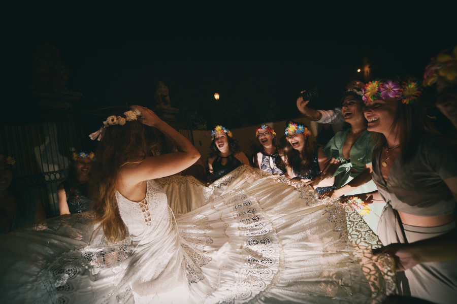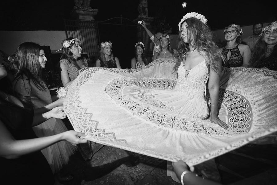 Tutto il matrimonio è stato molto bello, carico di energia complice anche l’innata voglia di divertirsi degli ebrei. In particolare mi ha colpito il vestito delle sposa, fuori dai canoni dell’abito classico, molto morbido con delle maliziose trasparenze. Appeso mi aveva lasciato con qualche perplessità ma una volta indossato – non è certamente adatto a tutte le spose – si è rivelato come uno dei vestiti da sposa più particolari almeno di quest’anno. Trucco e capelli sono stati fatti proprio per esaltare l’abito in pieno stile boho-chic, ormai di tendenza da alcuni anni. Forse il bouquet è un po’ troppo ‘impegnativo’, avrei preferito qualcosa di meno formale, ma è solo una mia opinione.