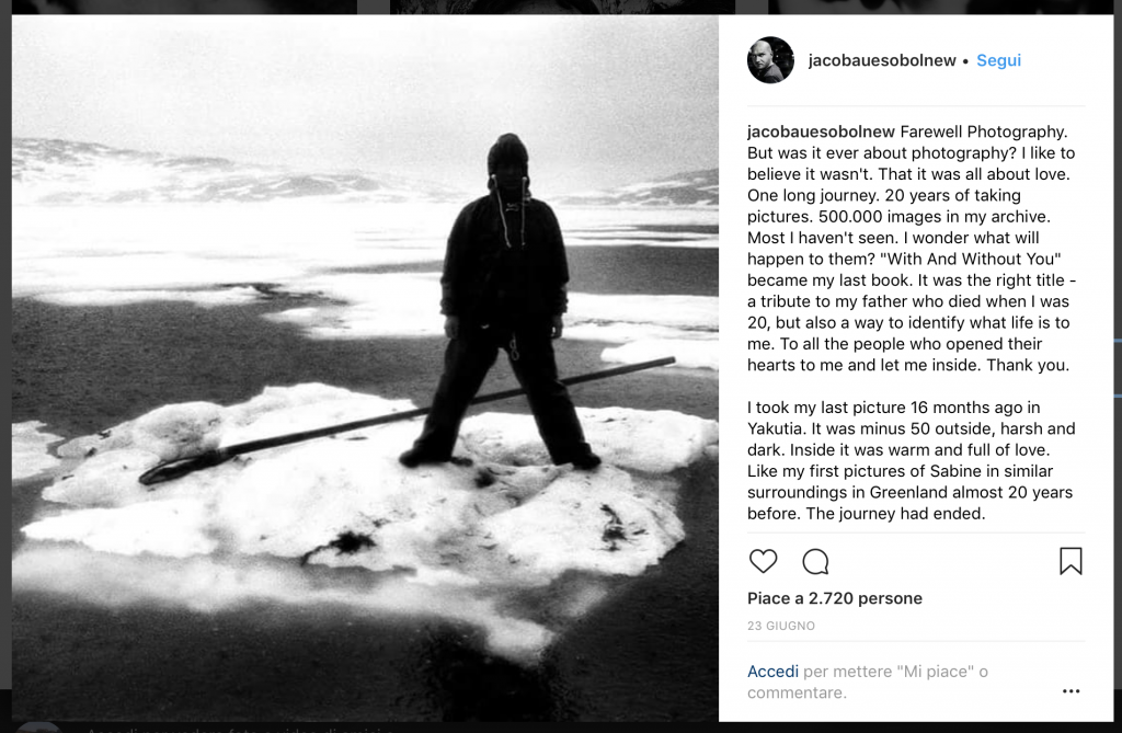Le parole che ha scritto sulla sua pagina Instagram mi hanno fatto piangere, si legge tutta la disperazione di un Uomo che non riesce più con la Fotografia a salvare se stesso. Forse le stesse ansie e paure con cui si confrontavano la Woodman o la Arbus. Jacob però, grazie all’amore della sua famiglia, quell’amore che non riusciva più a tirare fuori dai suoi scatti, ha voluto combattere quella brutta bestia che lo stava portando all’inferno e ha trovato nel silenzio del mare una nuova vita.